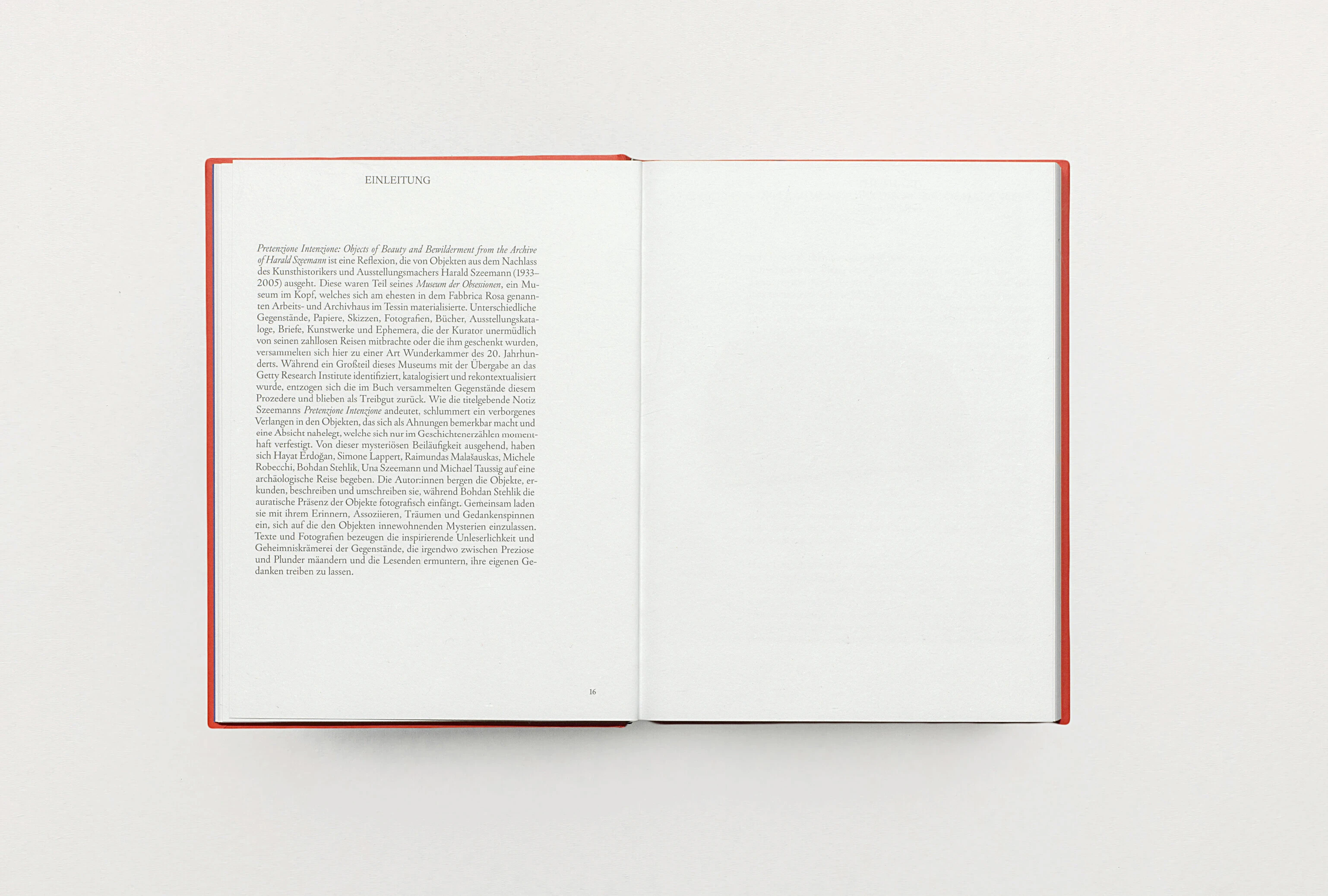 Pretenzione Intenzione – l'expression qui a donné son titre à ce projet provient d'une des notes manuscrites de Szeemann –, un désir sommeille dans les objets, qui se fait sentir intuitivement et laisse entrevoir un but qui n'atteint qu'une concrétisation éphémère dans le récit d'histoires. À partir de ce mystère, Hayat Erdoğan, Simone Lappert,