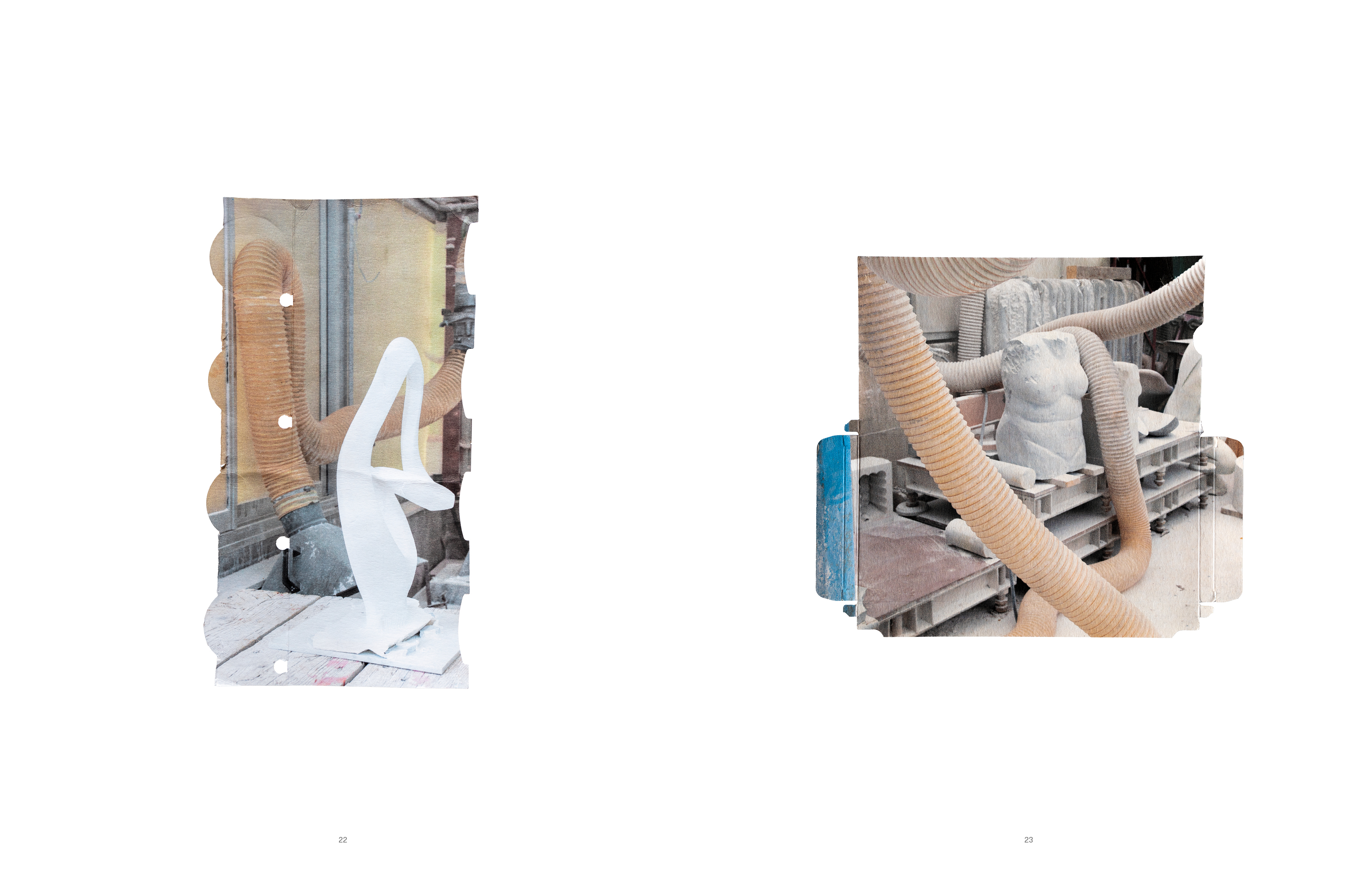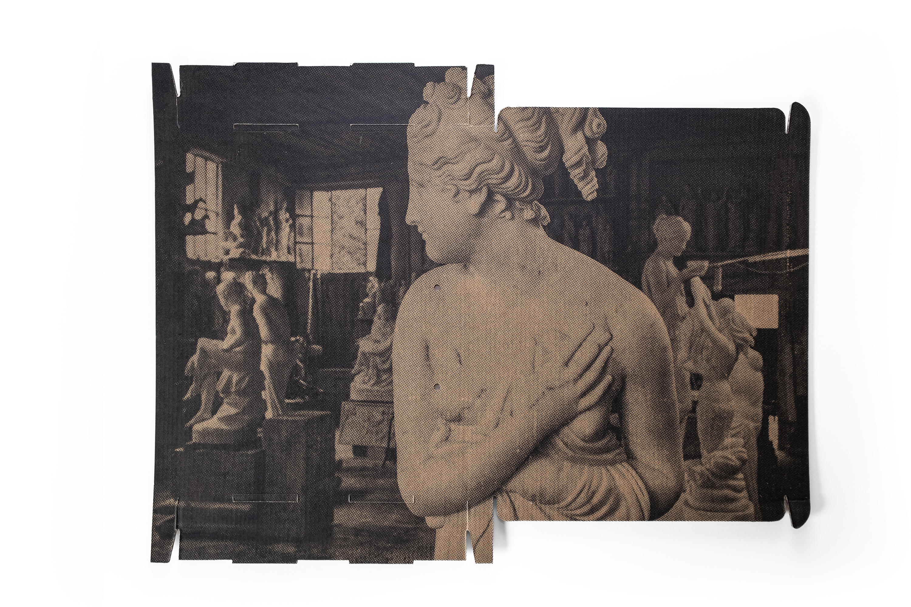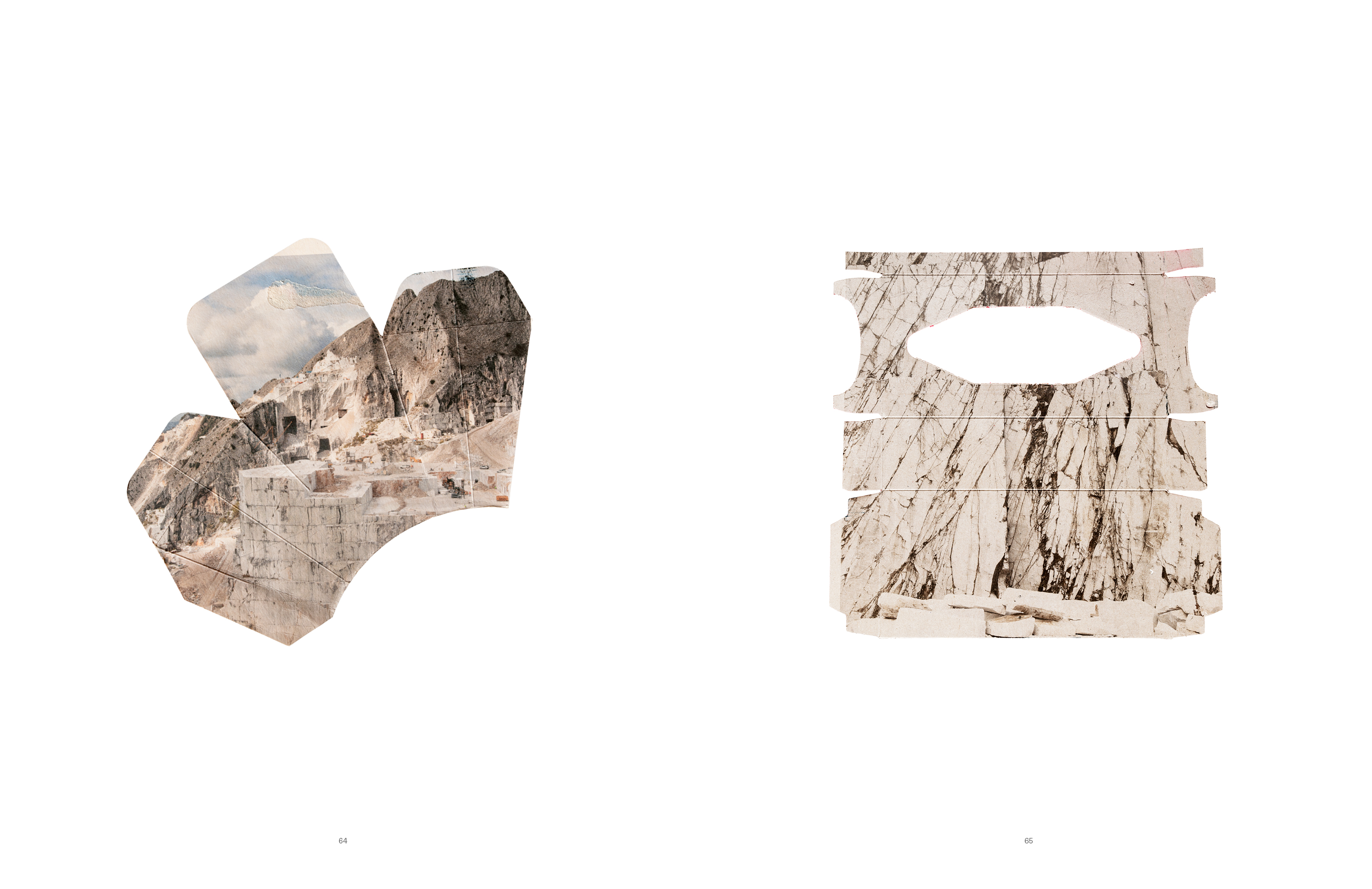 Hélène Bellenger a constitué une collection de produits de consommation contenant du carbonate de calcium, qu'elle utilise pour imprimer directement sur le verso des cartons d'emballage. L'imaginaire luxueux et impérial de la statuaire de marbre se trouve ainsi reproduit en image sur de petits emballages, côtoyant une sélection de paysages, façonnés au fil des siècles par l'exploitation intensive du marbre de Carrare. Précieuses et uniques, tout en étant éphémères et jetables, ces images – dont la forme varie selon les produits – composent une typologie de formes industrielles, interrogeant leur matérialité et leur inscription dans le flux consumériste.