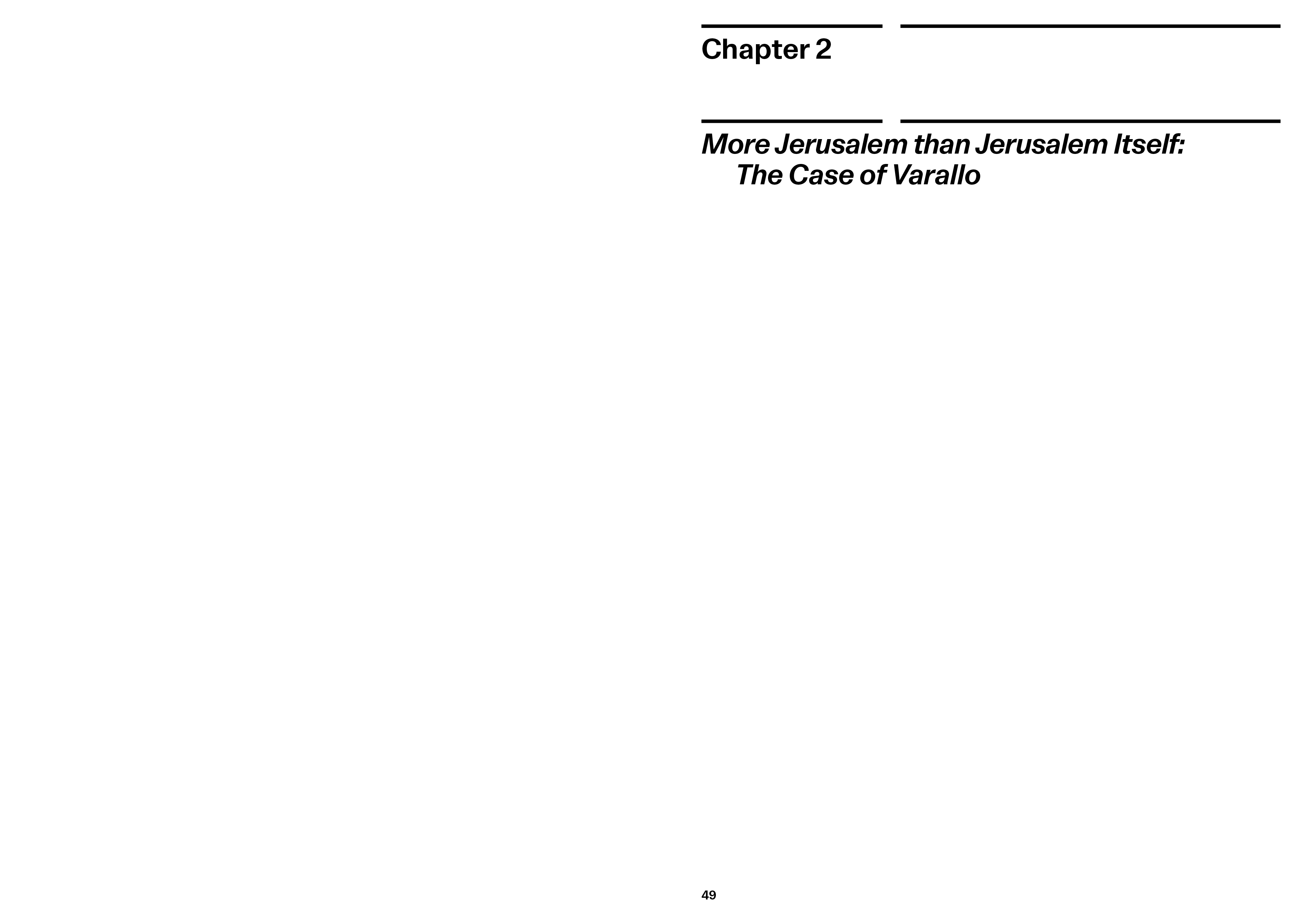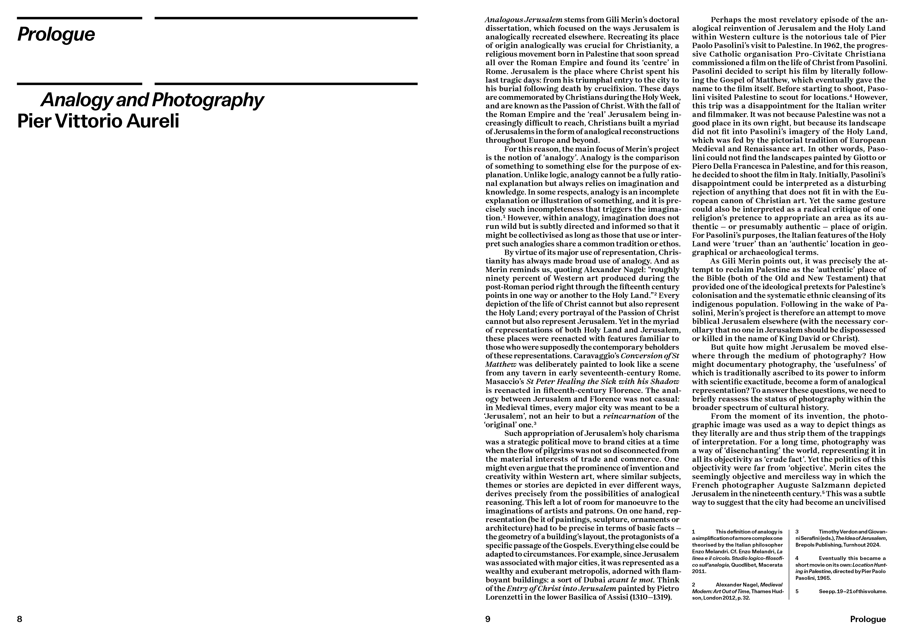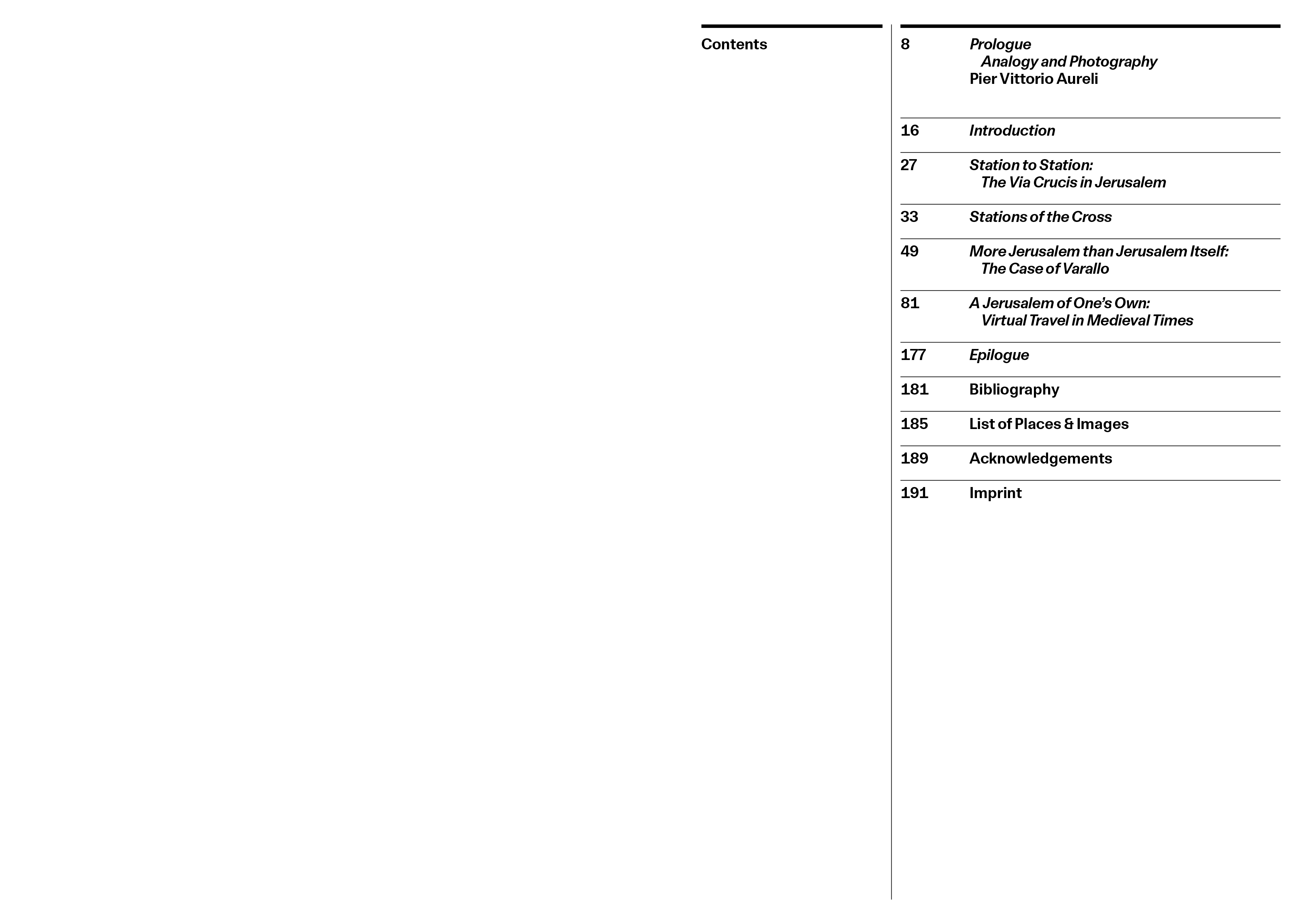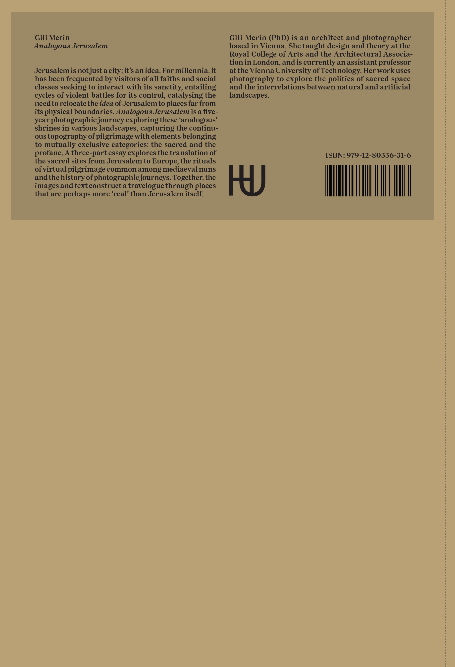 Jérusalem n'est pas seulement une ville, c'est une idée. Depuis des millénaires, elle est fréquentée par des visiteurs de toutes confessions et de toutes classes sociales qui cherchent à interagir avec son caractère sacré, ce qui a entraîné des cycles de conflits violents pour son contrôle, suscitant la tentation de relocaliser l'idée de Jérusalem dans des lieux éloignés de ses frontières physiques. Analogous Jerusalem est un voyage photographique de cinq ans qui explore ces sanctuaires « analogues » dans différents paysages, capturant la topographie continue du pèlerinage avec des éléments appartenant à des catégories mutuellement exclusives : le sacré et le profane. Un essai en trois parties explore la traduction des sites sacrés de Jérusalem à l'Europe, les rituels de pèlerinage virtuel communs aux nonnes médiévales et l'histoire des voyages photographiques. Ensemble, les images et le texte construisent un carnet de voyage à travers des lieux qui sont peut-être plus « réels » que Jérusalem elle-même.