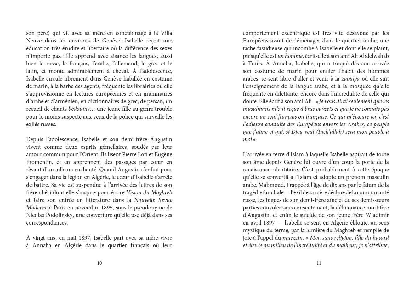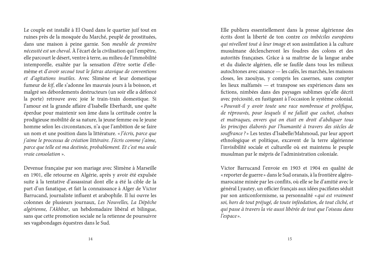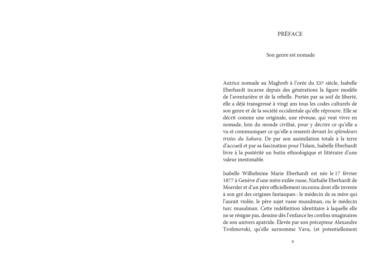 Autrice nomade au Maghreb à l'orée du XXe siècle, Isabelle Eberhardt, d'origine russe et née à Genève en 1877, incarne la figure modèle de l'aventurière et de la rebelle. Portée par sa soif de liberté, elle a déjà transgressé à vingt ans tous les codes culturels de son genre et de la société occidentale qu'elle réprouve. Elle vagabonde dans le désert habillée en homme et se fait nommer Mahmoud Saadi tout en jouant avec sa double identité. Elle se décrit comme une originale, une rêveuse, qui veut vivre en nomade, loin du monde civilisé, pour y décrire ce qu'elle a vu et communiquer ce qu'elle a ressenti dans le désert du Sahara. De par son assimilation totale à la terre d'accueil, Isabelle Eberhardt livre à la postérité un butin ethnologique et littéraire d'une valeur inestimable.