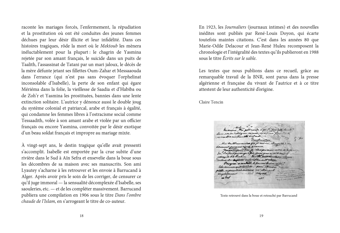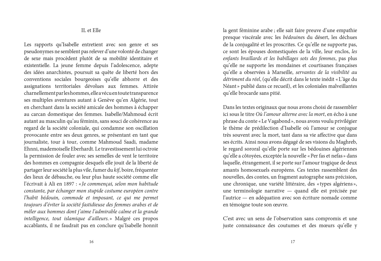 Cette sélection de textes originaux ou inédits d'Isabelle Eberhardt privilégie le thème de prédilection de l'autrice qui lie l'amour à la mort, tant dans sa vie que dans son œuvre. Elle révèle le regard sororal qu'elle porte sur les bédouines algériennes qu'elle a côtoyées, doublement victimes du patriarcat colonial et musulman. C'est avec un sens de l'observation sans compromis et une juste connaissance des coutumes et des mœurs qu'elle y raconte les mariages forcés, l'enfermement, la répudiation et la prostitution où ont été conduites des jeunes femmes déchues par leur désir illicite et leur infidélité. Dans ces histoires tragiques rôde la mort où le destin les mènera inéluctablement.