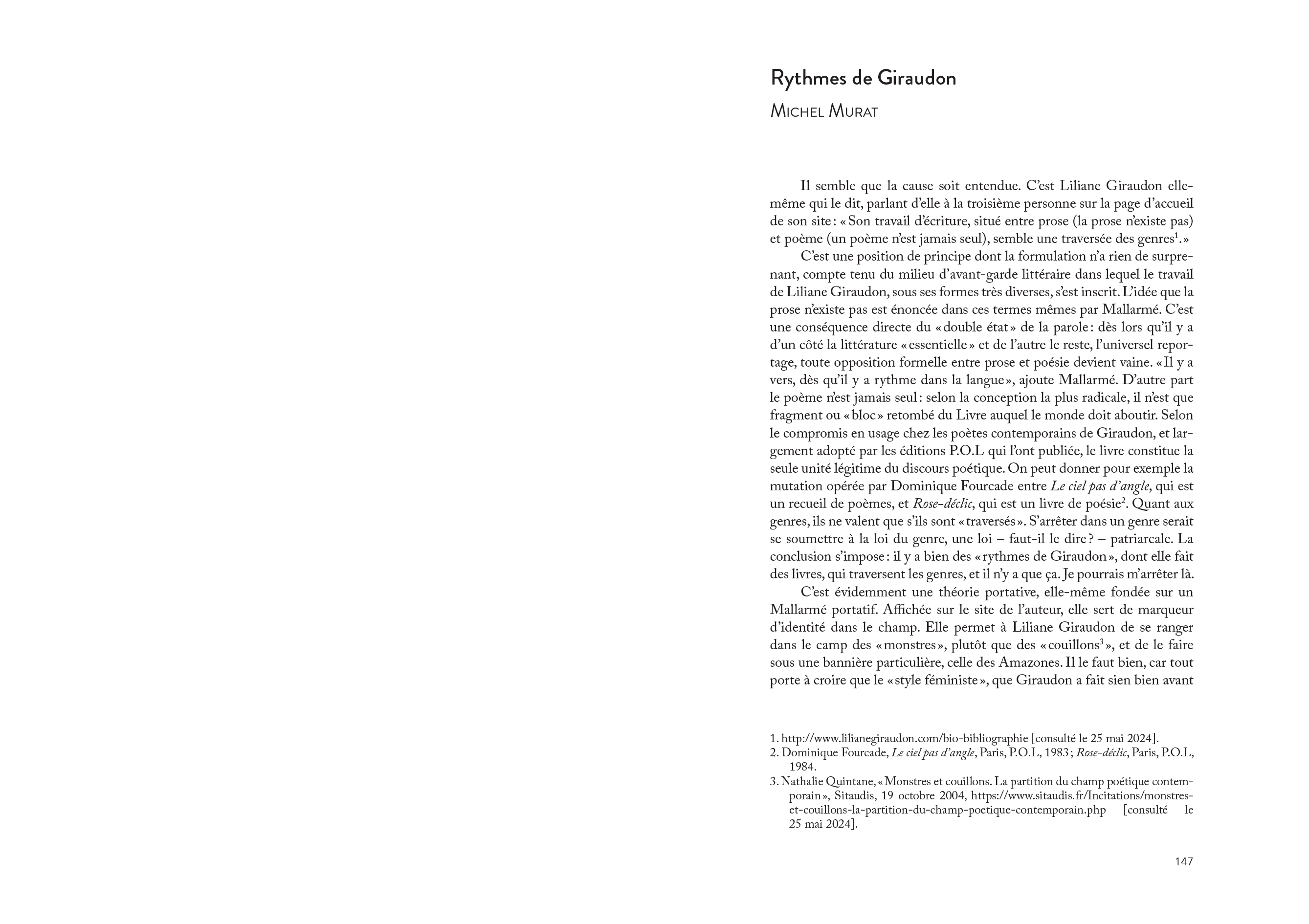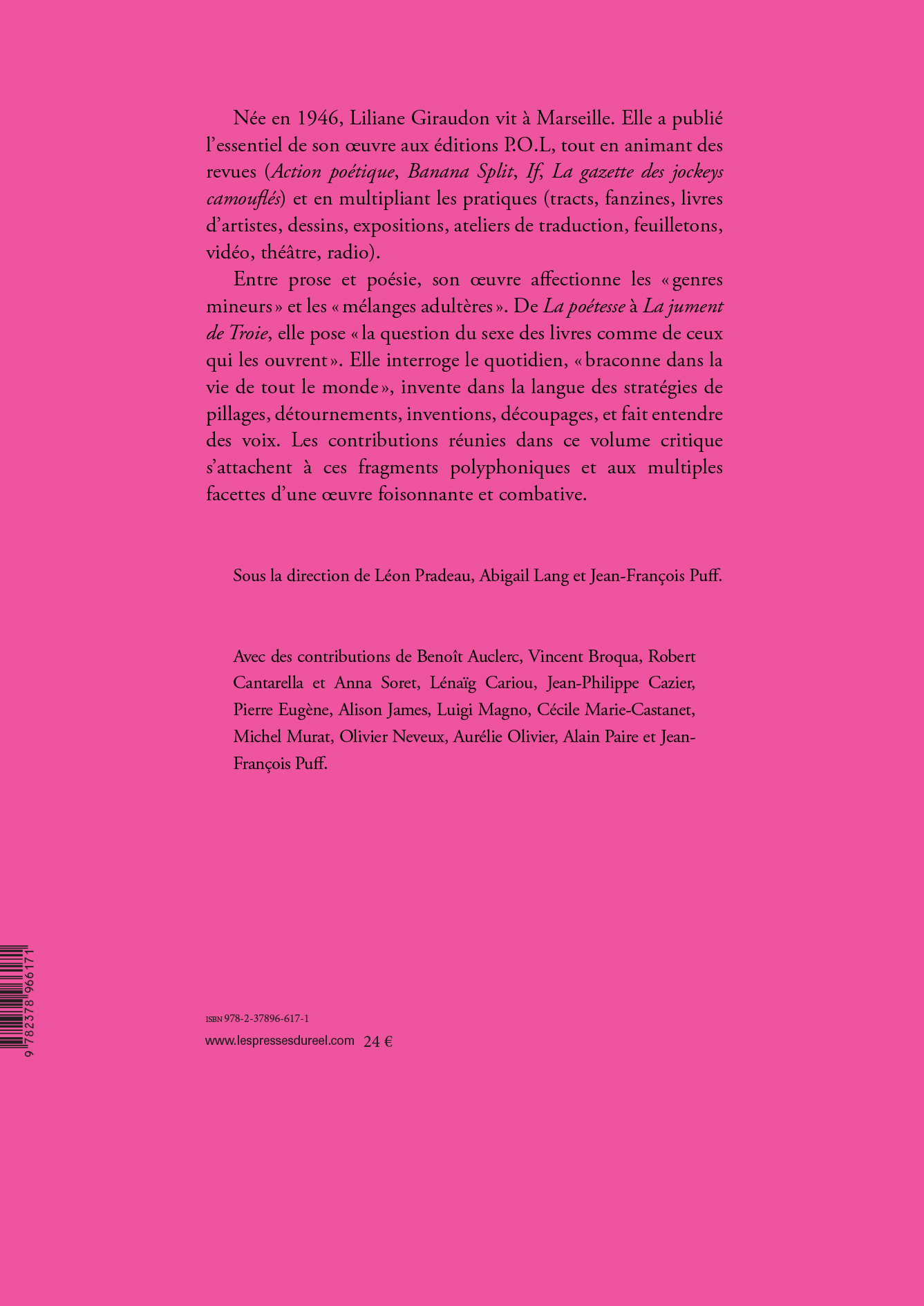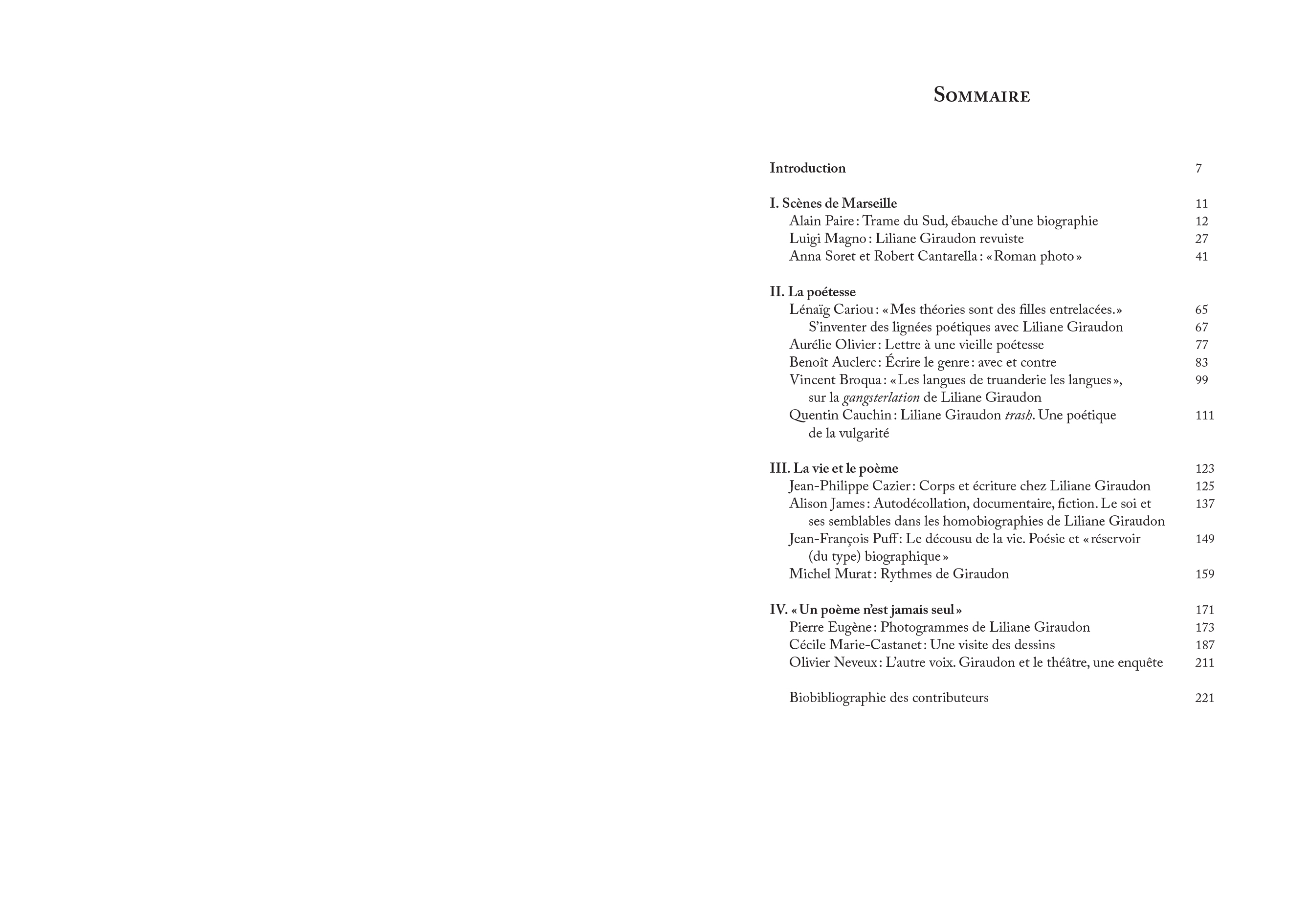 Le premier volume d'essais consacré à l'œuvre de Liliane Giraudon explore la diversité de son œuvre, son interdisciplinarité mais aussi sa cohérence, et permet de comprendre ce qui fait sa force et son importance dans le paysage littéraire contemporain.