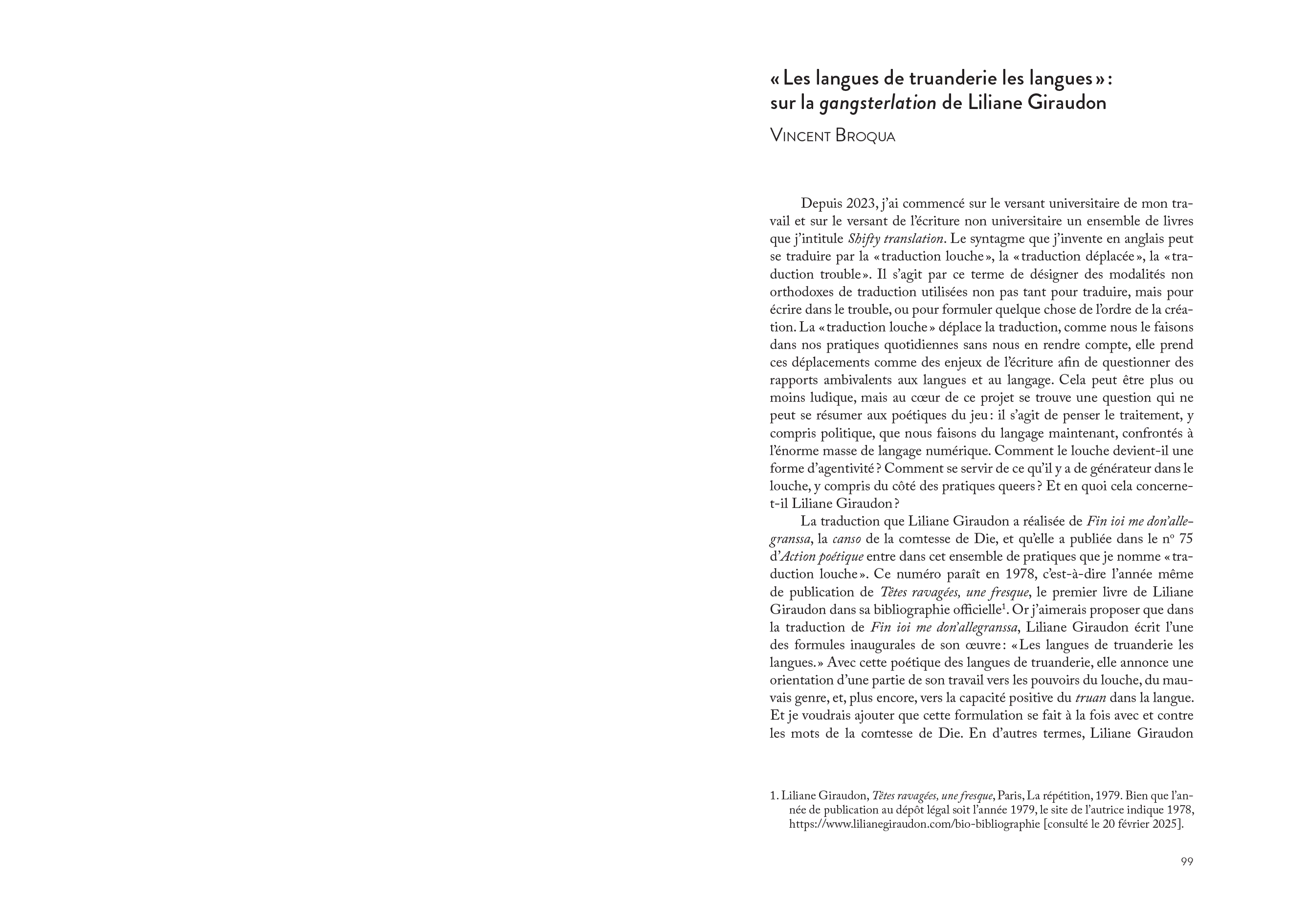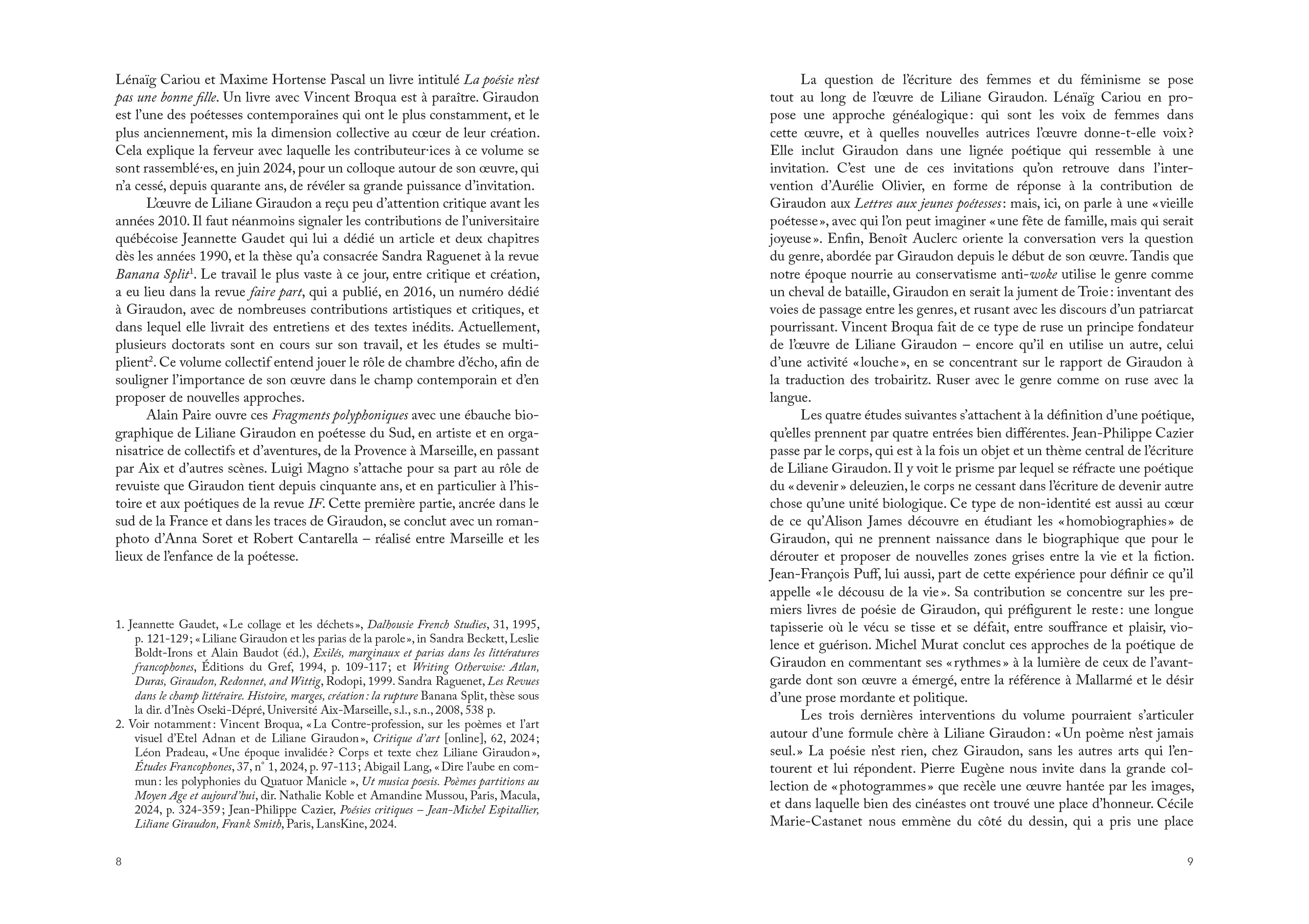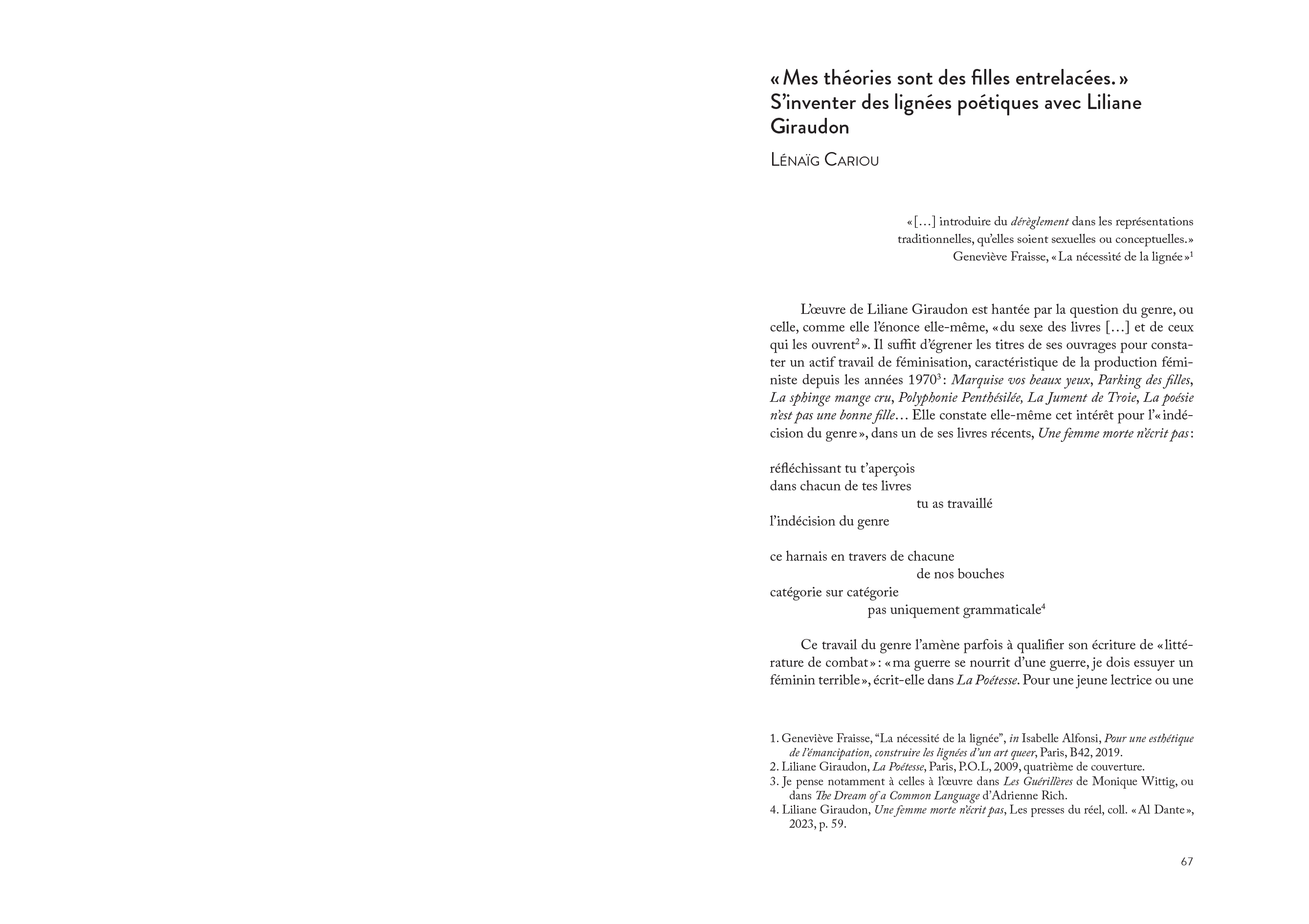 Le premier volume d'essais consacré à l'œuvre de Liliane Giraudon explore la diversité de son œuvre, son interdisciplinarité mais aussi sa cohérence, et permet de comprendre ce qui fait sa force et son importance dans le paysage littéraire contemporain.