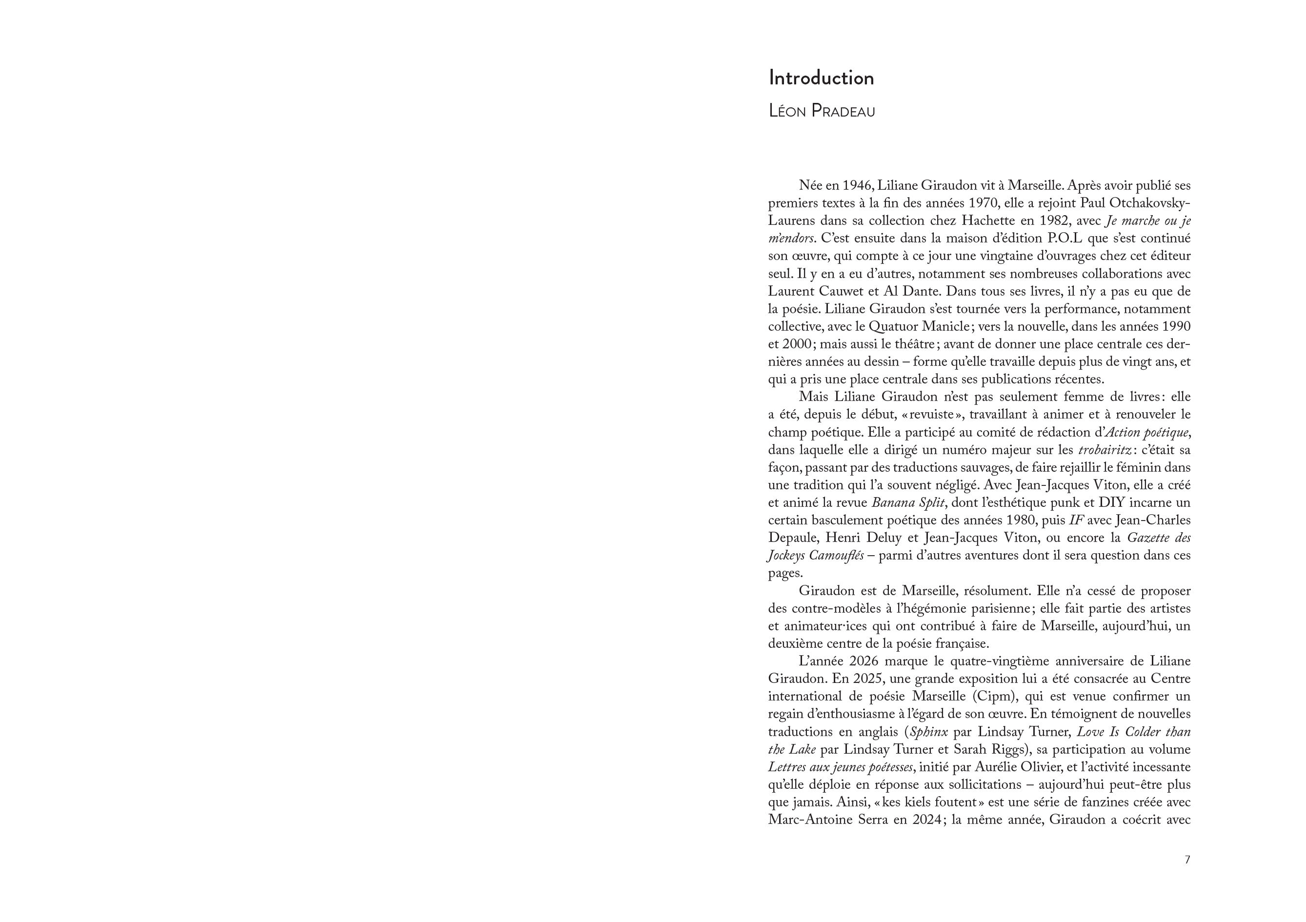 Liliane Giraudon a publié l'essentiel de son œuvre aux éditions P.O.L, tout en animant des revues (Action poétique, Banana Split, If, La gazette des jockeys camouflés) et en multipliant les pratiques (tracts, fanzines, livres d'artistes, dessins, expositions, ateliers de traduction, feuilletons, vidéo, théâtre, radio). Entre prose et poésie, son œuvre affectionne les « genres mineurs » et les « mélanges adultères ». De La poétesse à La jument de Troie, elle pose « la question du sexe des livres comme de ceux qui les ouvrent ». Elle interroge le quotidien, « braconne dans la vie de tout le monde », invente dans la langue des stratégies de pillages, détournements, inventions, découpages, et fait entendre des voix.