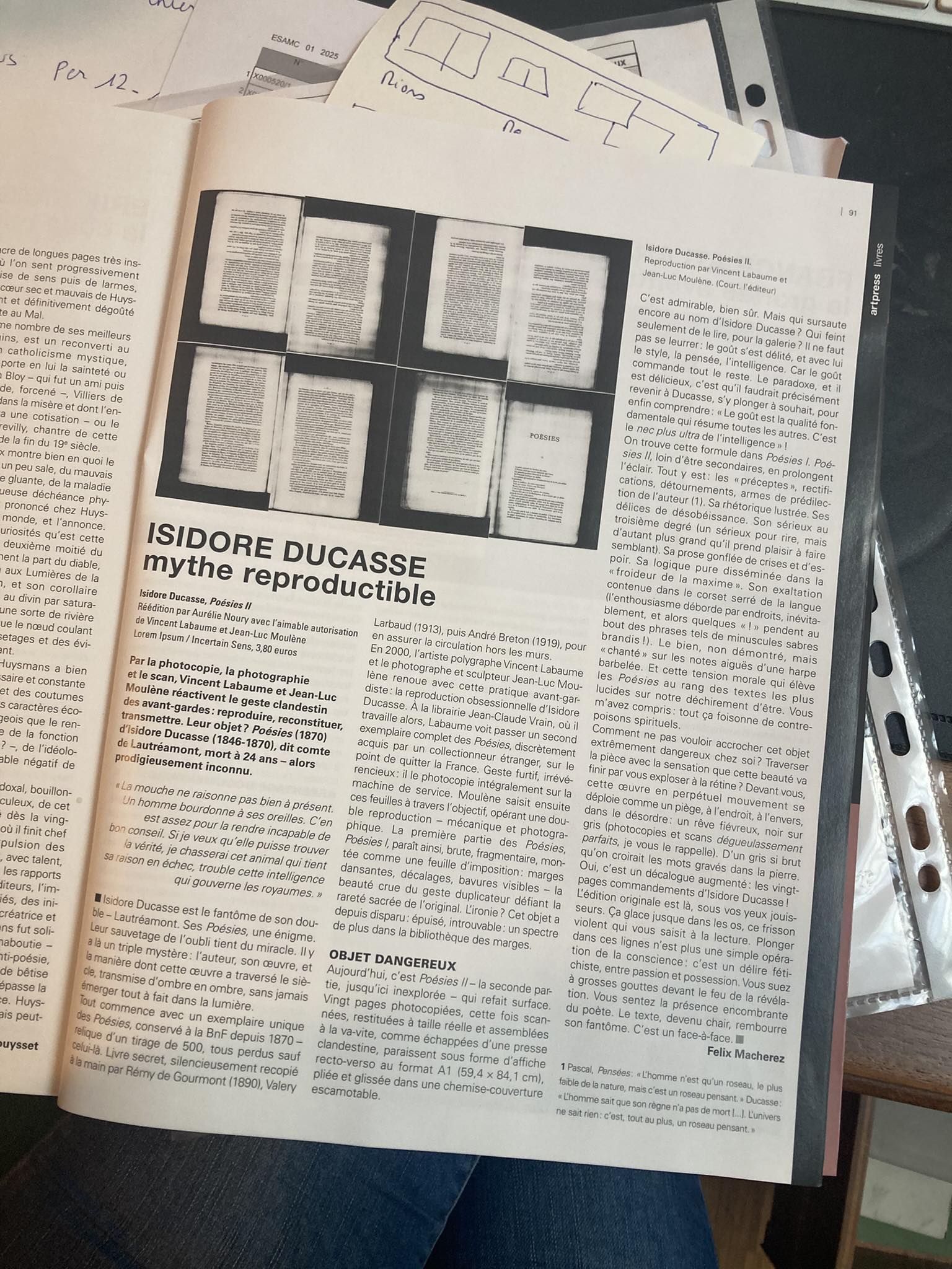 Conscient du caractère exceptionnel de cette réapparition, Vincent Labaume décide de se saisir subrepticement des précieux volumes pour les photocopier, directement sur son lieu de travail, avec la machine à disposition. Ce geste donne lieu à une série de feuillets A4 mobiles sur chacun desquels est reproduite une page des deux fascicules à échelle 1. Jean-Luc Moulène réalise ensuite plusieurs prises de vue des photocopies, venant doubler l'acte de reproduction. L'ensemble constituant le premier volume des Poésies est alors mis en page, imprimé et plié à la manière d'une feuille d'imposition à déployer, laissant apparents certains effets visuels dus à la photocopie : marges tournantes, bougés, biais ou décalages. Cette reconstitution présente un ensemble homogène porté tant par l'éventail des gris créé par la technique de la photocopie, que par le dévoilement des ficelles du façonnage, tous au service du texte de Ducasse, restitué dans une beauté sobre.