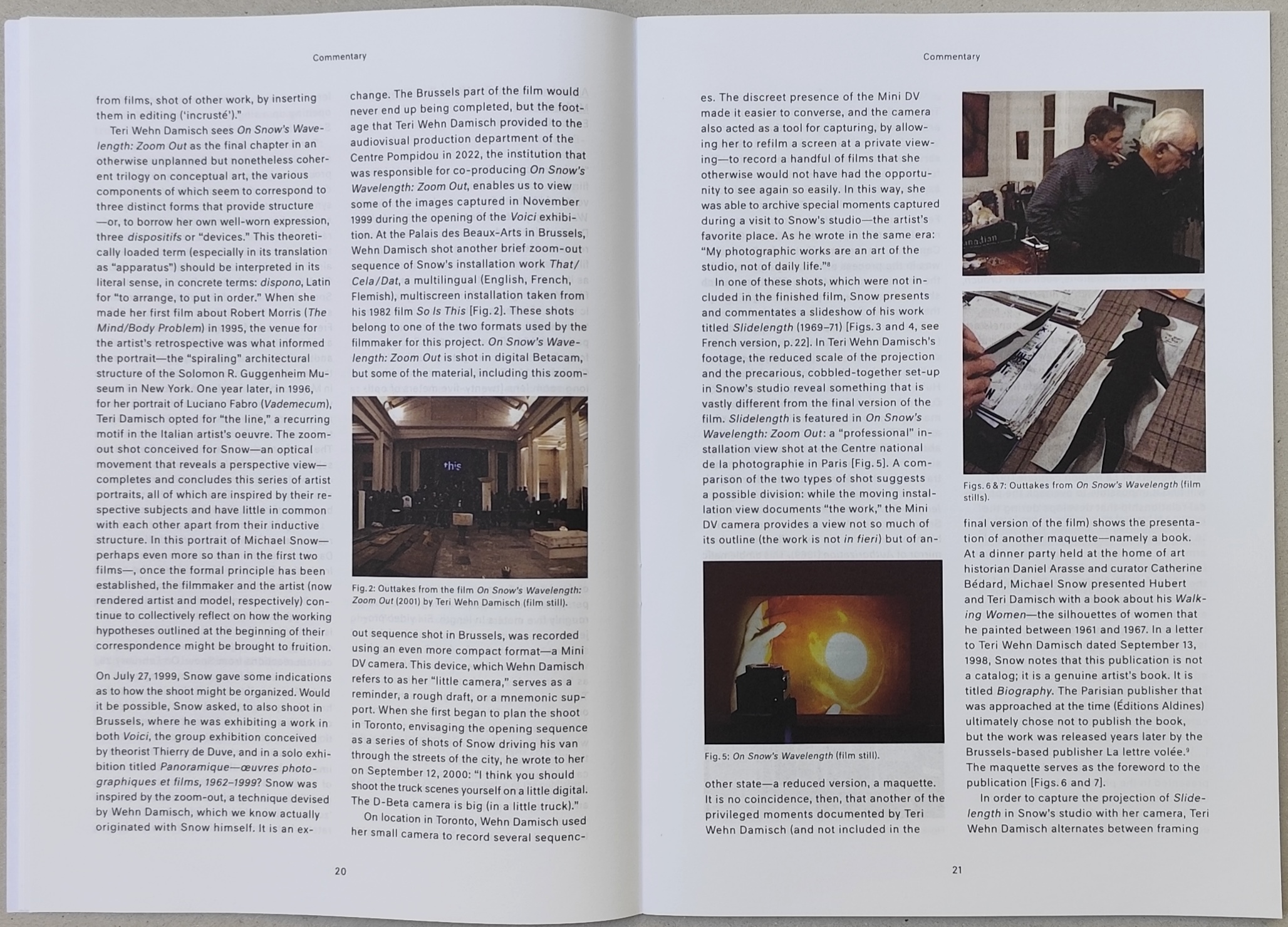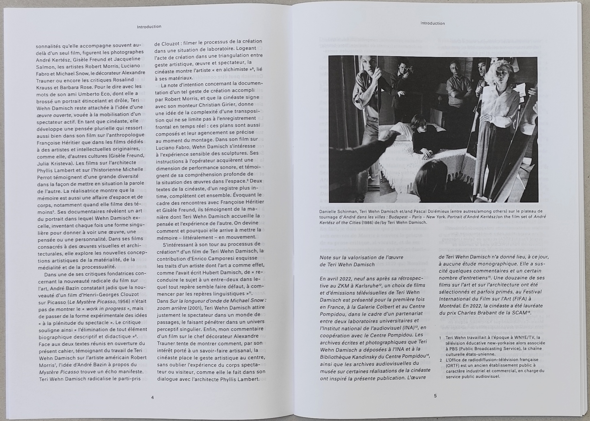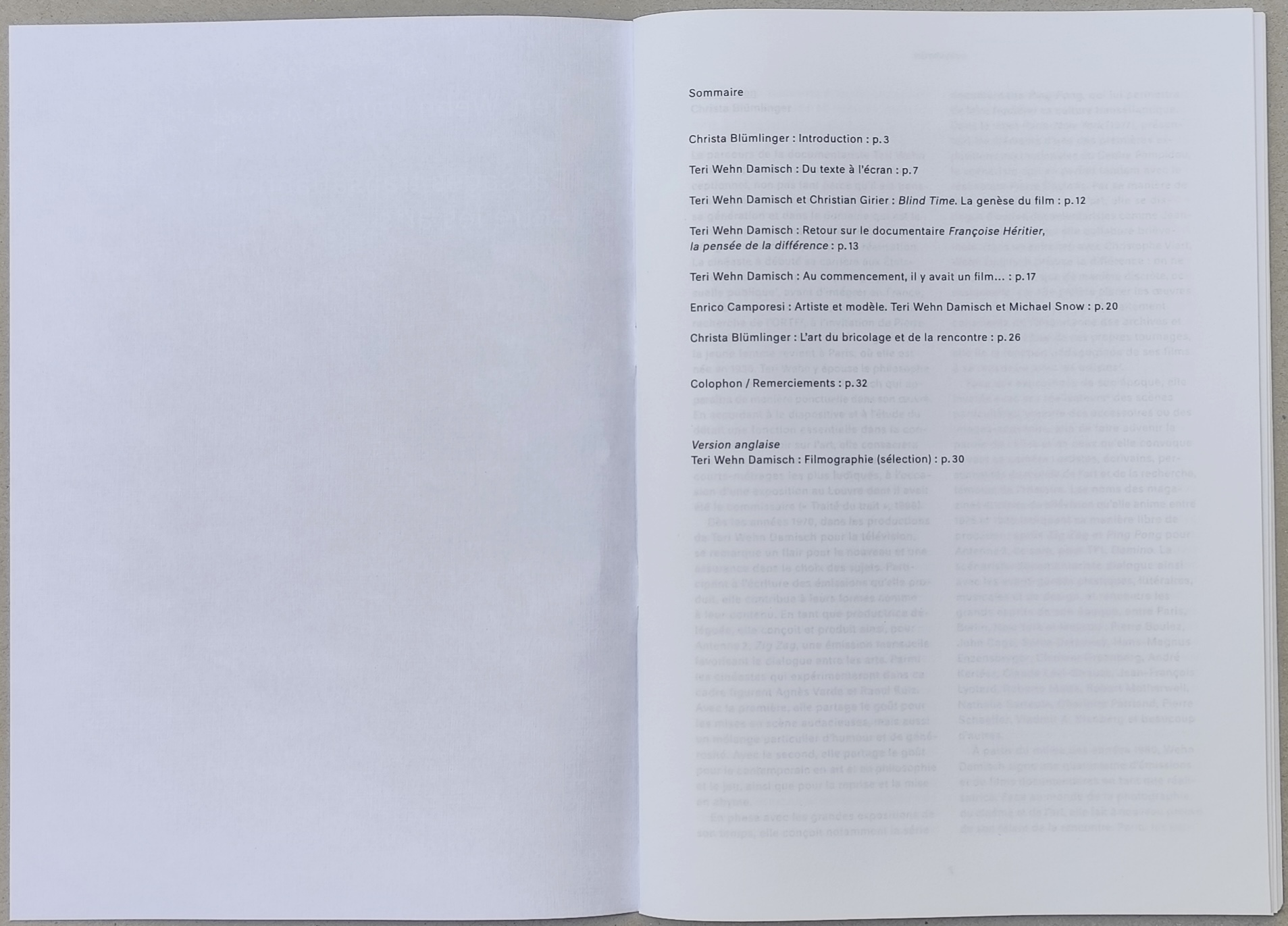 Quatre textes de Teri Wehn Damisch, évoquant la conception de ses films sur l'artiste Robert Morris, la photographe Gisèle Freund et l'anthropologue Françoise Héritier. Un essai d'Enrico Camporesi détaillant la genèse du film Sur la longueur d'ondes de Michael Snow(2001) et une étude du portrait dédié au chef décorateur Alexandre Trauner, signée par Christa Blümlinger, complètent l'ensemble.