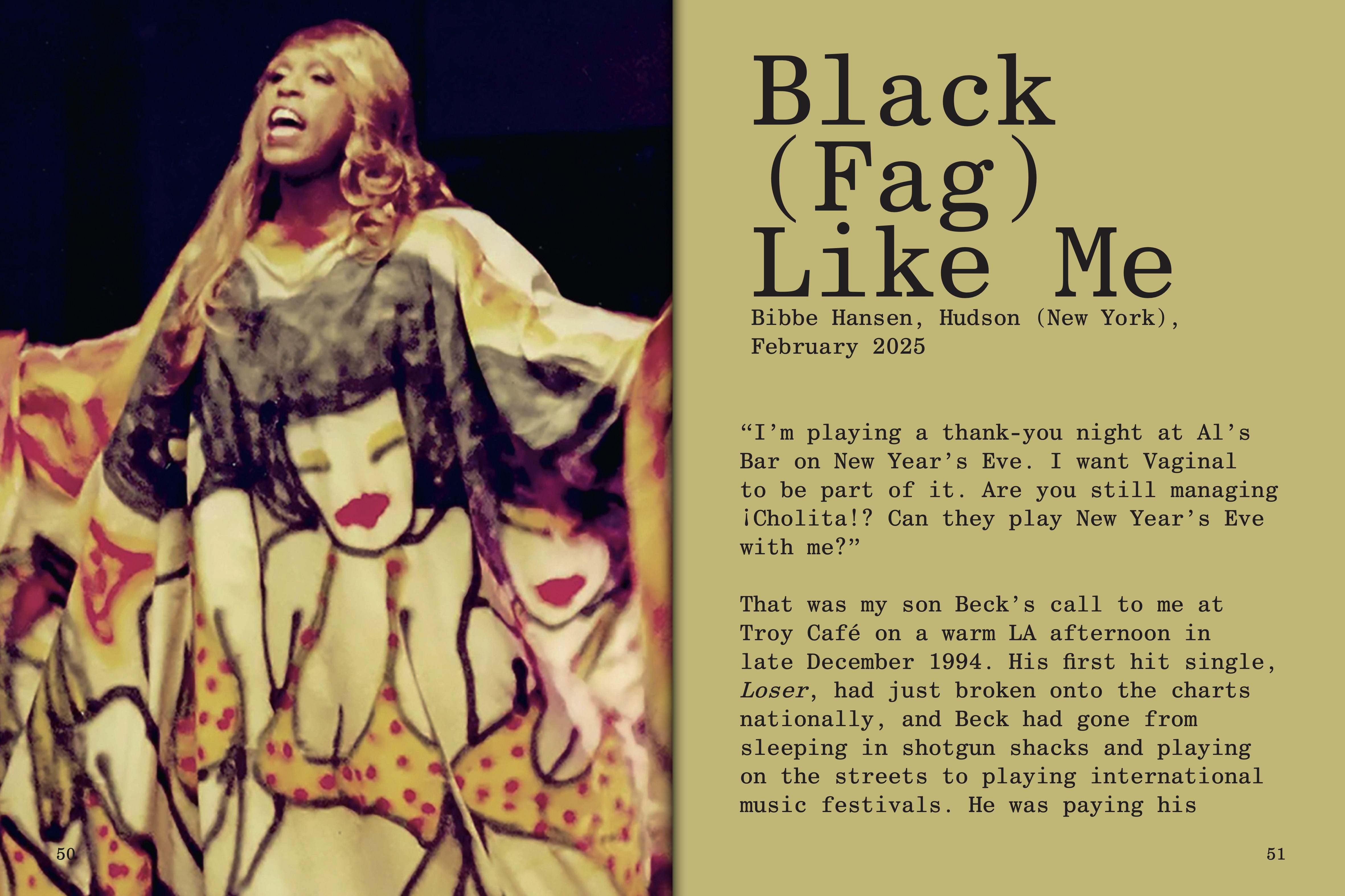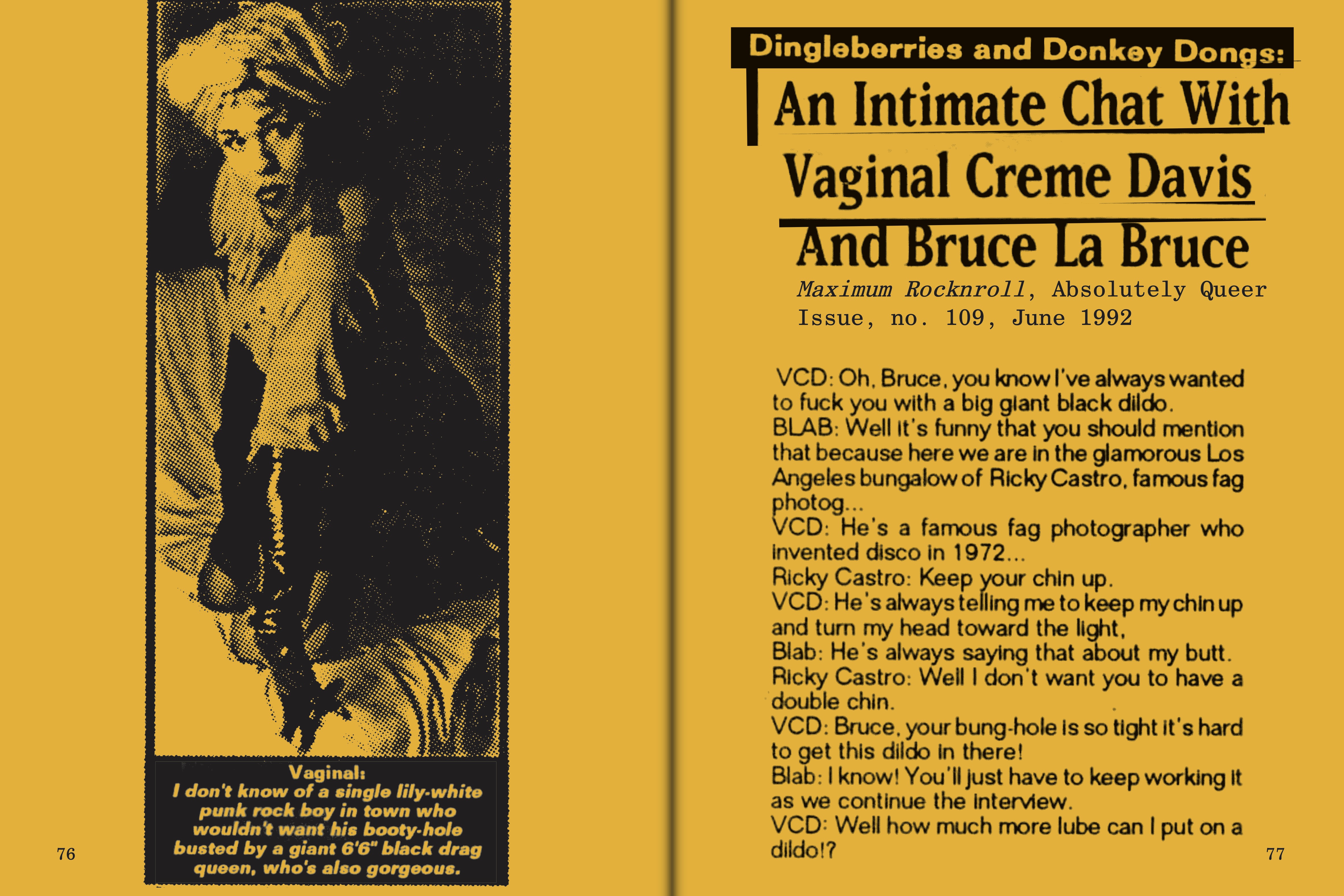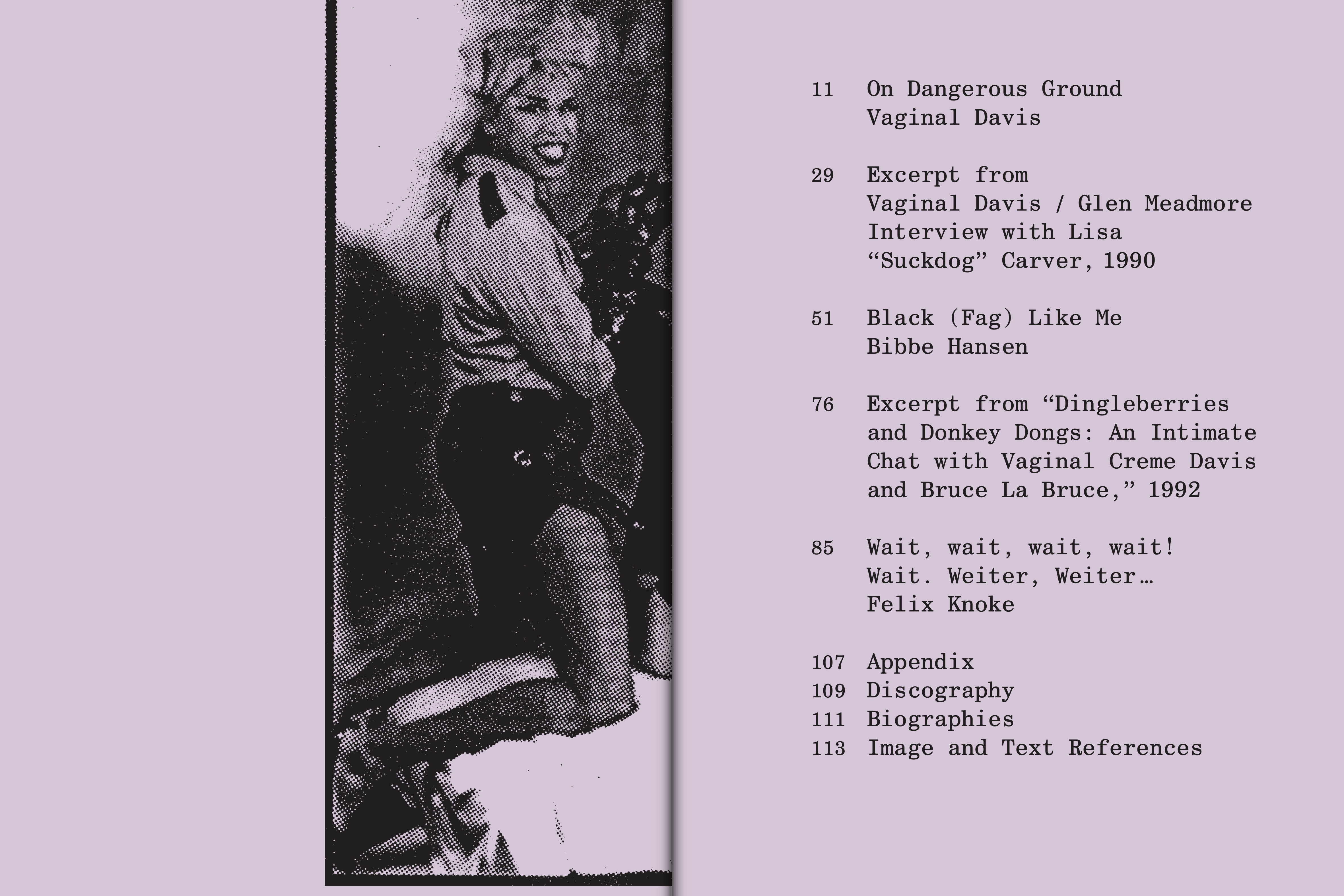 L'artiste Vaginal Davis évolue certainement sur un terrain dangereux avec son entreprise transgressive de mélange des genres et des frontières. Celle qui se décrit elle-même comme une « repoussante sexuelle » a cofondé plusieurs groupes art punk au cours de sa carrière de plus de 40 ans, à savoir Afro Sisters, ¡Cholita !, Pedro, Muriel & Esther (PME), black fag et Tenderloin. En tant qu'écrivain et « Whoracle et Delphi », Mme Davis s'intéresse à la pratique collective de la musique sur les scènes underground de Los Angeles et de Berlin. Dans leurs contributions, Bibbe Hansen (artiste et habitué de la Warhol Silver Factory) et Felix Knoke (artiste invité par The Hidden Cameras et membre du groupe Tenderloin), camarades et collaborateurs de longue date, racontent leurs performances et leurs répétitions communes, divulguant des secrets sacrés et des failles. Bruce « Judy » LaBruce, Glen Meadmore et Lisa « Suckdog » Carver font des apparitions surprises, ainsi que des images des spectacles The White to Be Angry, Trust Fund, Interracial Dating Game, We're Taking Over, Afro De Sade et Camp/Anti-Camp: A Queer Guide to Everyday Life.
