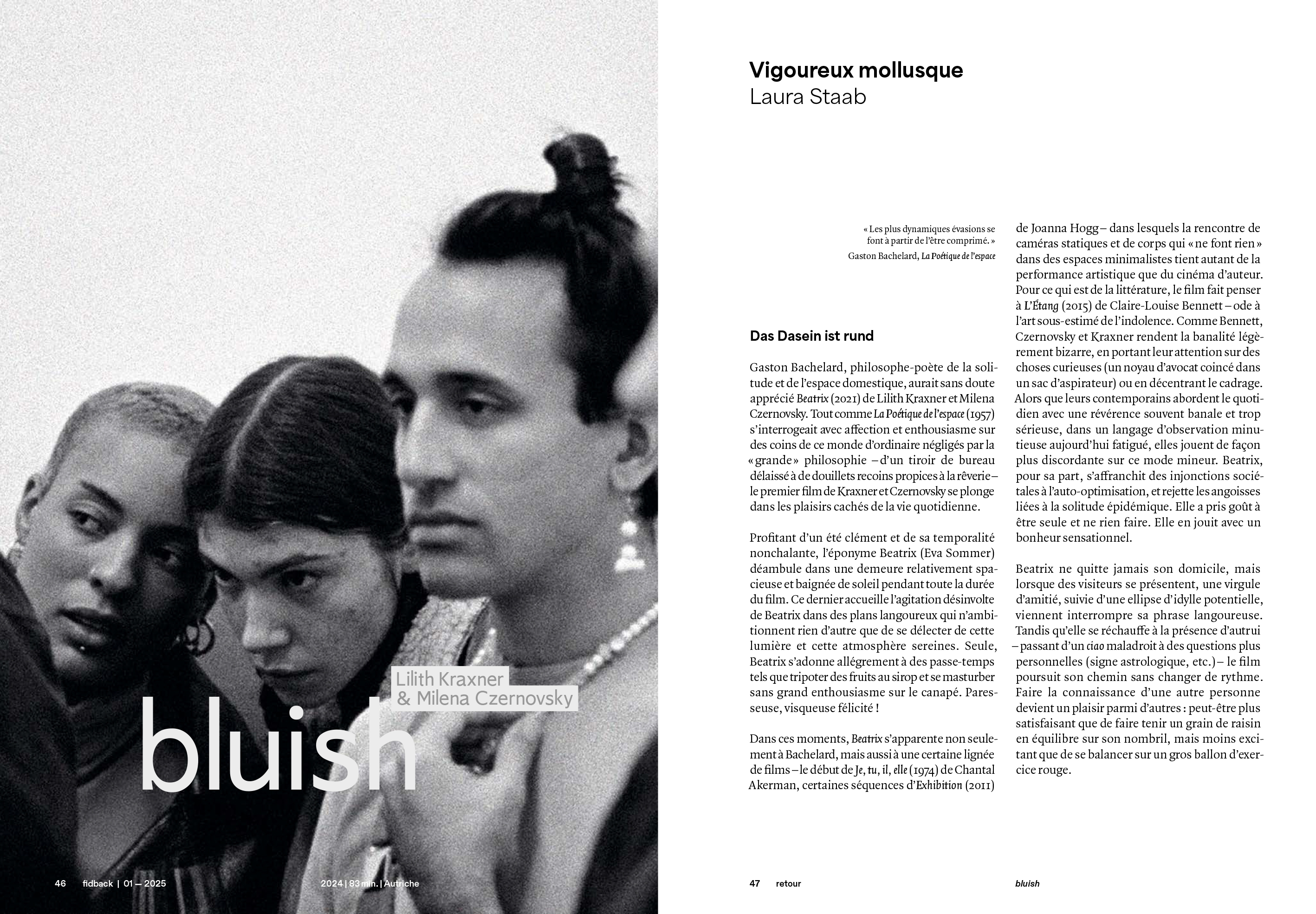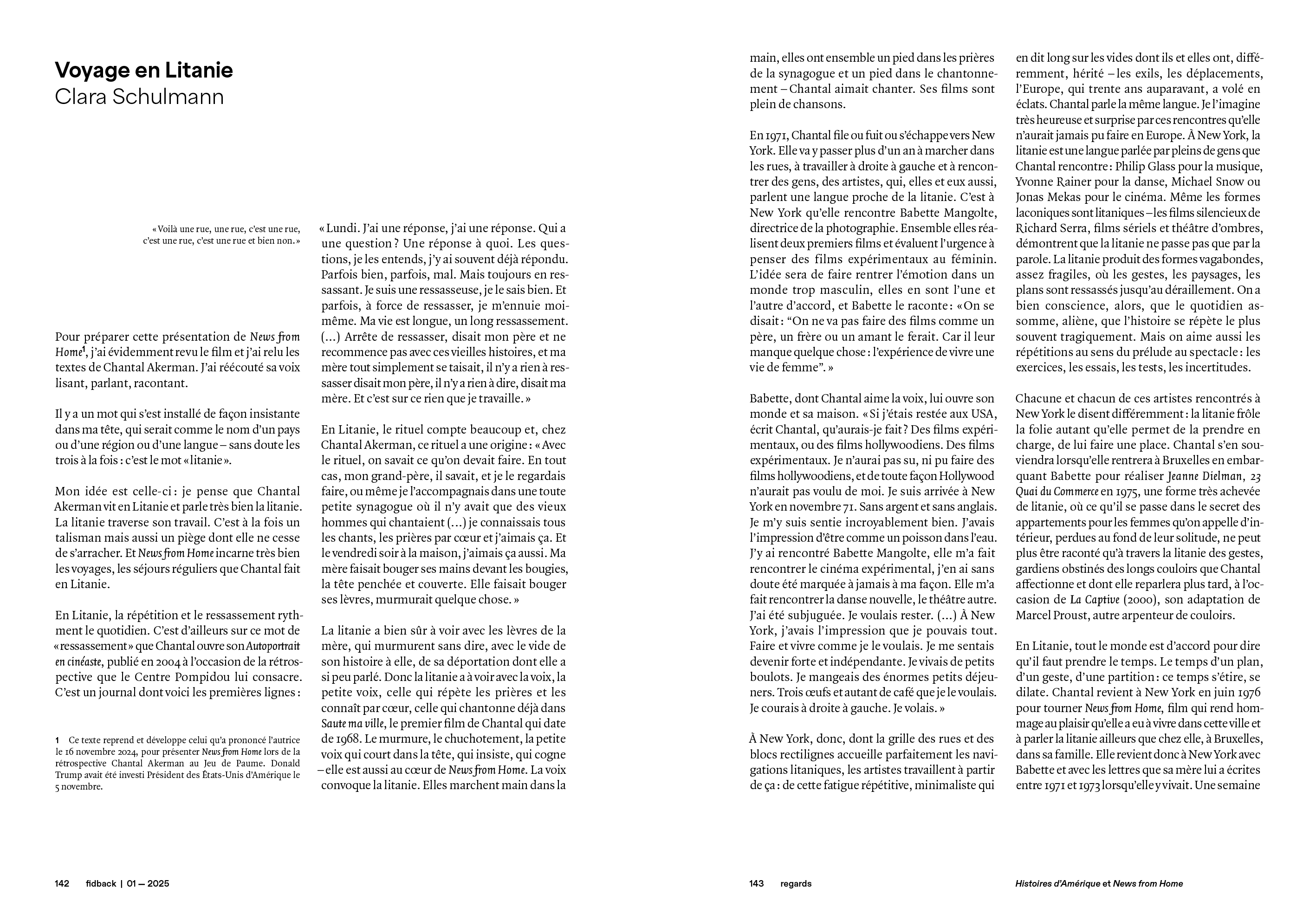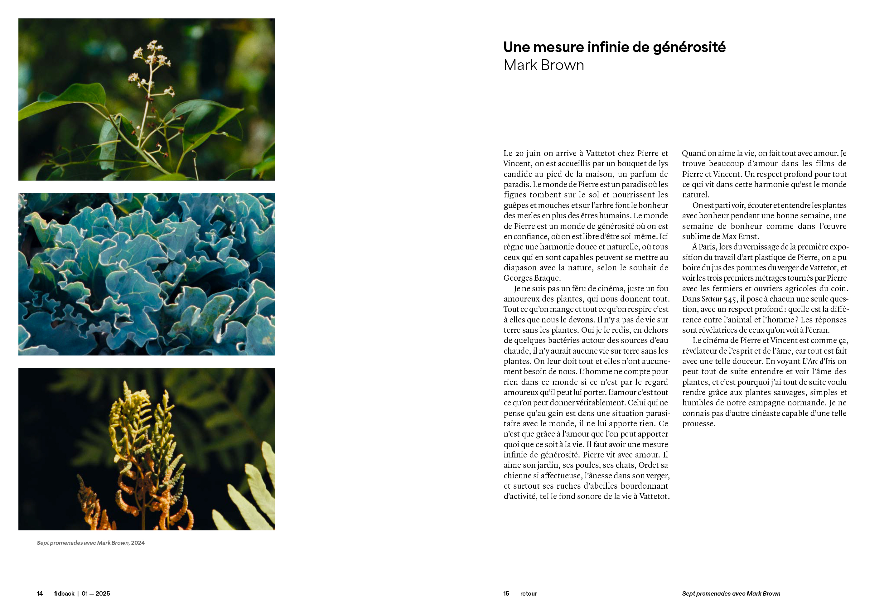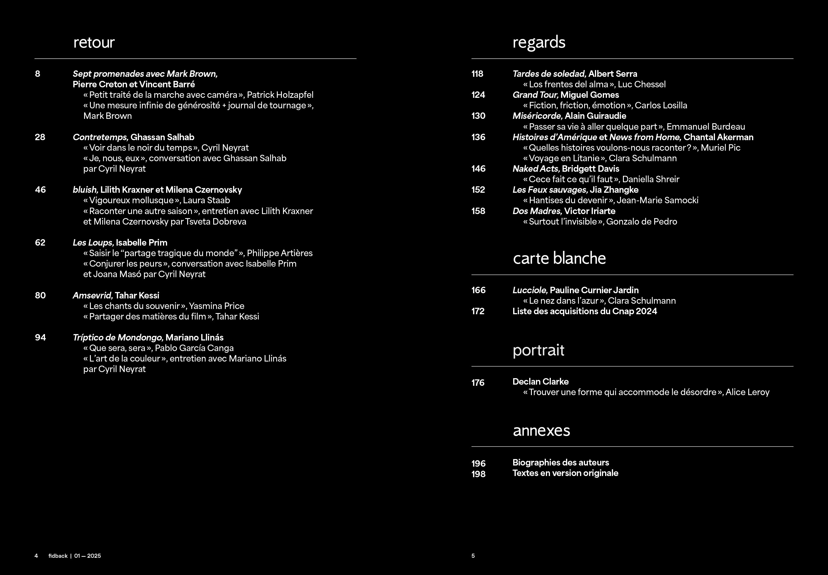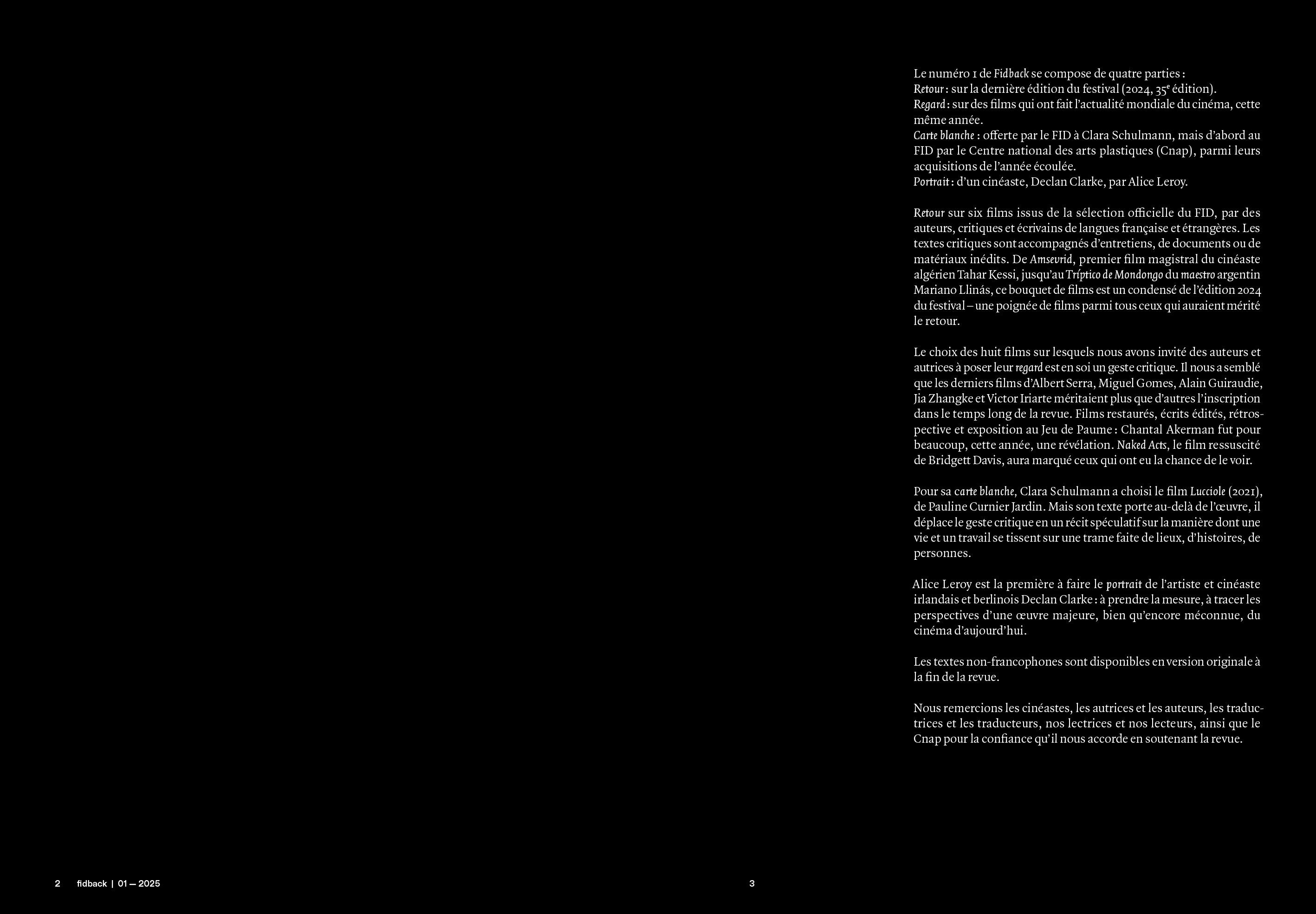 Le numéro 1 de la revue de cinéma Fidback éditée par le FIDMarseille, avec un retour sur la 35e édition du festival, un regard rétrospectif sur des films qui ont fait l'actualité mondiale du cinéma en 2024, une carte blanche à Clara Schulmann, et un portrait de l'artiste et cinéaste Declan Clarke par Alice Leroy.
