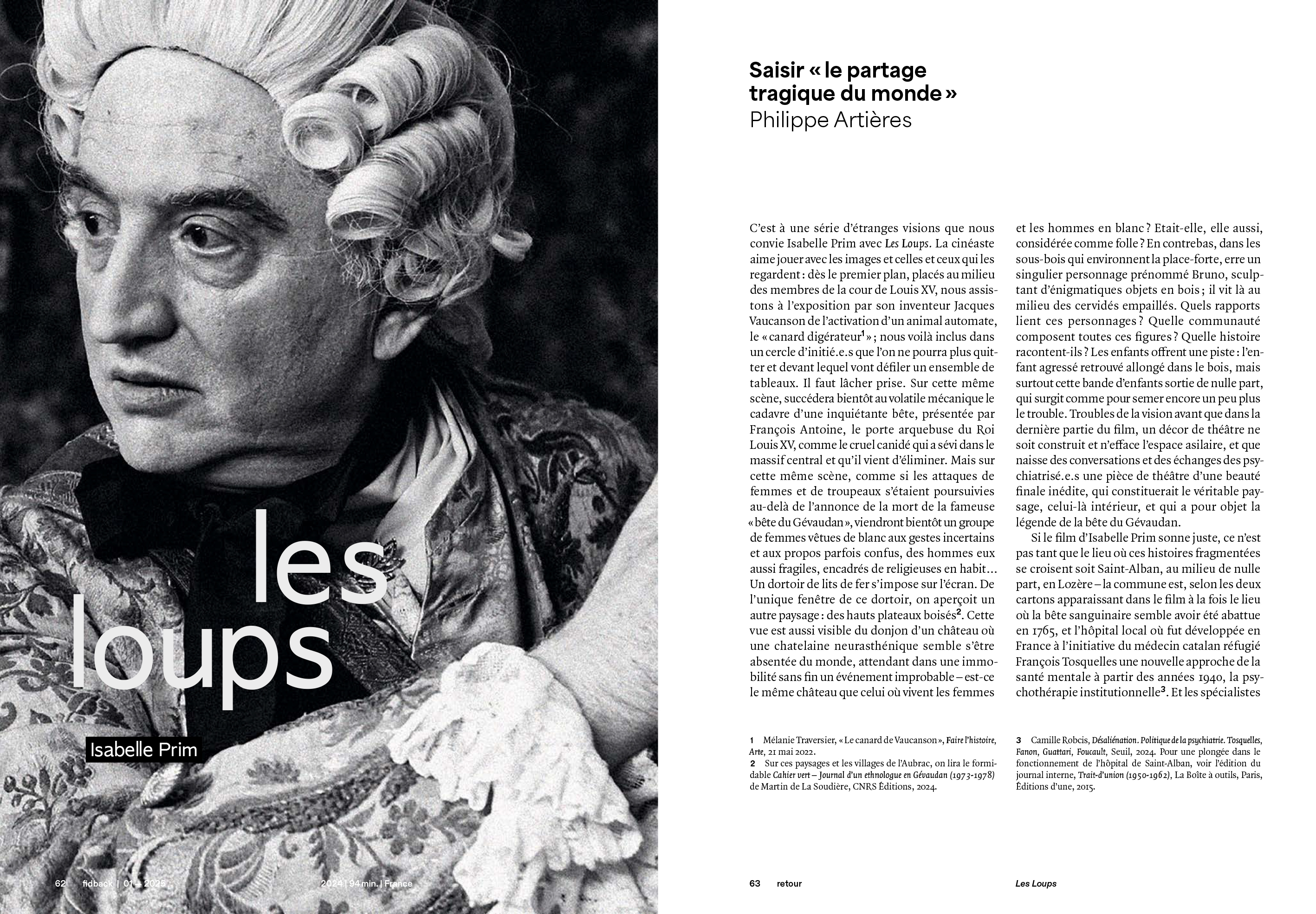 Le choix des huit films sur lesquels nous avons invité des auteurs et autrices à poser leur regard est en soi un geste critique. Il nous a semblé que les derniers films d'Albert Serra, Miguel Gomes, Alain Guiraudie, Jia Zhangke et Victor Iriarte méritaient plus que d'autres l'inscription dans le temps long de la revue. Films restaurés, écrits édités, rétrospective et exposition au Jeu de Paume : Chantal Akerman fut pour beaucoup, cette année, une révélation. Naked Acts, le film ressuscité de Bridgett Davis, aura marqué ceux qui ont eu la chance de le voir.