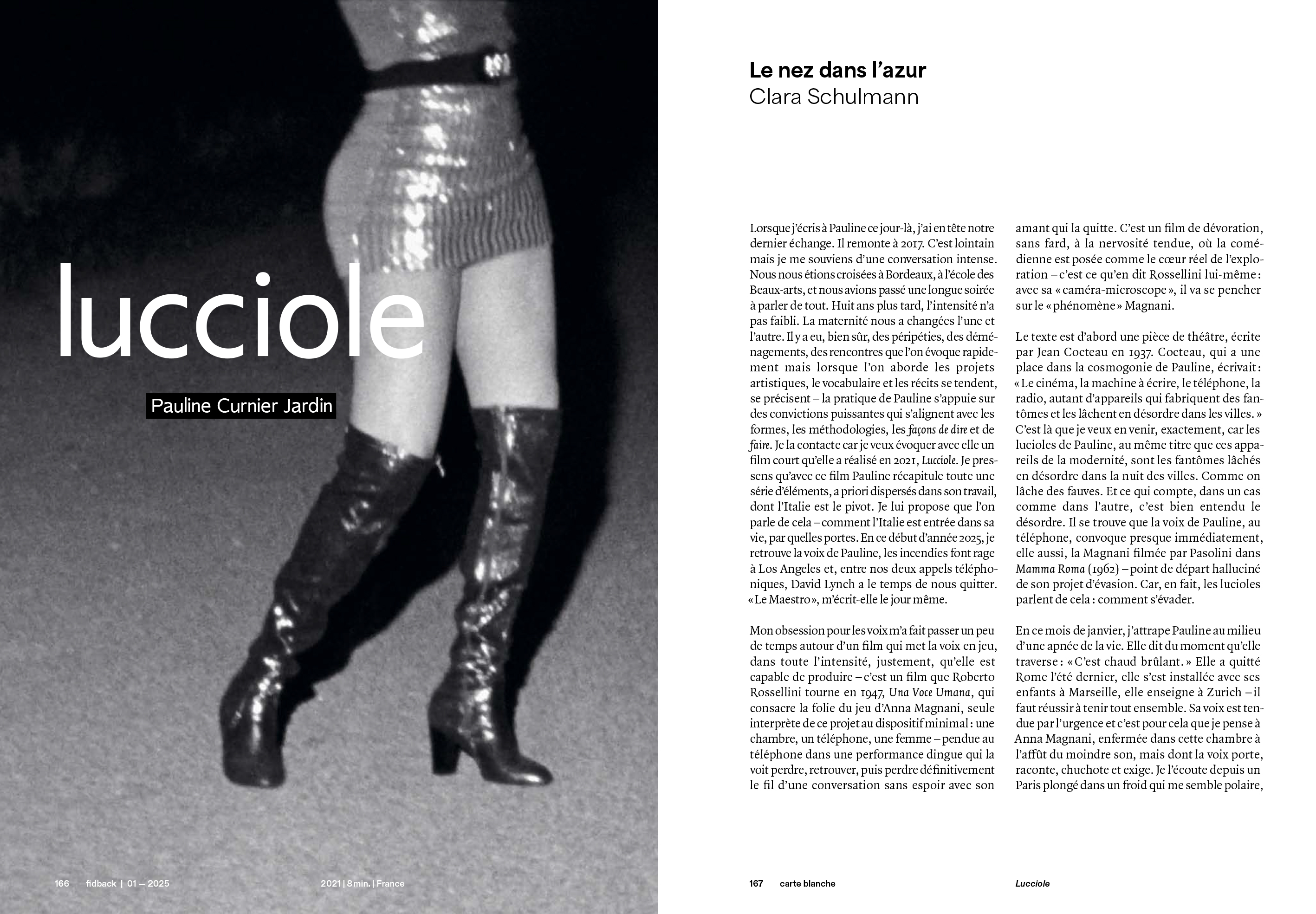 Pour sa carte blanche, Clara Schulmann a choisi le film Lucciole (2021), de Pauline Curnier Jardin. Mais son texte porte au-delà de l'œuvre, il déplace le geste critique en un récit spéculatif sur la manière dont une vie et un travail se tissent sur une trame faite de lieux, d'histoires, de personnes.