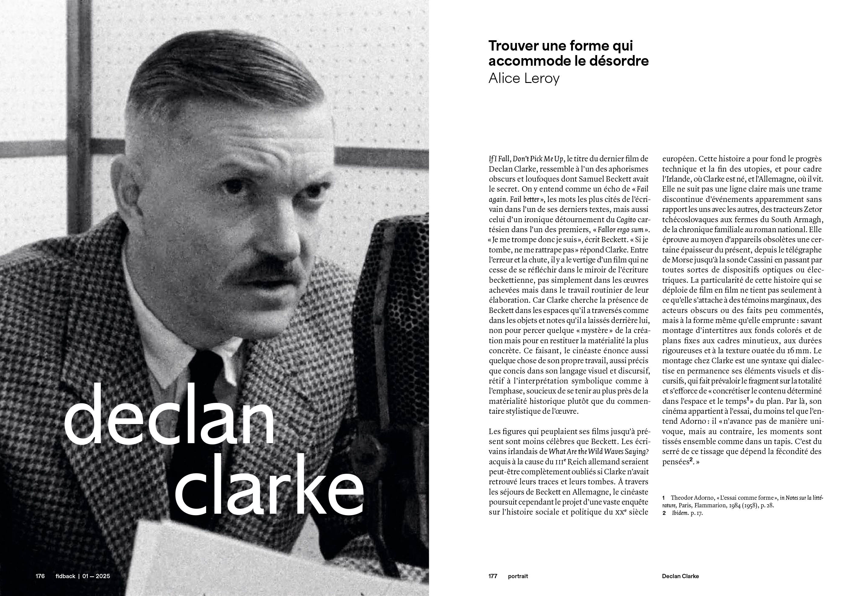 Alice Leroy est la première à faire le portrait de l'artiste et cinéaste irlandais et berlinois Declan Clarke : à prendre la mesure, à tracer les perspectives d'une œuvre majeure, bien qu'encore méconnue, du cinéma d'aujourd'hui.