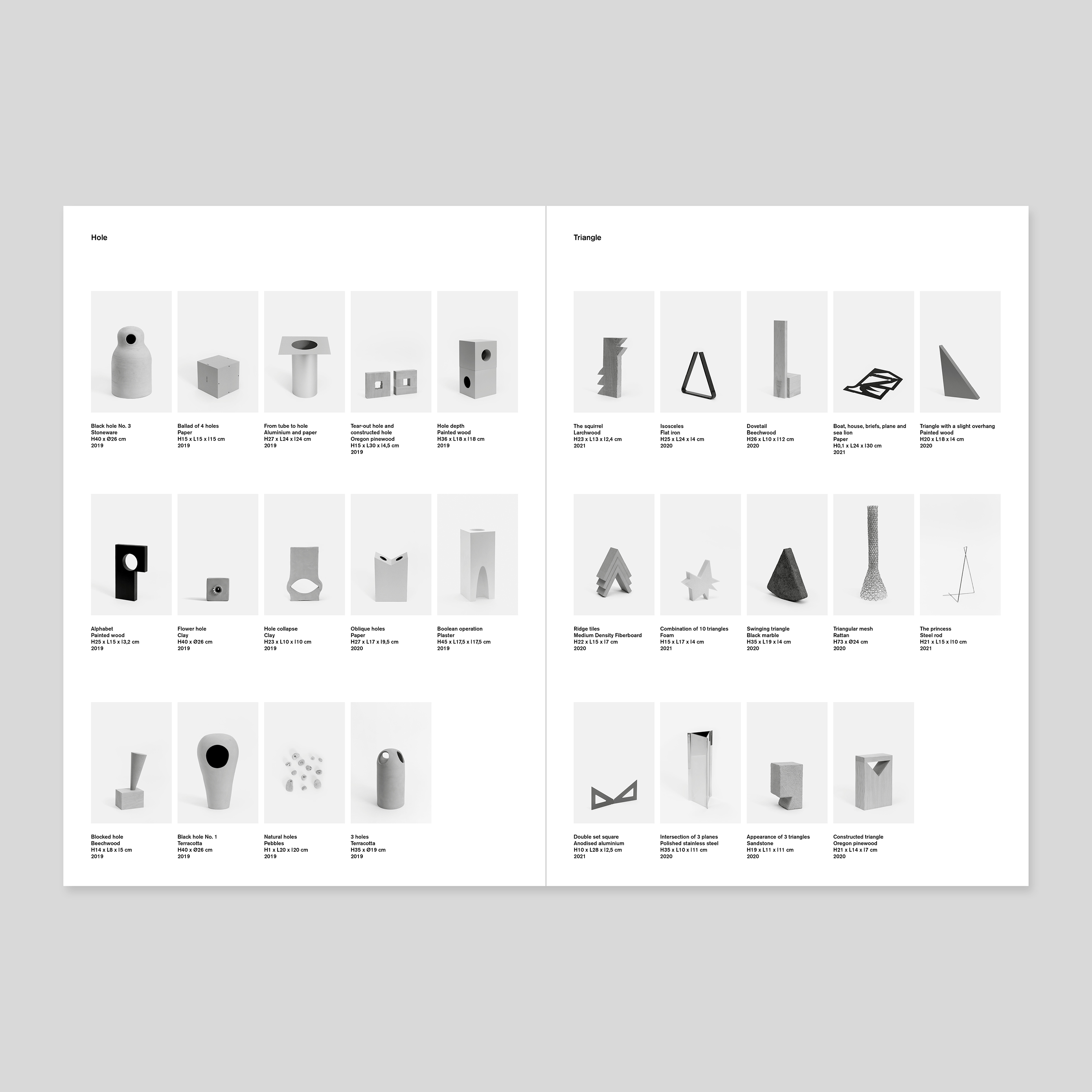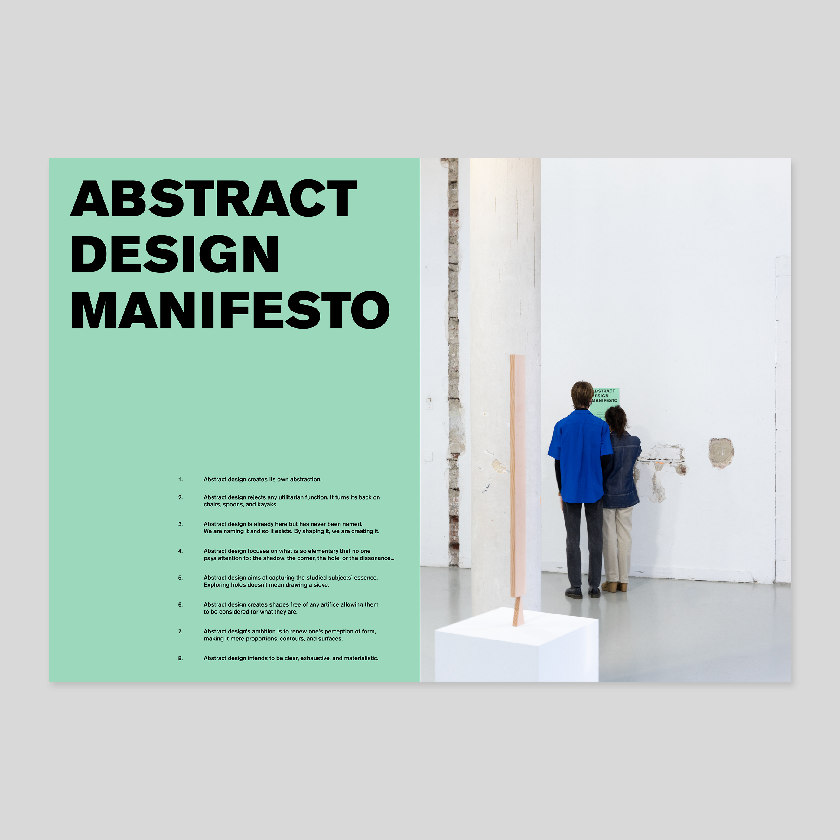 Henri Frachon et Antoine Lecharny développent ici une pratique dédiée aux procédés de conception plutôt qu'à l'usage des objets en dessinant les contours d'un « design abstrait », qui porte notre attention sur l'essence d'une forme et non sur sa fonction. Partant de quatre axes d'exploration (le trou, le jonc doucine, le triangle et la dissonance) le duo de créateurs met en œuvre une démarche expérimentale et radicale qui s'éloigne du design pour se rapprocher d'une recherche fondamentale.