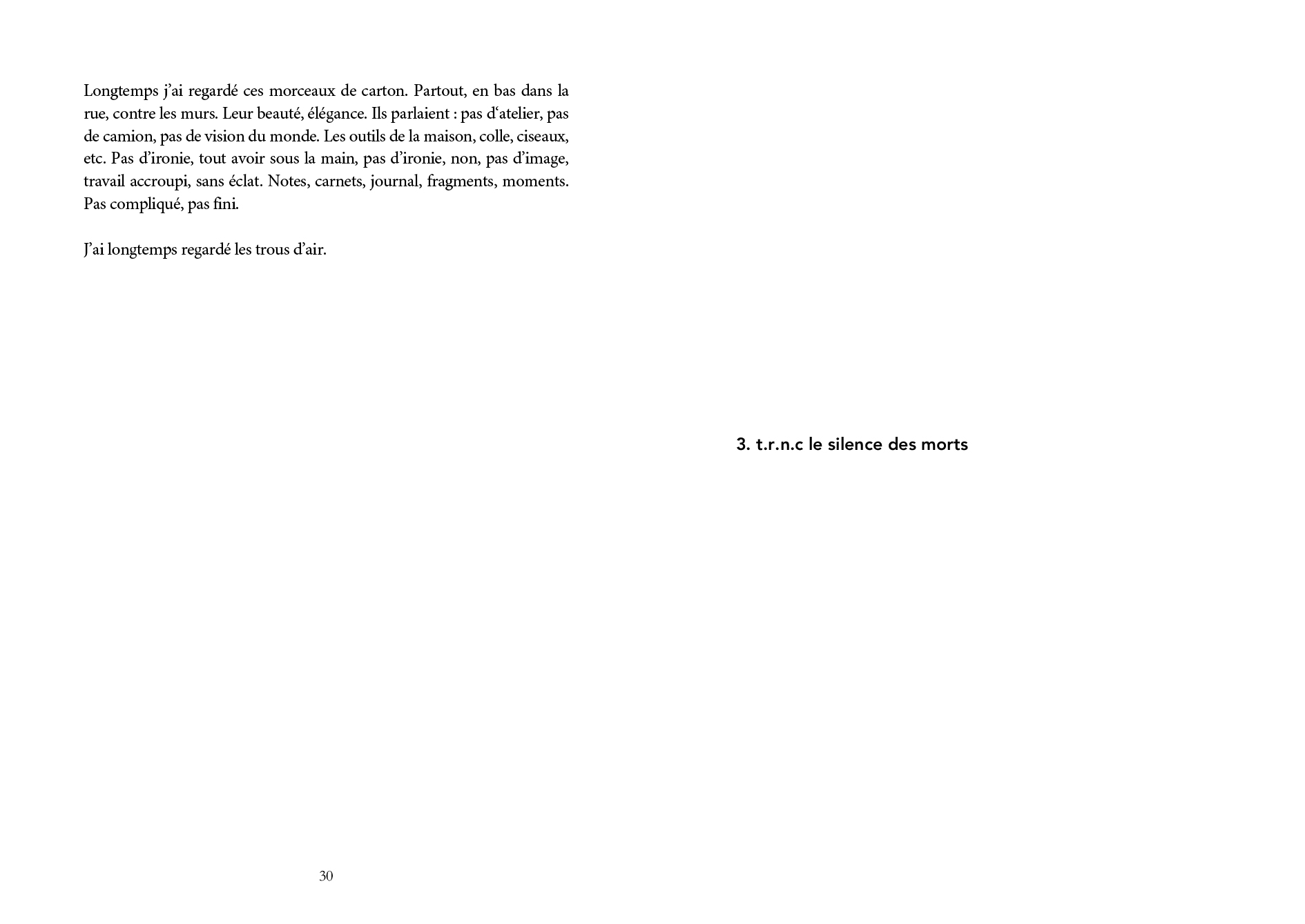 TRNC est le onzième volume d'un cycle commencé en 1990 avec un livre intitulé Léman. Son titre reprend celui d'un des volumes de la série, publié en 2011, qui s'intitulait Tarnac. Une lettre est tombée en chemin, la lettre A, celle des commencements. Comme le sous-titre l'indique, « Suites & reprises », l'intention est d'abord musicale : il s'agit bien d'une partition, de répétitions, de retours, de variations sur un thème dont la matière, la mémoire, est à la fois inépuisable et insaisissable. Ce thème a le nom d'un lieu, ou plutôt d'un espace, à la fois lié aux jeux d'enfance, aux silences de la forêt, aux traces d'un passé et d'un présent interminablement politiques (la Résistance, l'utopie communautaire). Mais le présent simple ne se résume pas, il échappe à tout le visible, comme à tout l'invisible, il est convoqué ici sur le mode de l'entre voir.