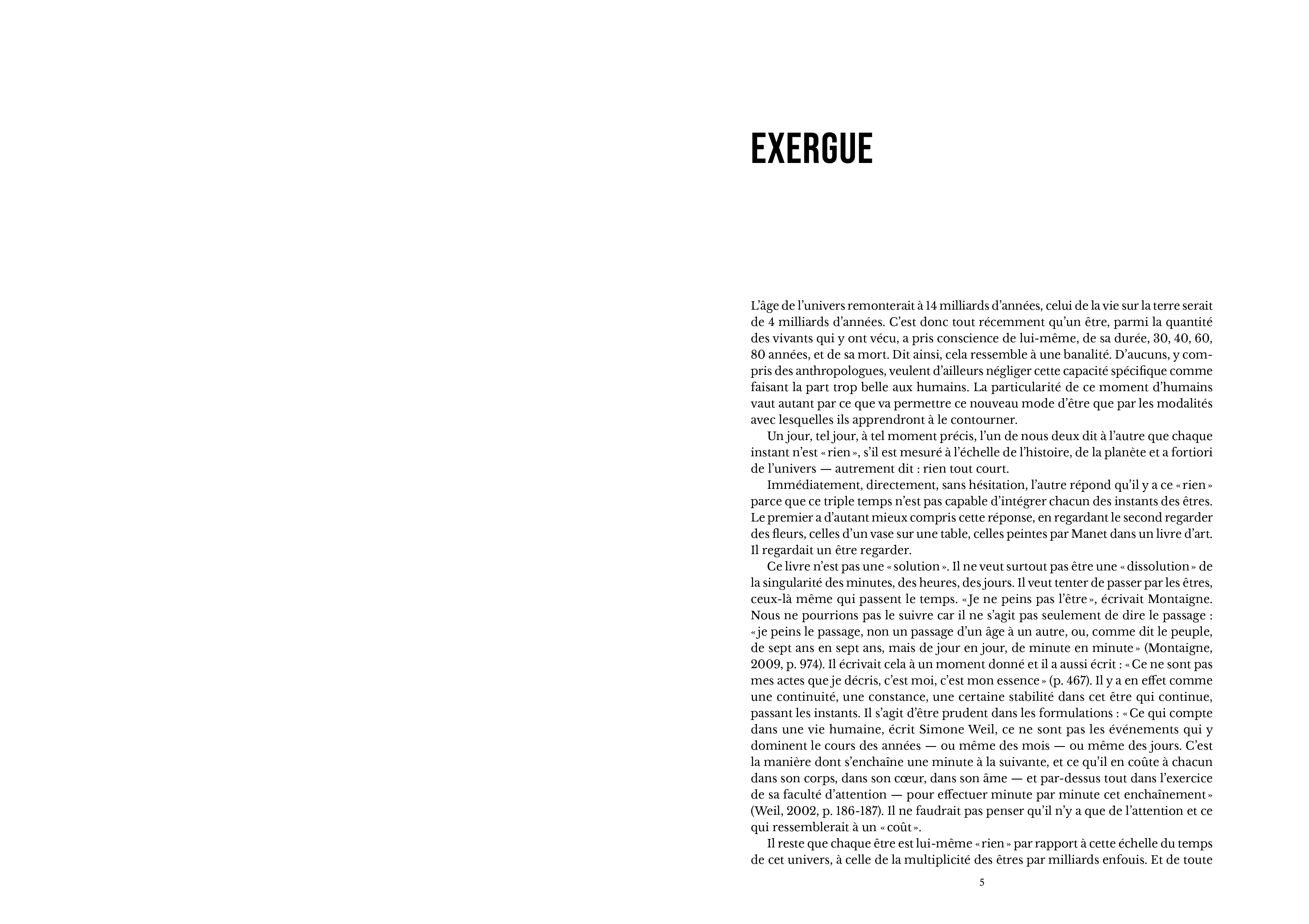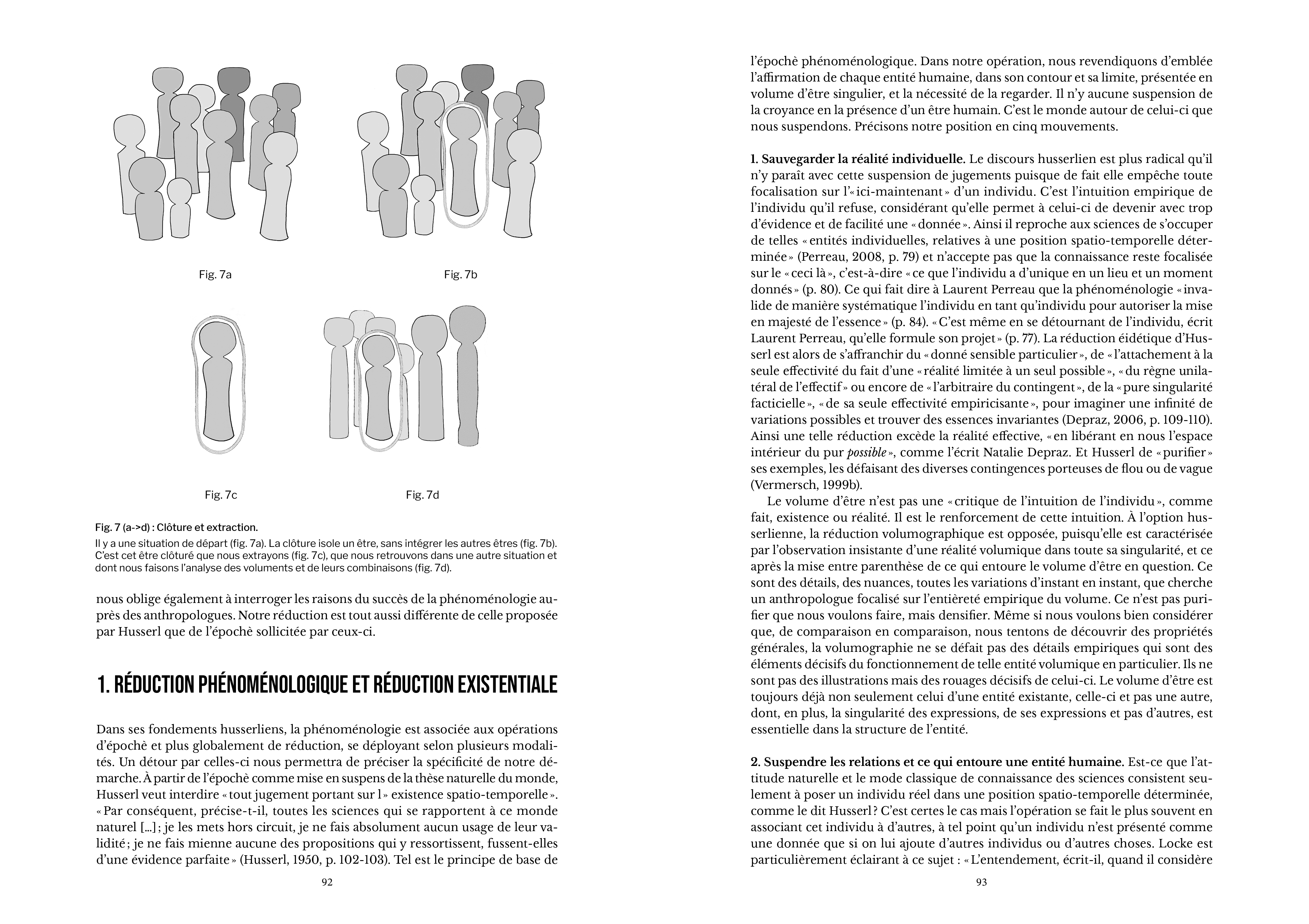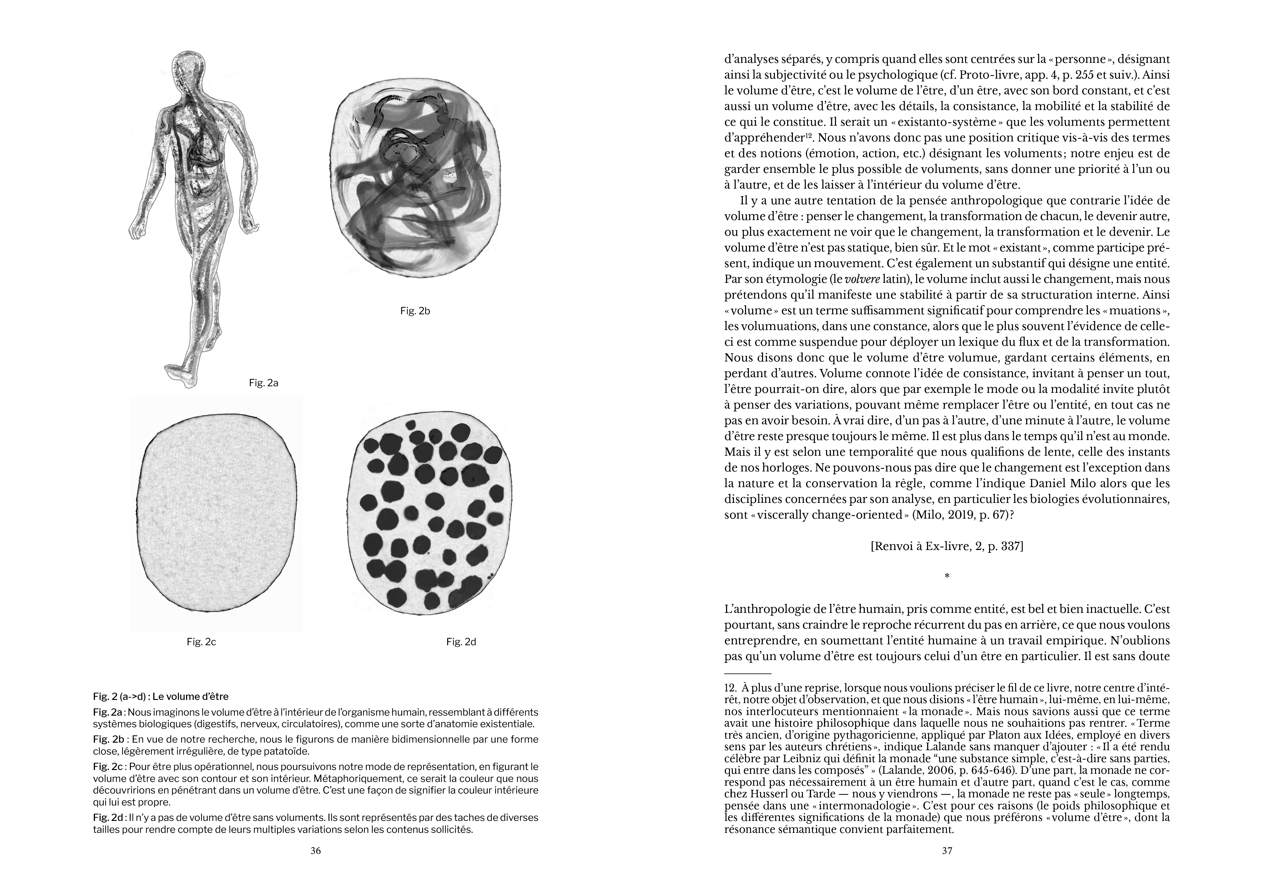 Ce livre comporte un grand nombre de dessins qui ne sont pas une simple illustration de concepts. Ce sont des dessins de théorie avec leur propre heuristicité, pensant et représentant un être dans son volume et ses ligatures. Le volume d'être, ils essaient également de le suivre sur la longue durée de la préhistoire, faisant rencontrer Neandertal et quelques primates non humains. C'est l'indifférence et la moindrité qui sont le fil de ce récit d'origine, présentées comme des caractéristiques essentielles des humains. Concepts, dessins, images, anthropologie, art, philosophie, préhistoire : les deux auteurs nous proposent une « théorie », avec ses avancées et ses répétitions, une « cyclopédie », comme ils l'écrivent, la forme du livre n'étant pas sans ressembler à la structure d'un volume d'être.