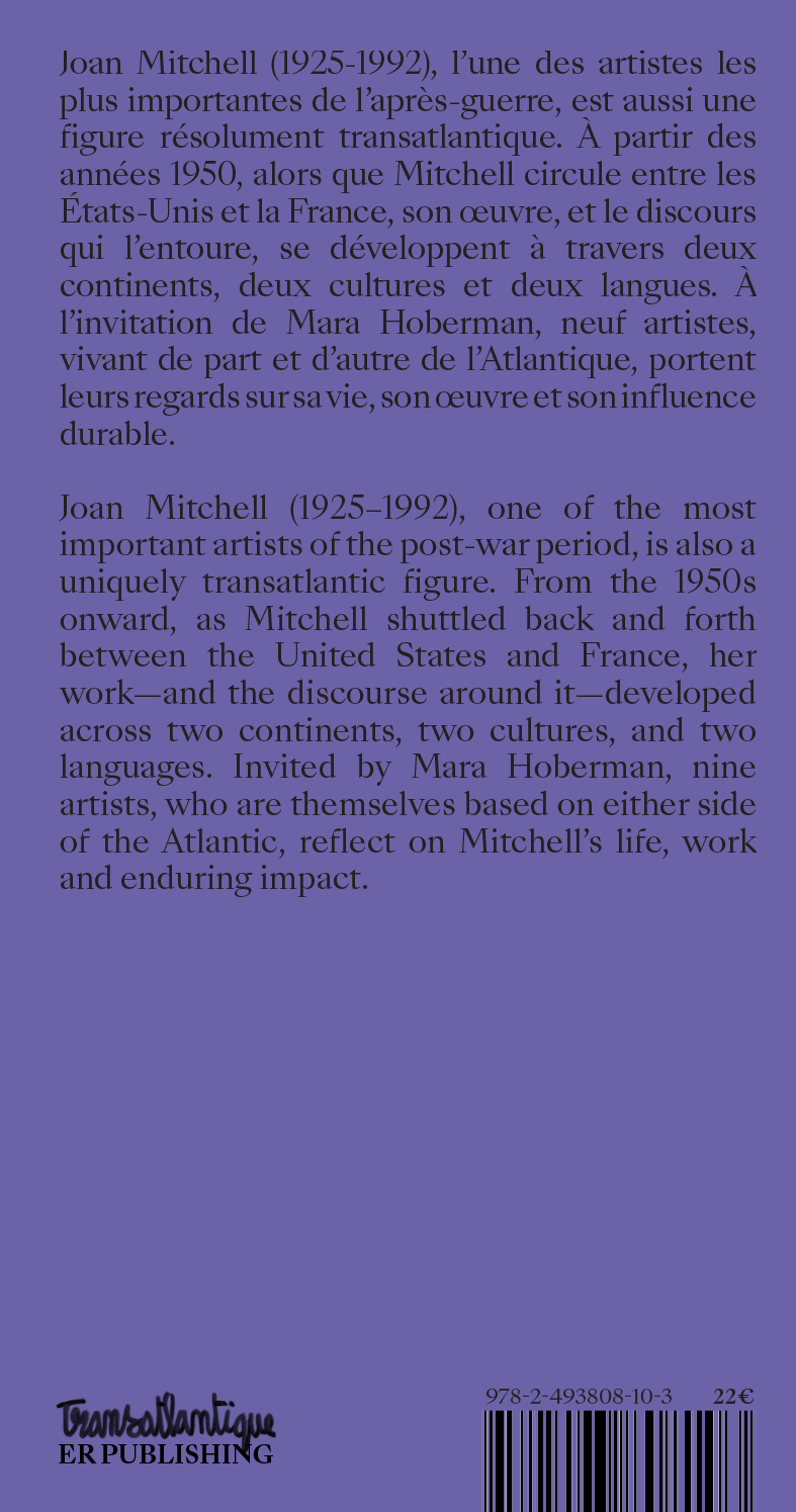 Joan Mitchell (1925-1992), l'une des artistes les plus importantes de l'après-guerre, est aussi une figure résolument transatlantique. À partir des années 1950, alors que Mitchell circule entre les États-Unis et la France, son œuvre, et le discours qui l'entoure, se développent à travers deux continents, deux cultures et deux langues. À l'invitation de Mara Hoberman, neuf artistes, vivant de part et d'autre de l'Atlantique, portent leurs regards sur sa vie, son œuvre et son influence durable.