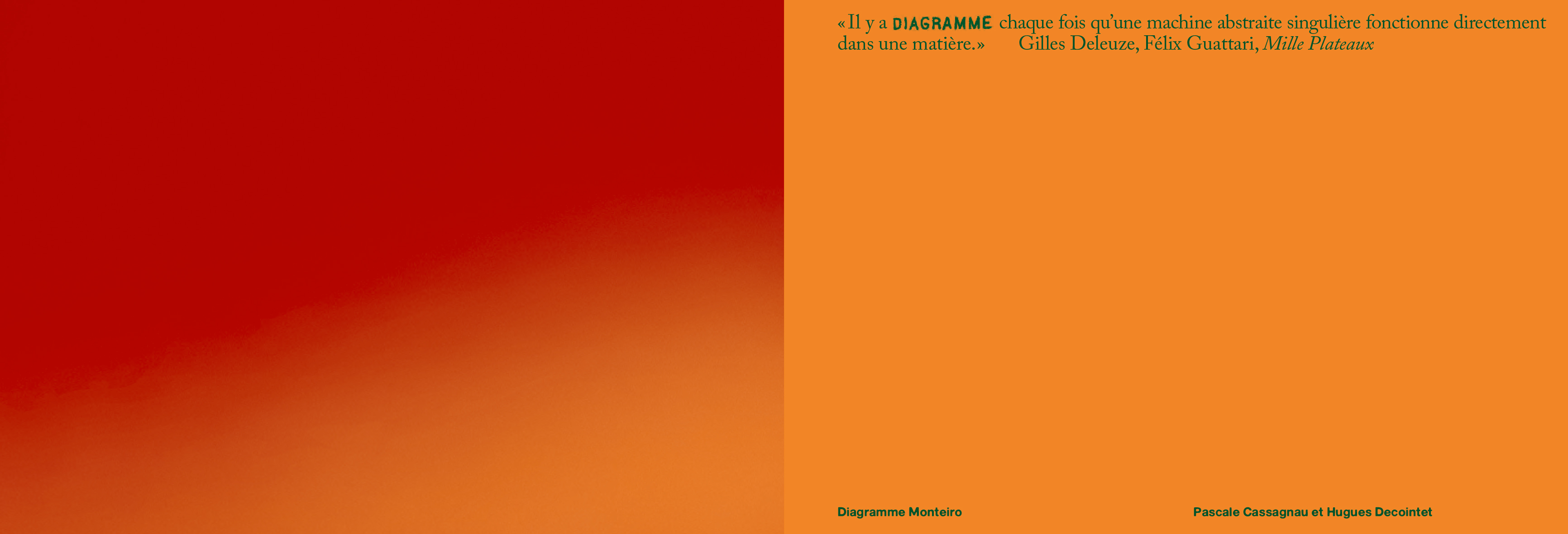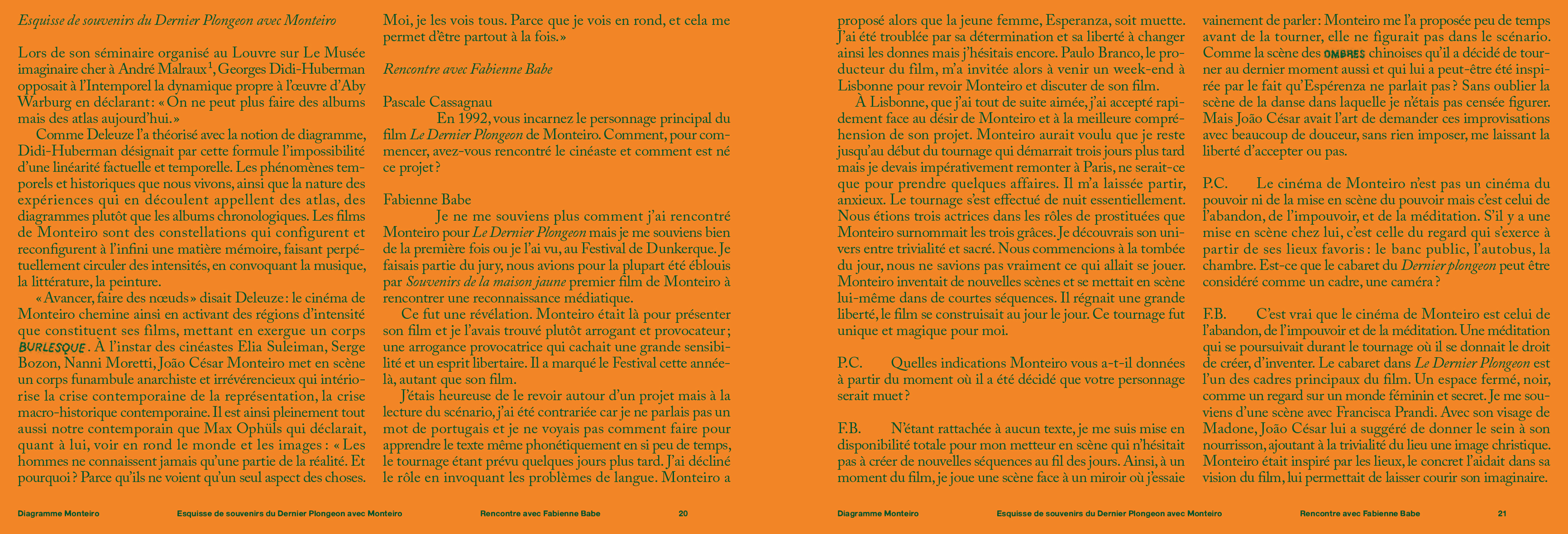 Le projet de livre atlas Diagramme Monteiro veut constituer une traversée dans le corpus des films-dispositifs de Monteiro à partir de la notion programmatique de diagramme et du regard de deux auteurs soutenus par le travail graphique de Manon Bruet sensible au montage, à la forme du sous-titre et à la notion de traduction.