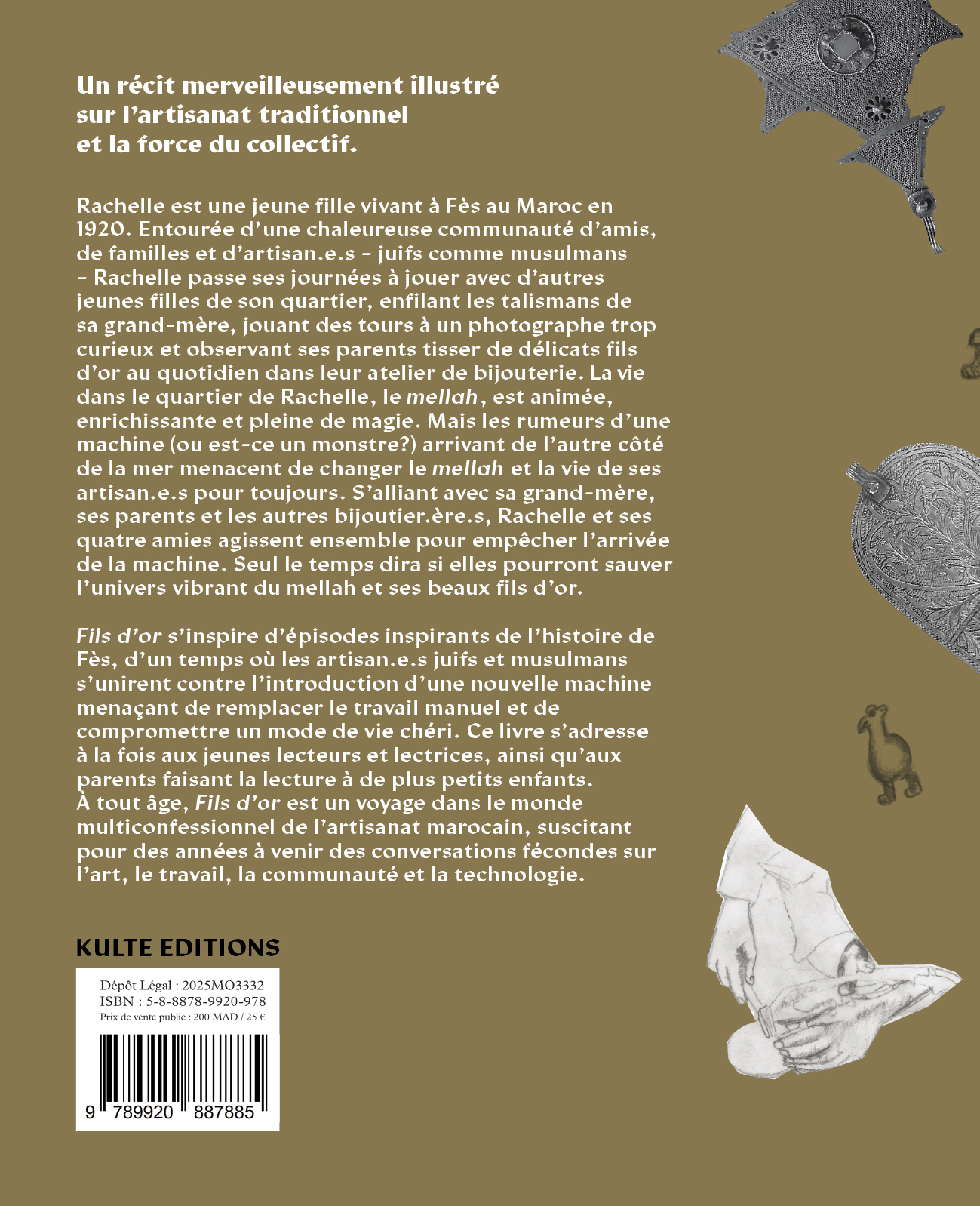L'ouvrage Fils d'or écrit par Ariella Aïsha Azoulay s'adresse à la fois aux jeunes lecteurs et lectrices et aux plus grands. Le récit, illustré par Hagar Ophir, s'inspire d'un temps où les artisan.es juifs et musulmans de Fès s'unirent pour protéger leur communauté vivant au sein du mellah, le quartier juif. Une histoire sur l'artisanat traditionnel et la force du collectif, pour raviver la mémoire d'un monde perdu.