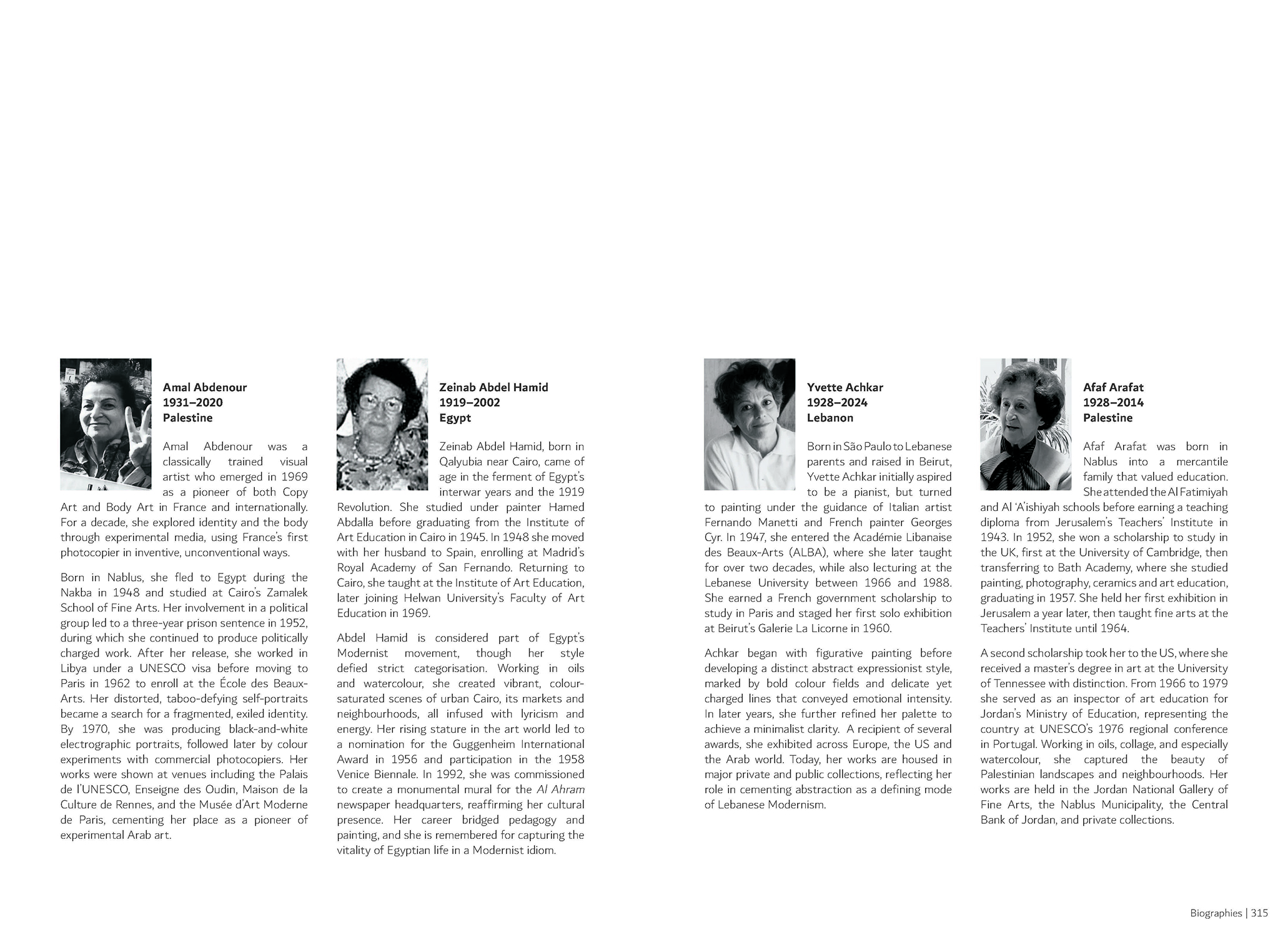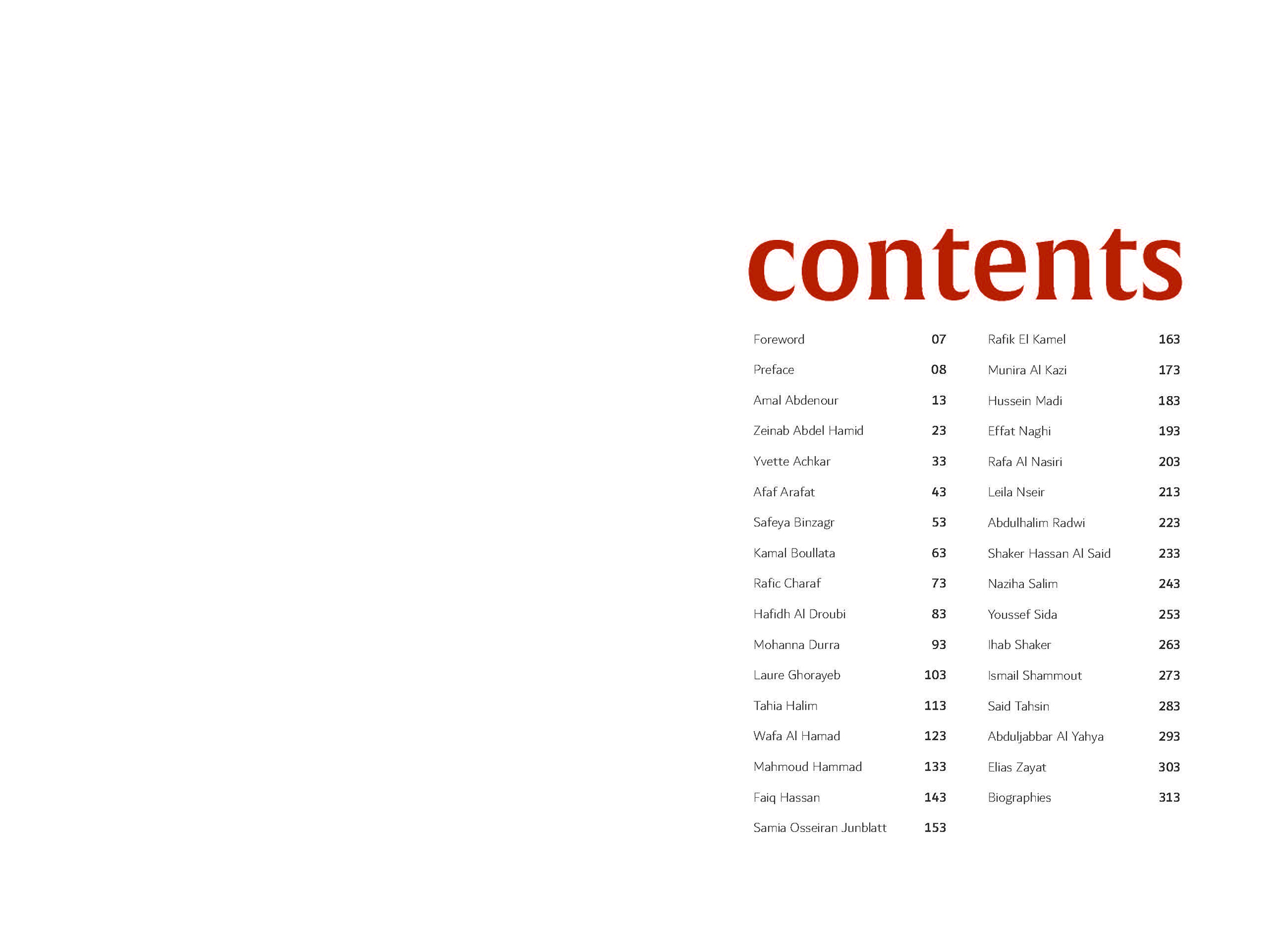 Essais sur Amal Abdenour, Zeinab Abdel Hamid, Yvette Achkar, Afaf Arafat, Safeya Binzagr, Kamal Boullata, Rafic Charaf, Hafidh Al Droubi, Mohanna Durra, Laure Ghorayeb, Tahia Halim, Wafa Al Hamad, Mahmoud Hammad, Faiq Hassan, Samia Osseiran Junblatt, Rafik El Kamel, Munira Al Kazi, Hussein Madi, Effat Naghi, Rafa Al Nasiri, Leila Nseir, Abdulhalim Radwi, Shaker Hassan Al Said, Naziha Salim, Youssef Sida, Ihab Shaker, Ismail Shammout, Said Tahsin, Abduljabbar Al Yahya, Elias Zayat.