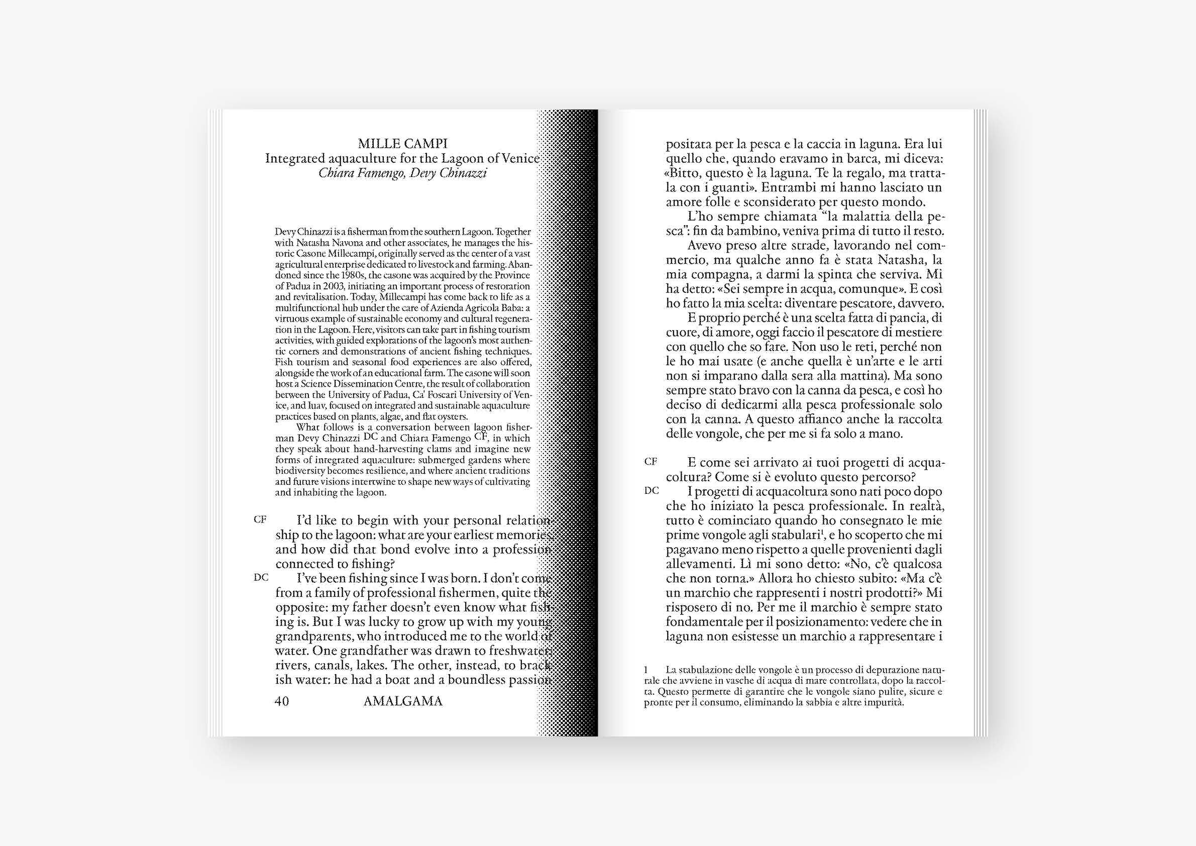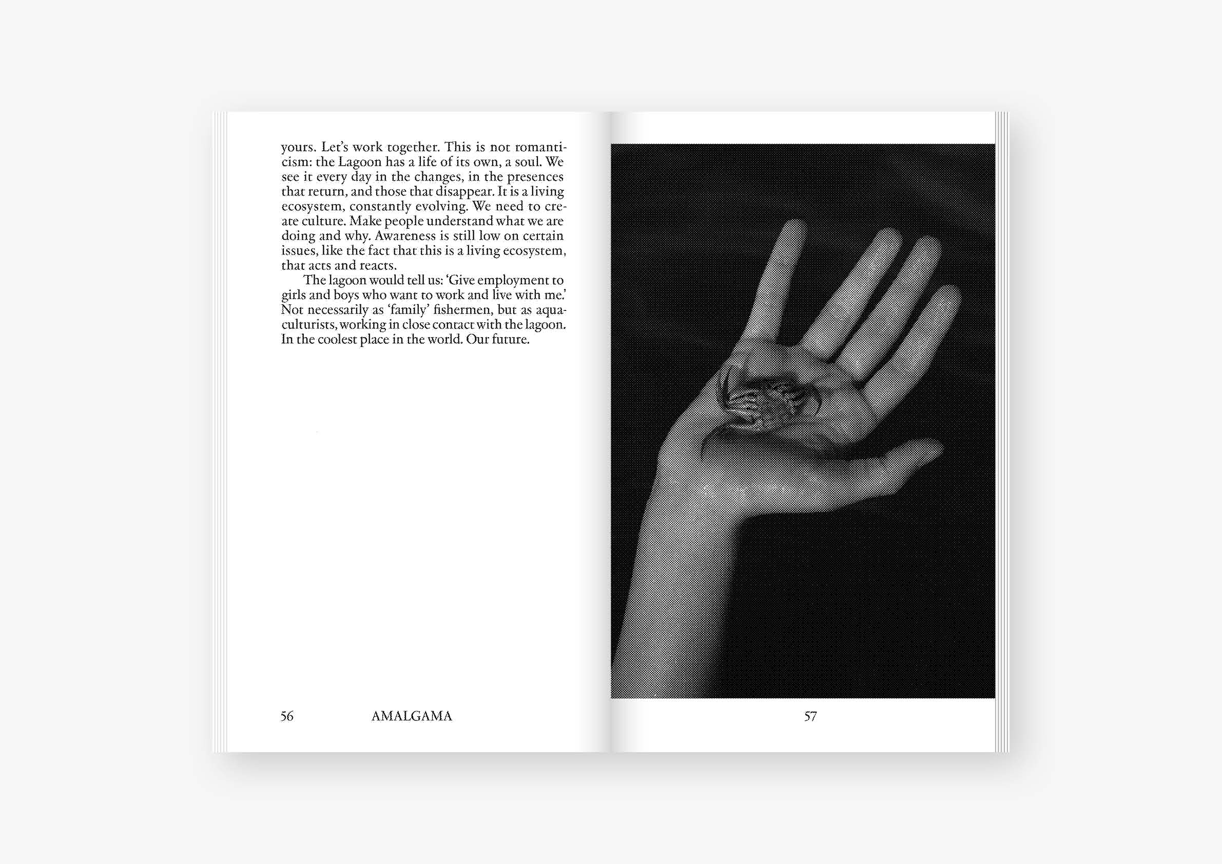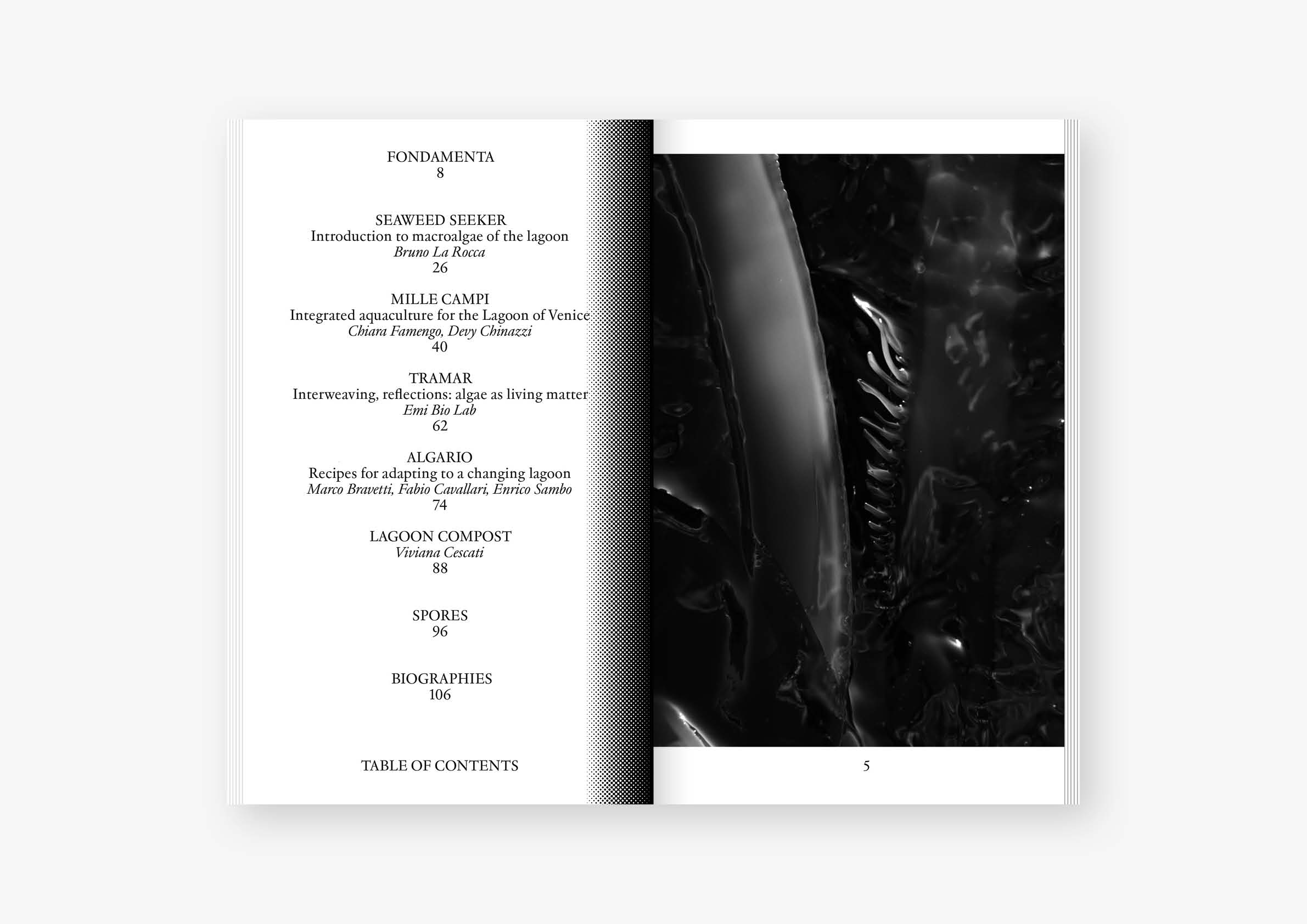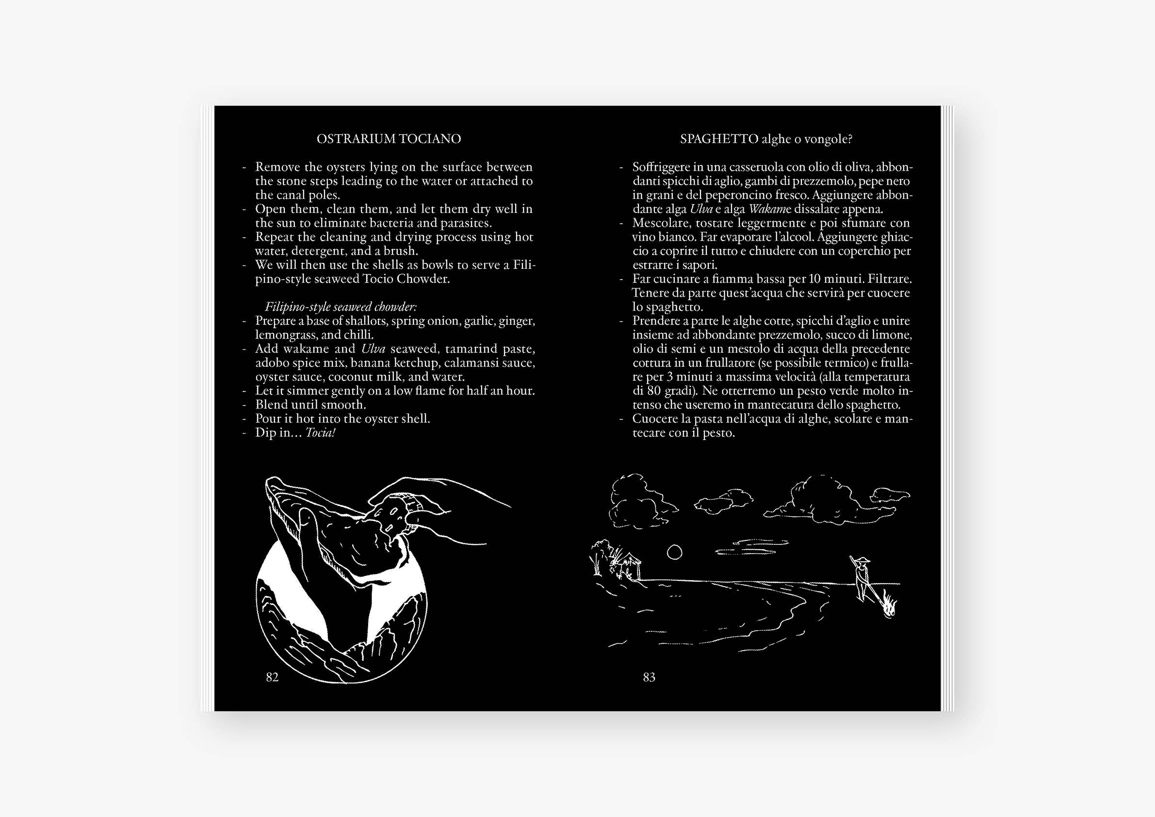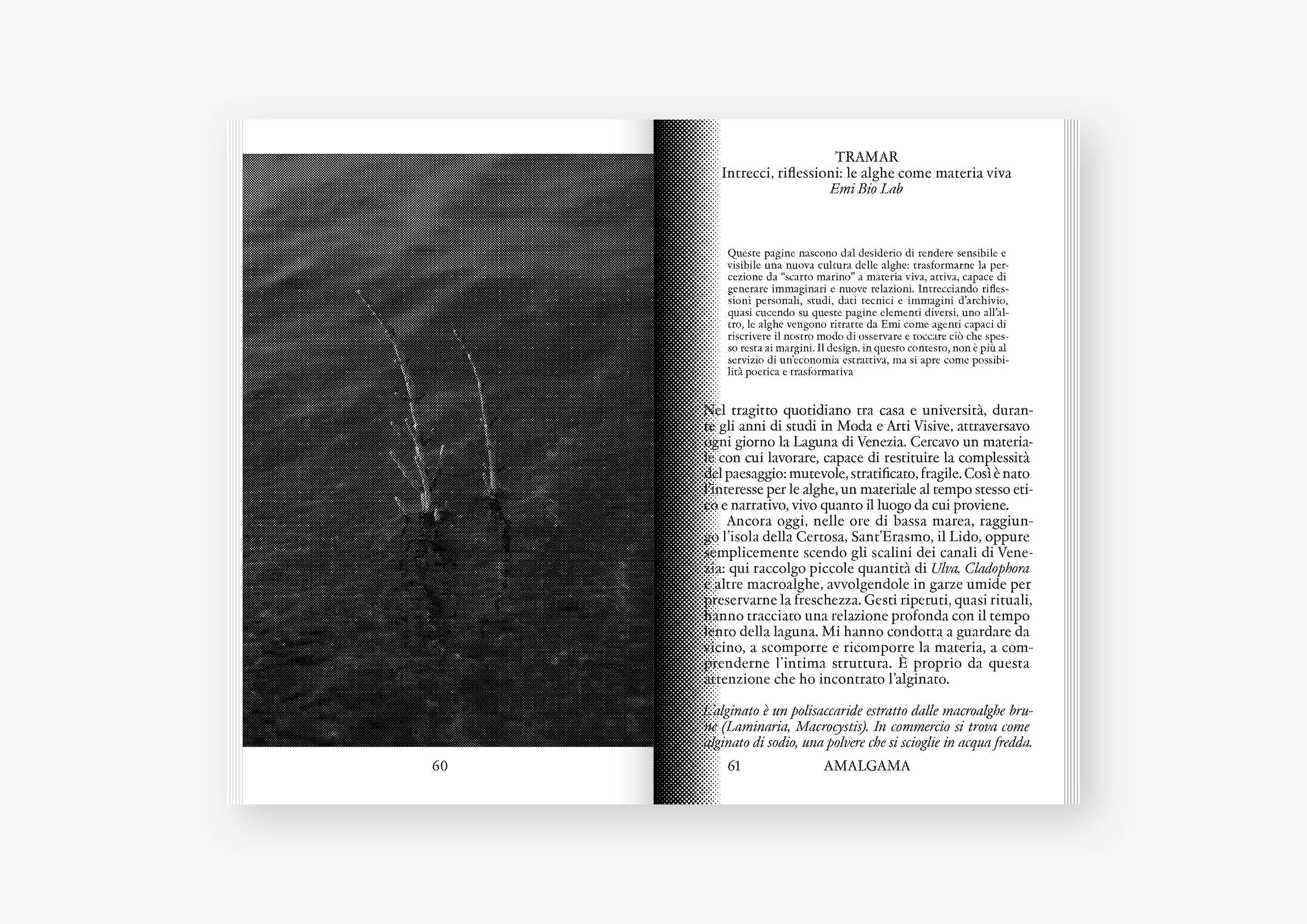 Amalgama is the outcome of the fourth edition of Convivial Tables, a field-based research project commissioned by TBA21–Academy for Ocean Space, dedicated to exploring the relationships between food and ecology, and their impact on bodies of water. Curated by Chiara Famengo with Barena Bianca and Tocia! Cucina e comunità—the curatorial board of Convivial Tables IV: Shifting Landscapes—the book revisits and deepens the conversations that shaped the program. Through different methodological and disciplinary perspectives, Amalgama is grounded in the belief that, in the face of a constantly changing landscape—shaped by human activity and climate change – it is necessary to reconsider our daily practices. The act of "amalgamating" becomes an opening gesture: integrating what might appear foreign to our traditions in order to consciously inhabit ongoing transformations. In the lagoon environment, seaweed emerges as a symbol of these shifts. As highlighted in the volume, seaweed is "a consequence, not a problem" to be reinterpreted as a resource capable of nourishing crops, tables, and bodies. The contributions—both visual and textual – weave together local knowledge and contemporary visions, suggesting new forms of cultural adaptation to a constantly transforming environment and to climate change.