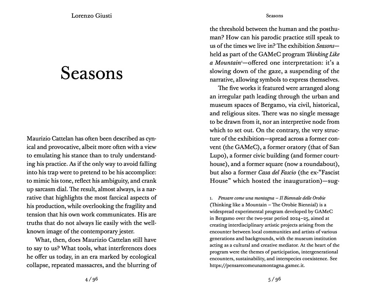 À l'occasion de Seasons, l'exposition de Maurizio Cattelan à la GAMeC, l'historienne de l'art Lisa Parola réfléchit à la manière dont l'art contemporain peut redéfinir la notion de monument, tandis que Lorenzo Giusti, commissaire de l'exposition, accompagne l'essai par une analyse des œuvres.