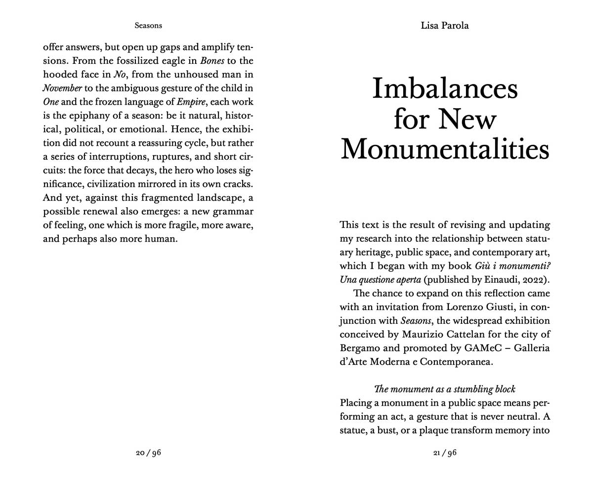 On the occasion of Seasons, Maurizio Cattelan's exhibition at GAMeC, art historian Lisa Parola, investigates how contemporary art can redefine the idea of the monument: no longer an immobile place of celebration, but a critical space of removal and transformation, promoting new relationships with both history and the present.