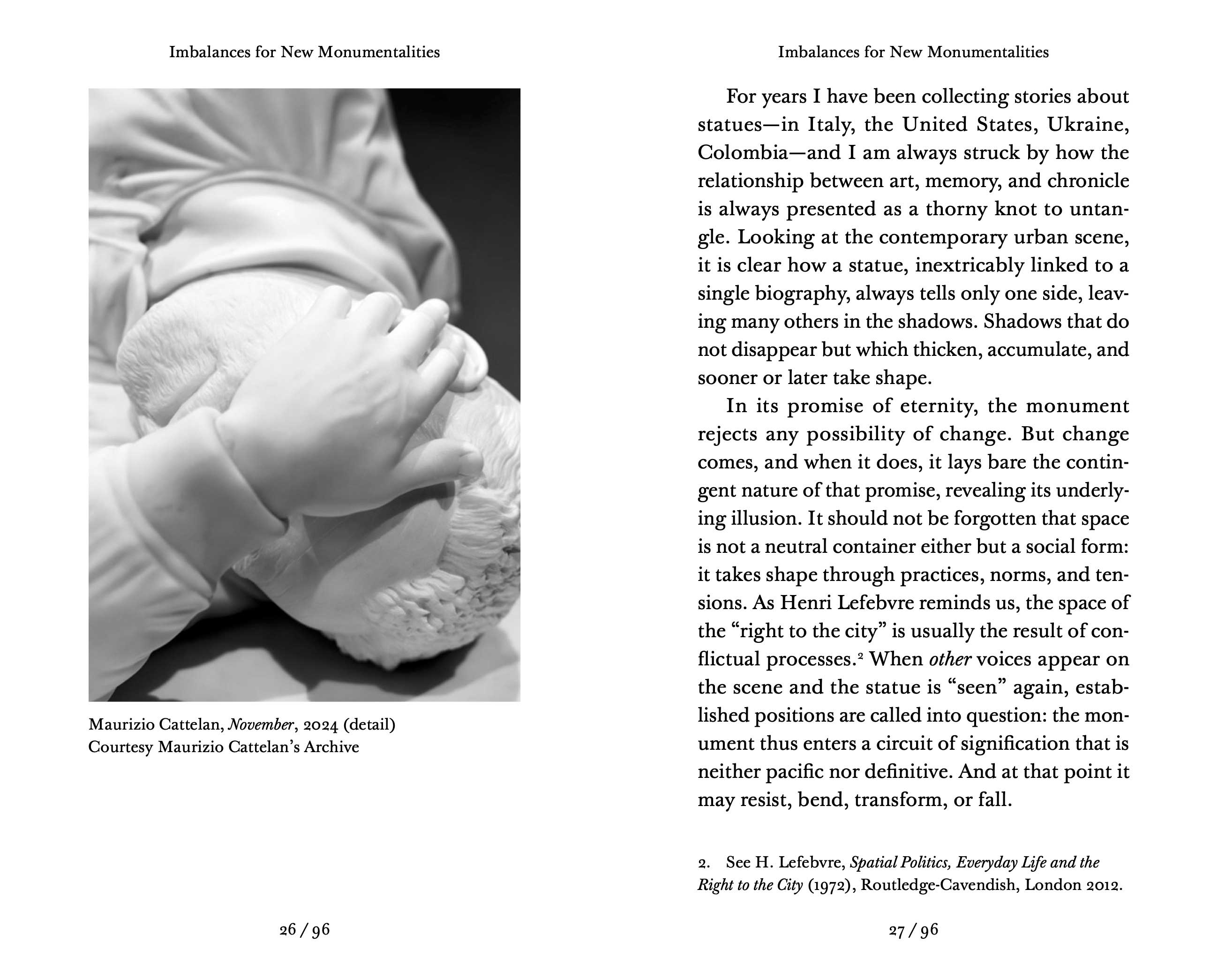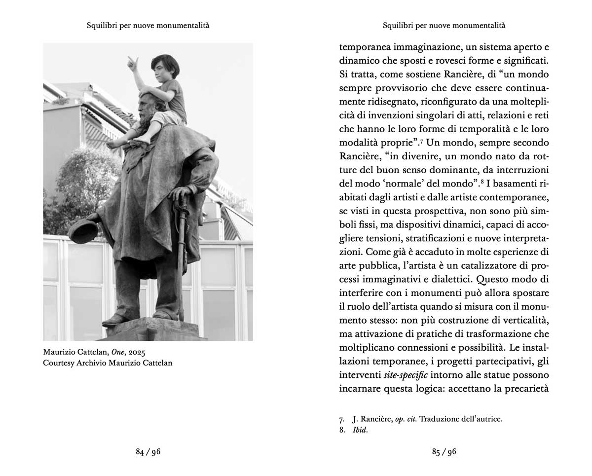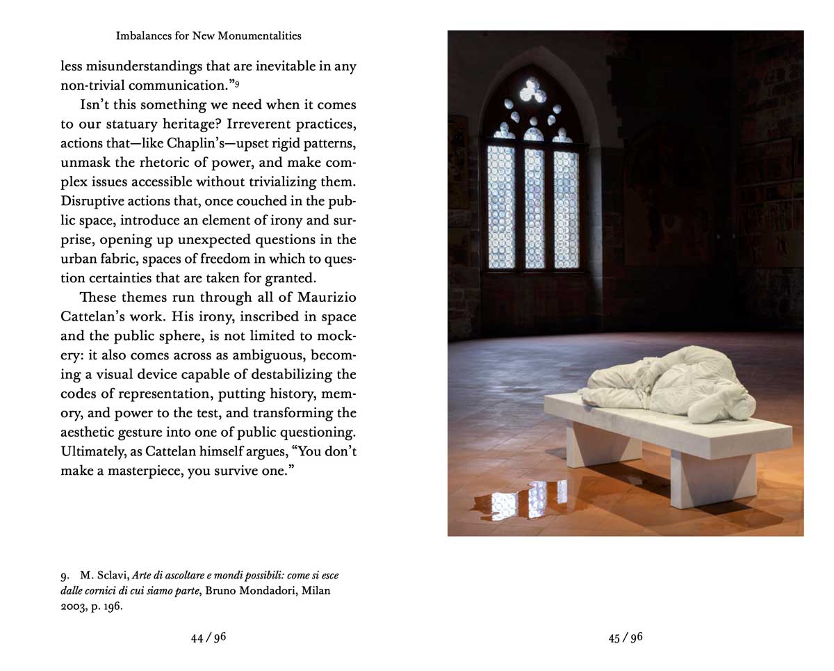 Parola reflects on the changing concept of the monument and how cultural institutions choose to deal with layered and sometimes contradictory symbols. Lorenzo Giusti, curator of the exhibition, accompanies the essay with an insight on the works presented in order to show how, in Cattelan's work, symbols stratify, shift, and contradict each other. How the imperial eagle becomes a vulnerable body; how the nineteenth-century statue dedicated to Garibaldi is turned into a pedestal for something else. Who? A grandson on his grandfather's shoulders? A new Garibaldian? Or a little vandal mocking ancient values? By so doing, he notes how between history and nature, cracks, fractures, and new possibilities may be opened up.