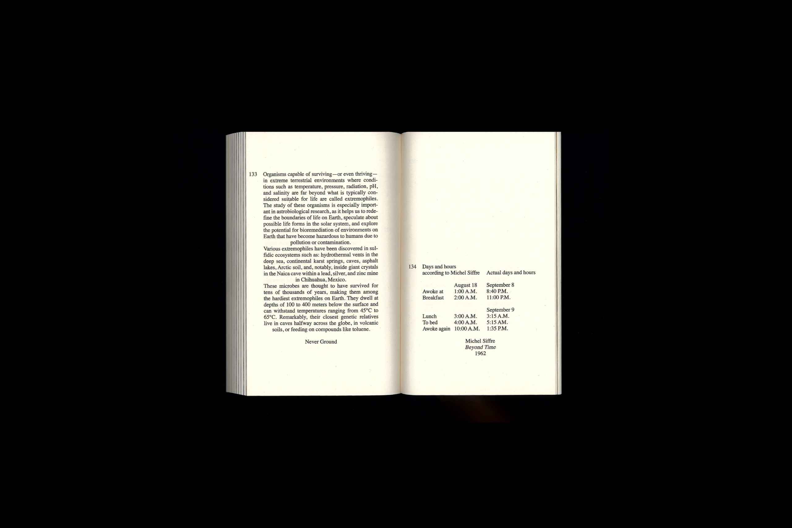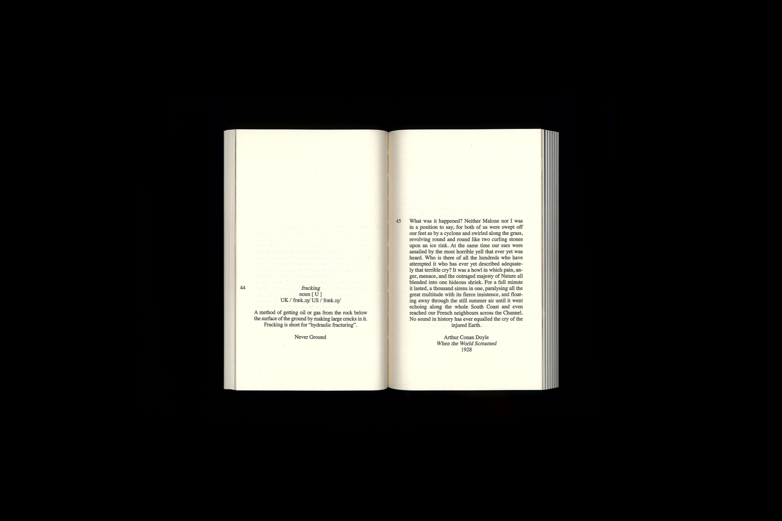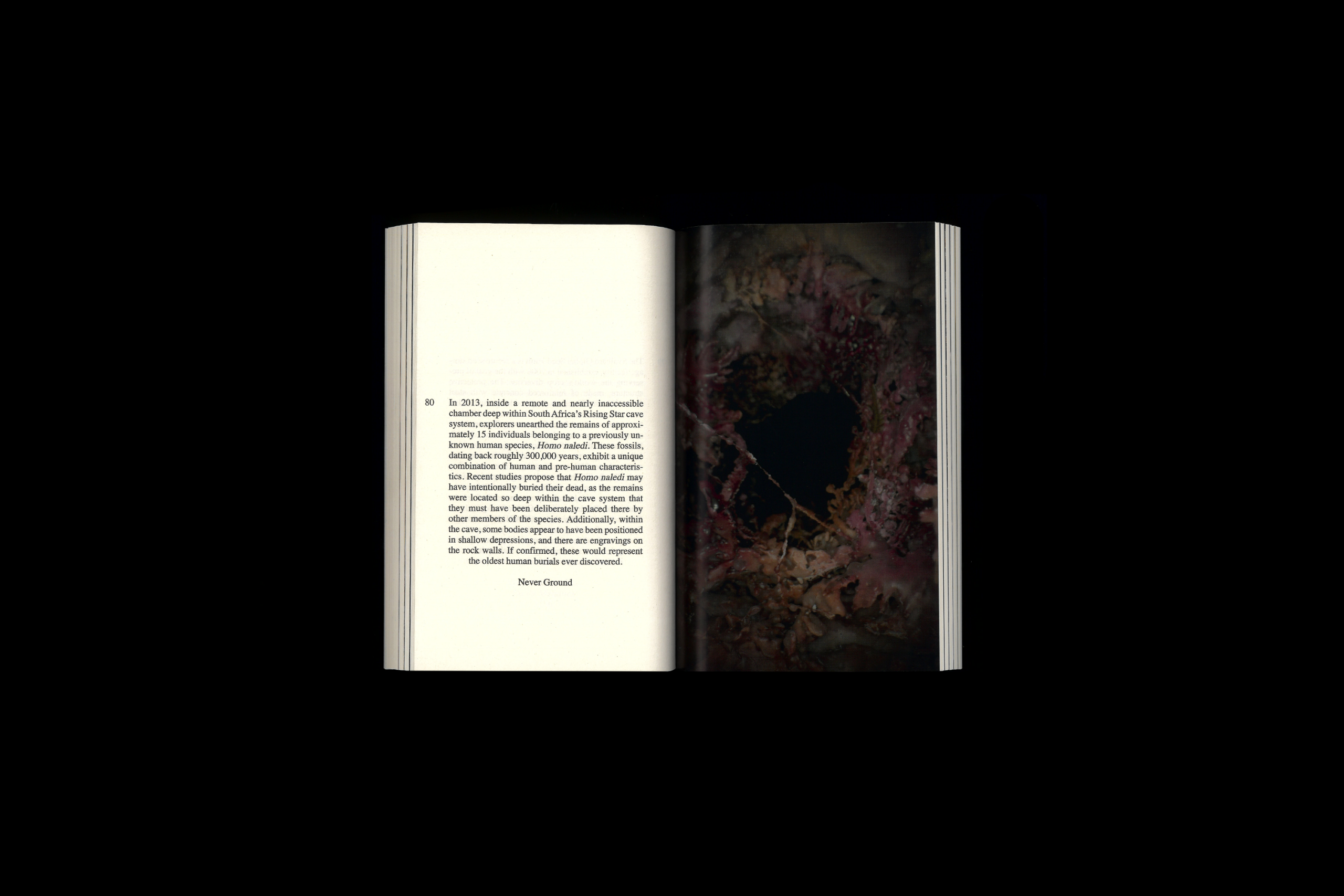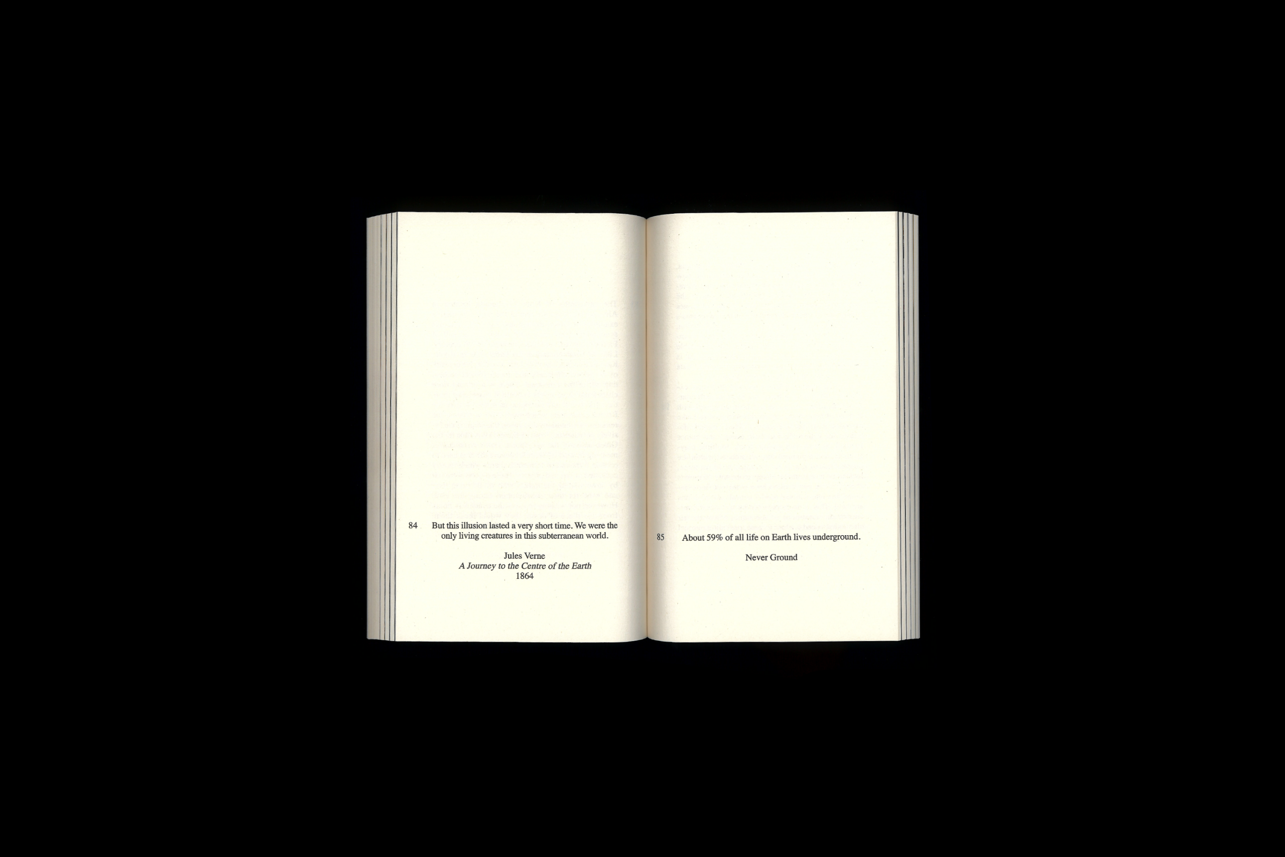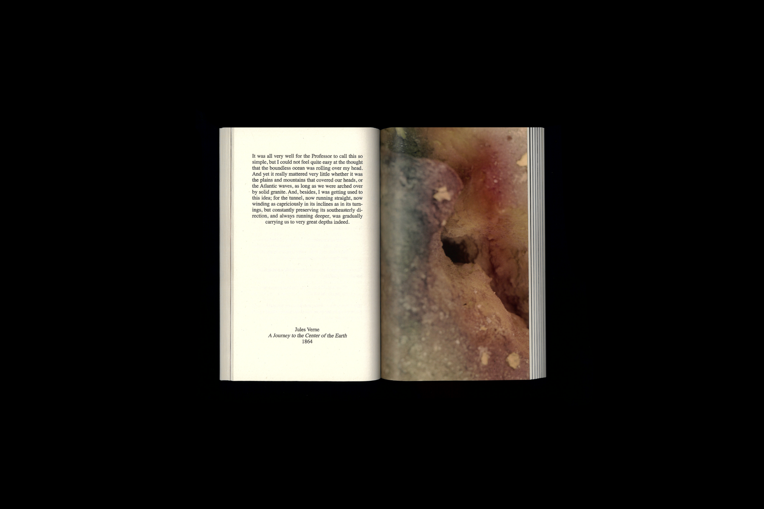 Un livre d'artiste composé de fragments de textes issus de différentes époques et contextes – littéraires, science-fiction, philosophiques, scientifiques – tous centrés sur le thème du monde souterrain.