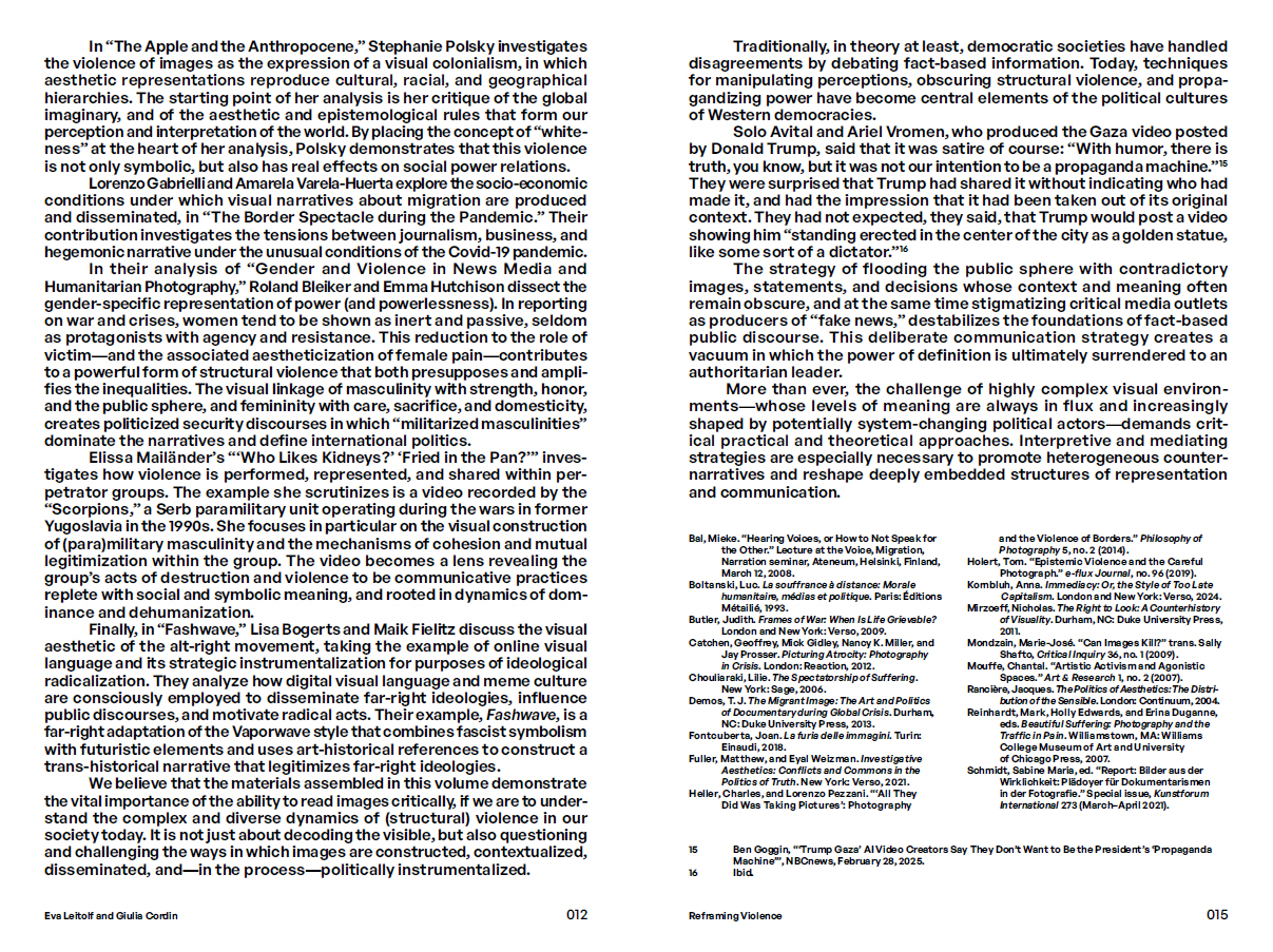 Les images reflètent et exercent la violence : l'IA imite la photographie de guerre à Gaza ; les clichés pris à Abu Ghraib deviennent un mème partagé dans le monde entier ; la surveillance s'étend grâce à la production et à l'analyse automatisées d'images ; les images sexistes continuent d'imprégner la publicité et le divertissement. Les images violentes font partie de notre vie. Elles façonnent notre perception du monde. Elles peuvent représenter directement la violence, ou leur potentiel violent peut être associé à leur production, leur diffusion ou leur utilisation.
