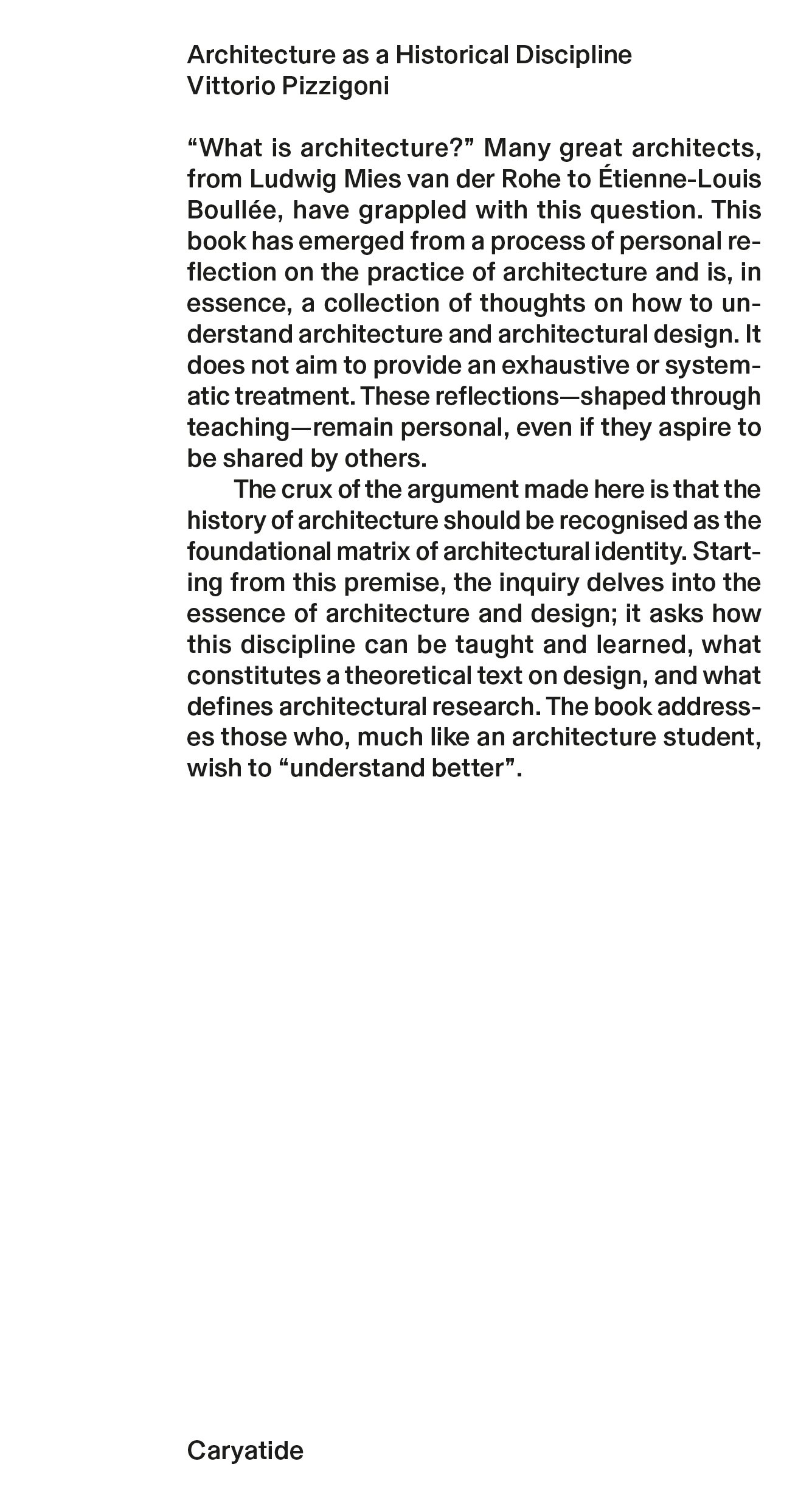 « Qu'est-ce que l'architecture ? » De nombreux grands architectes, de Ludwig Mies van der Rohe à Étienne-Louis Boullée, se sont confrontés à cette question. Ce livre est issu d'un processus de réflexion personnelle de l'auteur sur la pratique de l'architecture et constitue un ensemble de pensées sur la manière de comprendre l'architecture et le projet architectural. Il ne prétend pas offrir un exposé exhaustif ni systématique. Ces réflexions – façonnées par l'enseignement – demeurent personnelles, même si elles aspirent à être partagées par d'autres.