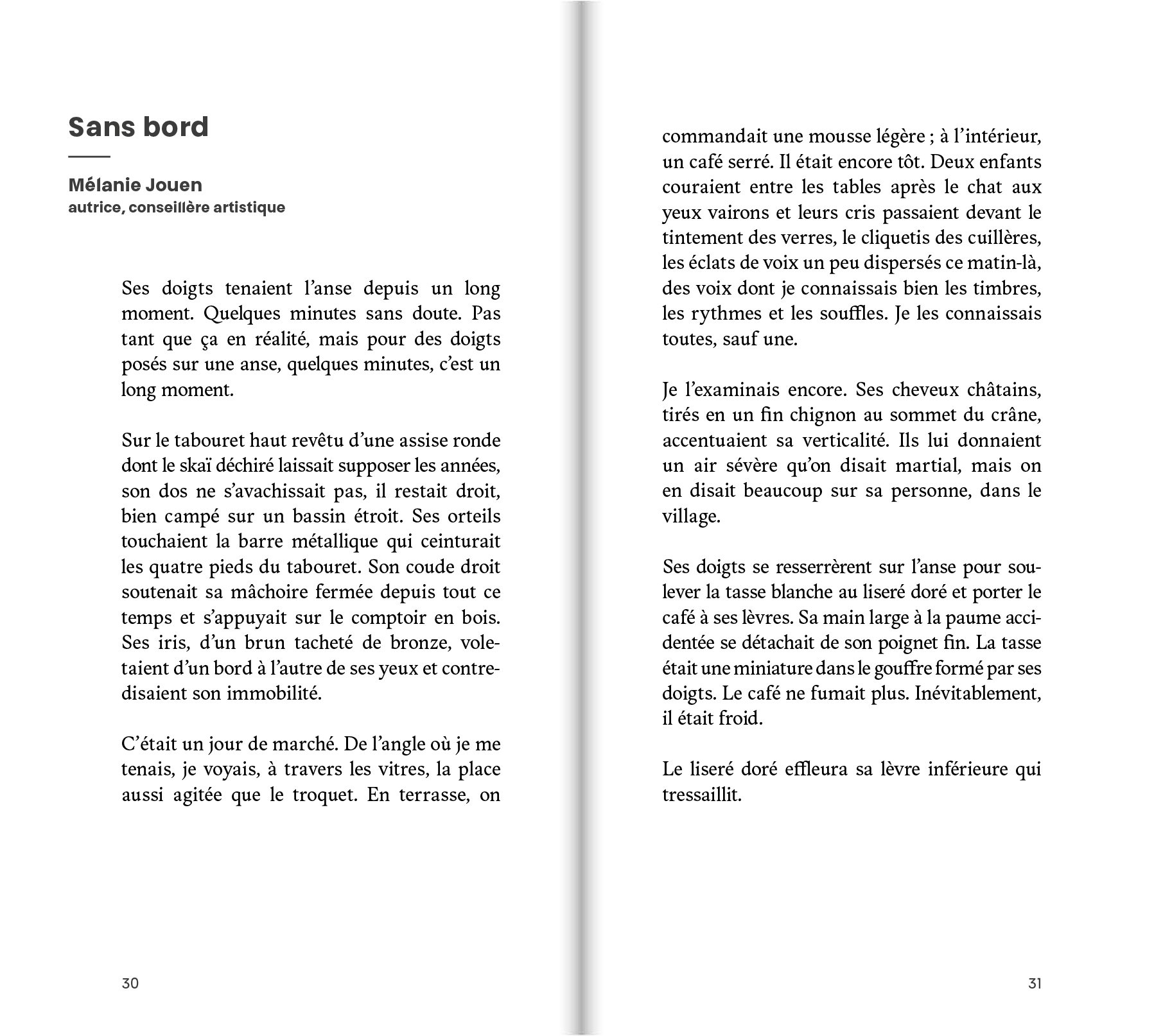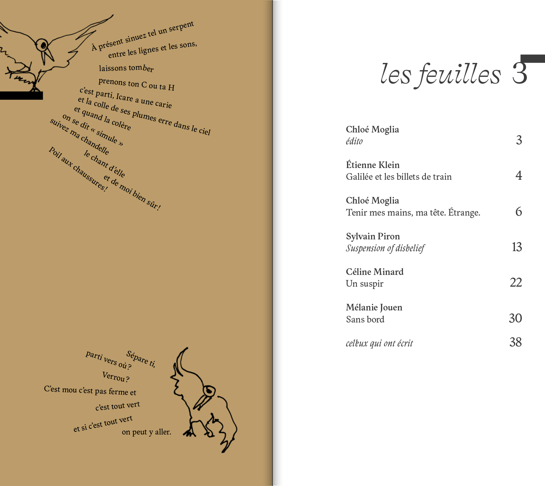 Pour le troisième numéro des Feuilles, l'artiste « suspensive » Chloé Moglia invite Florence Boudet, Mélanie Jouen, Étienne Klein, Céline Minard et Sylvain Piron à écrire avec elle ce que le geste de se tenir au-dessus du vide engendre comme senti et pensée, et nous invite à suspendre nos perceptions du réel.