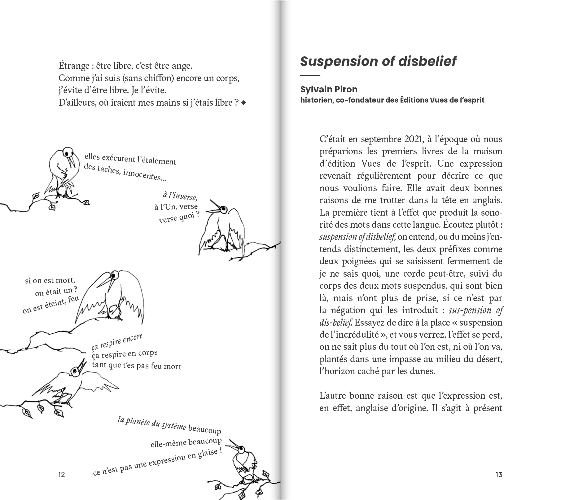 Qu'il s'agisse de l'élévation des bipèdes, du déplacement de la Spirelle ou du chant d'elle comme chandelle, il est ici question de suspendre nos perceptions du réel.