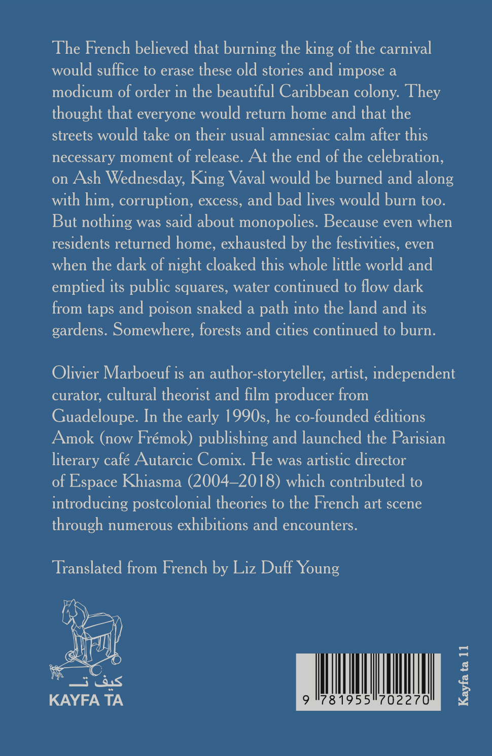 « The French believed that burning the king of the carnival would suffice to erase these old stories and impose a modicum of order in the beautiful Caribbean colony. They thought that everyone would return home and that the streets would take on their usual amnesiac calm after this necessary moment of release. At the end of the celebration, on Ash Wednesday, King Vaval would be burned and along with him, corruption, excess, and bad lives would burn too. But nothing was said about monopolies. Because even when residents returned home, exhausted by the festivities, even when the dark of night cloaked this whole little world and emptied its public squares, water continued to flow dark from taps and poison snaked a path into the land and its gardens. Somewhere, forests and cities continued to burn. »