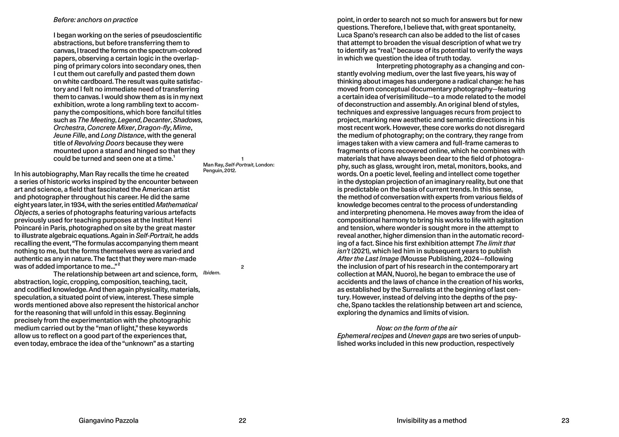 Basé sur l'exposition de Luca Spano « La forme de l'air » organisée à l'Institut culturel italien de Montréal, l'ouvrage rassemble des photographies réalisées par l'artiste en chambre noire ainsi que des objets, entre formes semi-abstraites évocatrices, réinterprétations de conversations tenues dans le cadre du programme BRaIN de l'Institut de Recherche du Centre universitaire de santé McGill, et inserts métalliques qui enrichissent la matérialité de l'installation en expérimentant les liens entre image, texte et surface. Le projet interroge les mécanismes de génération des images dans le cerveau humain, invitant à réfléchir à leurs formes possibles, tout en mettant en relation ce processus avec le logos en tant qu'élément central dans la construction de la connaissance du réel.