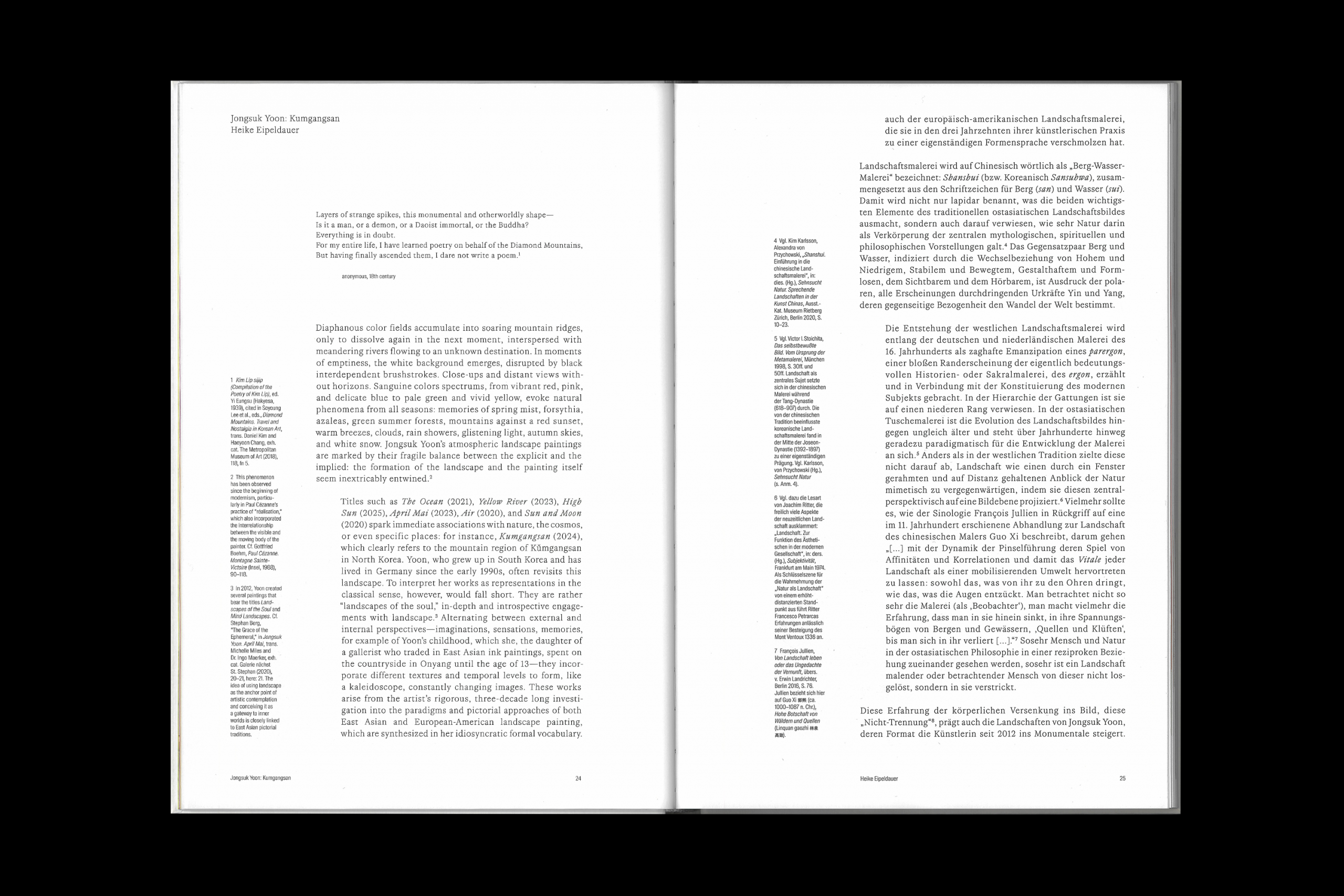 Les essais de Heike Eipeldauer et Adam Budak, ainsi qu'une conversation entre Jongsuk Yoon et Hans Ulrich Obrist, permettent de mieux comprendre le travail de l'artiste et de situer sa position unique dans l'art contemporain.