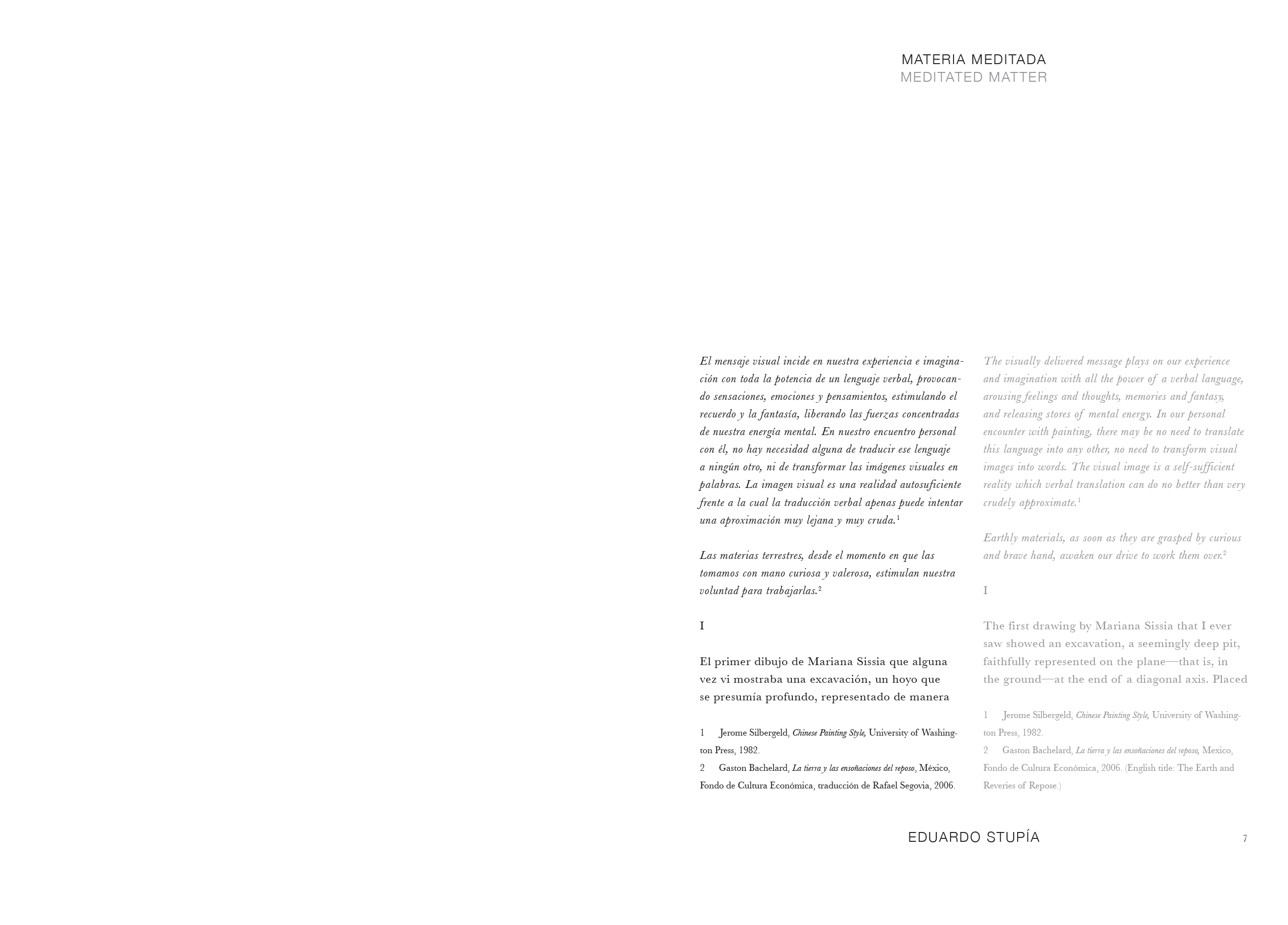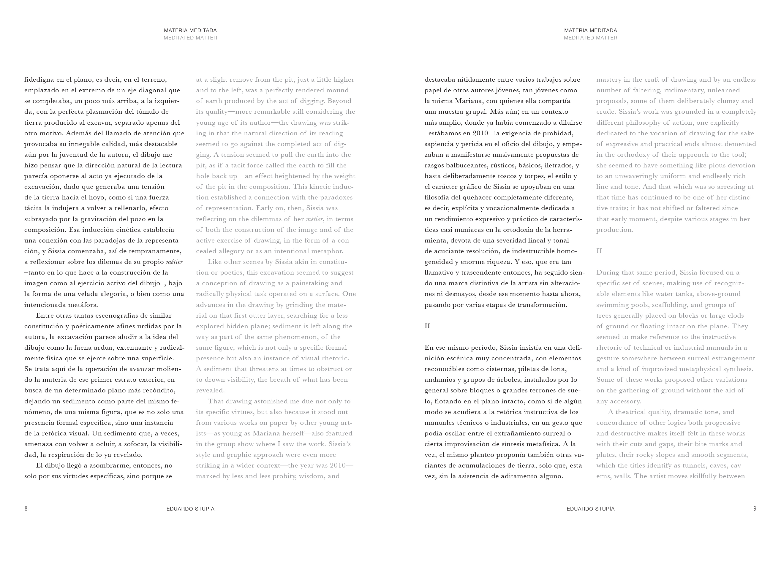 Les dessins tracent un parcours allant d'une figuration aux prétentions narratives vers une abstraction sensible. Le dessin y apparaît comme un exercice méditatif, la manifestation d'un état mental inscrit dans la durée. Deux textes – de l'artiste argentin Eduardo Stupía et de Nova Benway, du Drawing Center de New York – accompagnent cette délicate publication