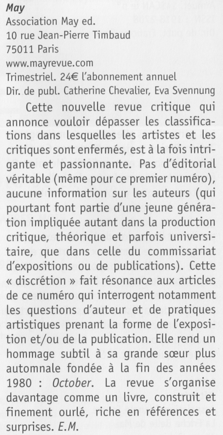 Lancée en 2009 à Paris, la revue May examine, une à deux fois par an, pratiques et théories de l'art, ainsi que les stratégies, les contextes ou les problématiques dont elles procèdent – une critique à l'œuvre aussi bien dans les textes que dans d'autres formes artistiques. La revue publie des essais, entretiens, interventions et comptes rendus d'exposition réalisés par des artistes, des écrivain.es, et divers intervenant.e.s  du monde de l'art.