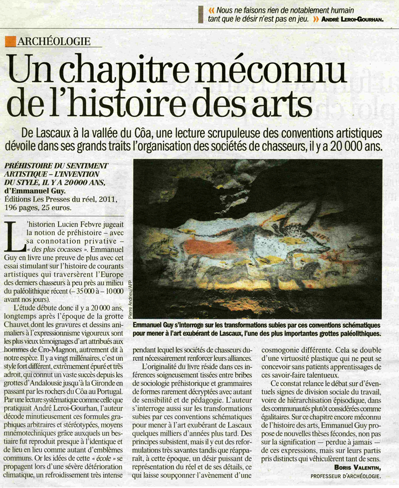 préhistoire de l'art : le premier essai à poser un regard artistique sur l'art paléolithique, en décryptant minutieusement ses partis pris formels et ses évolutions stylistiques. L'étude d'une véritable école artistique, fondée sur des canons stricts, témoignant d'une histoire culturelle de l'homme préhistorique – d'une symbolique commune à des populations très éloignées –, qui se dessine à travers l'histoire « visuelle » de ses représentations.