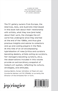 Cet ouvrage rassemble des entretiens avec 51 directeurs de galeries d'Europe, d'Amérique et d'Asie. Ceux-ci parlent de leurs relations avec les artistes, de ce qu'ils aiment (et ce qu'ils détestent) dans leur travail, des changements que le monde de l'art a connu depuis la fin des années 1980. A une époque où la répartition des rôles traditionnelle entre critiques, conservateurs, marchands, artistes, commissaires, etc., est largement remise en question, les témoignages des acteurs et observateurs privilégiés que sont Air de Paris (Paris), Gavin Brown's Enterprise (New York), Massimo De Carlo (Milan), Greene Naftali (New York), Hotel (London), Kurimanzutto (Mexico), Franco Noero (Turin), Eva Presenhuber (Zurich), Johann König (Berlin) ou encore Vitamin (Pékin) constituent un aperçu inédit du marché de l'art aujourd'hui.