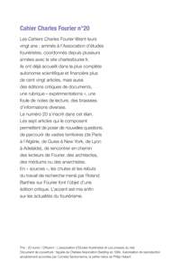 Cahiers Charles Fourier accueillent chaque année, depuis 1990, dans la plus complète autonomie scientifique et financière, des articles, des éditions critiques de documents, une rubrique « expérimentations », des notes de lecture et des informations diverses.