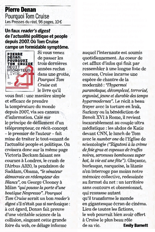 Le récit prompteur Pourquoi Tom Cruise est une ligne, un flux qui s'inspire, pour la forme, du mode de défilement en continu des titres et dépêches d'agences de presse sur les écrans des chaînes d'information. Écrit sur un mode narratif, constitué d'éléments provenant des fils d'actualité du web – haut lieu de la fiction –, d'emprunts à la littérature, de références au cinéma, à la musique et à l'art mais aussi de tout un contexte fictionnel original, il se caractérise par la prévisibilité des contenus, renvoie sans cesse à son déjà-dit. Figure du récit – et non sujet –, Tom Cruise y incarne l'hypermoi paranoïaque, décomplexé, terrorisé, organisé, jeune et durable des temps hypermodernes. Un hypercruise, pour un hypersonnage, marque absolue d'une « modernité élevée à la puissance superlative », mais aussi masque derrière lequel l'auteur écrit son propre chant.