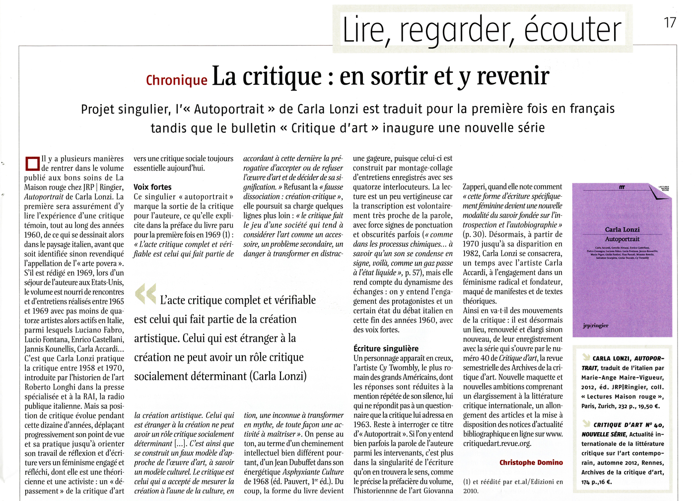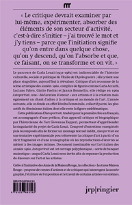 Première traduction en français de l'ouvrage de Carla Lonzi, document inestimable sur l'art italien des années 1960, paru pour la première fois en 1969 avant d'être oublié très vite, sans doute aussi en raison du fait que son auteure décida d'abandonner l'activité de critique d'art pour l'engagement féministe radical.