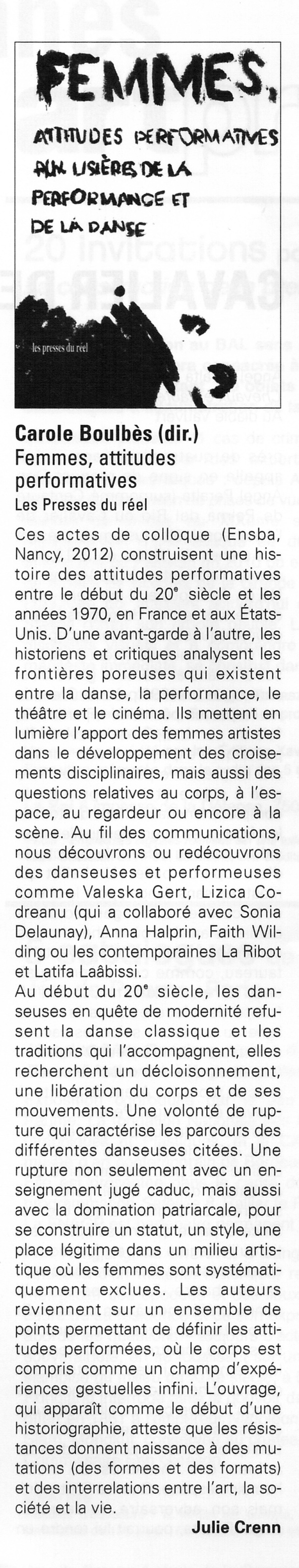remakes des performances historiques, il semblait important de s'interroger sur la place des femmes dans les avant-gardes des années 1910-1970. Quel regard portons-nous, aujourd'hui, sur les pionnières qui ont profondément modifié la danse et la performance, en Europe et aux Etats-Unis ? Réunis pour la première fois, des historiens, des philosophes, des danseurs et deux chorégraphes ont accepté de faire le point sur leurs recherches. Par-delà les catégories artistiques (danse, performance, action, pantomime, théâtre, music-hall...) et les clivages (théorie / pratique ; forme / fond), ce livre est une invitation à partager leurs questionnements sur le spectacle vivant « au féminin », ses archives et ses références.