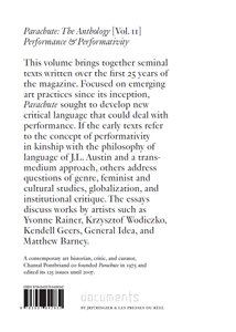 Parachute a cherché, depuis sa création, à développer un nouveau discours critique permettant d'appréhender les pratiques artistiques émergentes. Le second volume de l'anthologie rassemble des textes fondateurs publiés au cours des 25 années d'activité de la revue qui ont permis de penser la performance. Si les tous premiers textes font référence à la notion de performativité en lien avec la philosophie du langage de J.L. Austin et dans le cadre d'une approche transdisciplinaire, d'autres la mettent en perspective avec le concept de genre, avec le féminisme et les cultural studies, avec la mondialisation et la critique institutionnelle, à travers l'analyse des travaux d'artistes tels que Yvonne Rainer, Krzysztof Wodiczko, Kendell Geers, General Idea ou Matthew Barney.