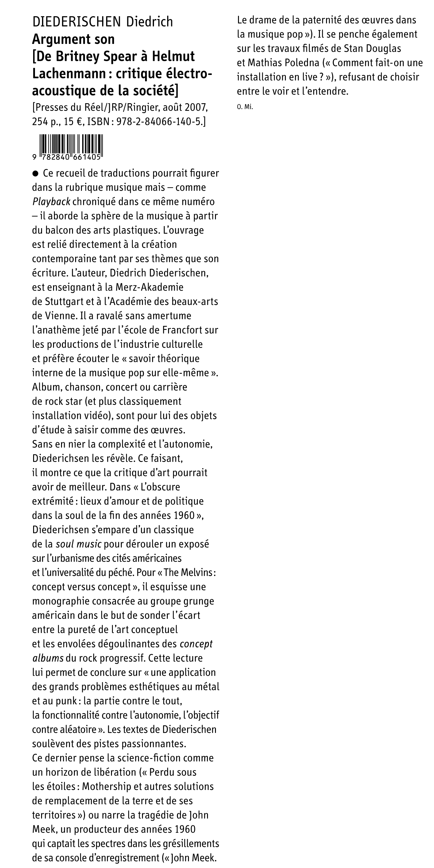 Contrairement aux apparences, la manière de recevoir la musique est essentiellement une manière de recevoir le monde qui nous entoure, de l'accepter aveuglément ou de le refuser obstinément, de le réfléchir ou pas, d'être actif ou passif face à lui. Le premier intérêt des textes de Diedrich Diederichsen, un intérêt primordial, est sans conteste de briser le mur de l'évidence musicale et de réinsérer les questionnements que contiennent en germe des musiques auxquelles on refuse souvent d'accorder une réelle teneur, que ce soit par indifférence, par mépris envers ce que l'on considère comme une musique légère ou inférieure, ou encore par admiration, une admiration qui confine à l'identification muette. Diederichsen, lui, se met à l'écoute de ces musiques – jazz, rock, pop, rap, techno, musique contemporaine – réellement, passionnément et, précisément parce que cette écoute est passionnée, il entend ce que ces musiques portent en elles : quant à leur fabrication, quant aux images qu'elles coagulent, quant aux connexions multiples qu'elles établissent avec divers aspects de la culture et de la société. Expliciter ces contenus sans simplifier ou schématiser les choses, respecter les objets questionnés dans leur complexité, tenter de rendre compte des multiples dimensions, parfois contradictoires, qui font la richesse de ces musiques : l'auteur s'est fixé là une tâche difficile. Voilà pourquoi ses textes peuvent parfois paraître complexes, mais voilà aussi ce qui, toujours, en fait l'intérêt, car ils nous parlent et nous interrogent jusqu'à nos positions personnelles les plus intimes.