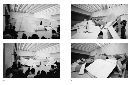 Carlos Bunga (né en 1976 à Port, vit et tarvaille à Barcelone) est connu pour ses grandes installations architecturales dans lesquelles il utilise principalement des matériaux fragiles et périssables (carton, rubans adhésifs, peintures), structures qu'il détruit parfois ensuite dans le cadre de performances ou avant même le vernissage de l'exposition. Construites au fil des semaines, ses projets in situ créent un véritable dialogue avec l'architecture environnante. Le travail de Carlos Bunga intègre également des éléments vidéo, des sculptures et des dessins.