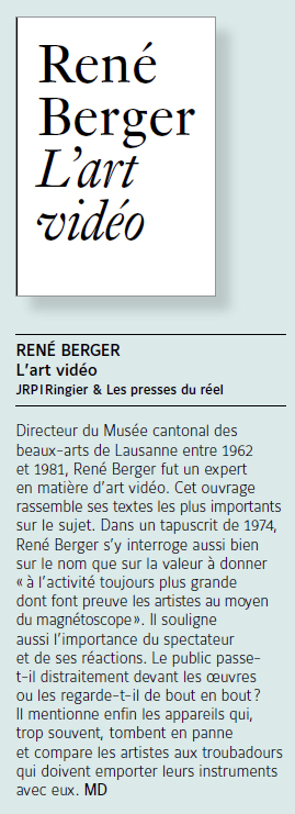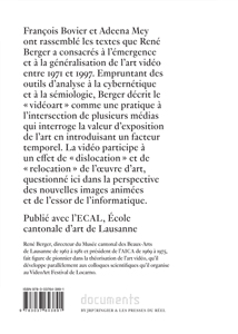 François Bovier et Adeena Mey ont rassemblé les textes que René Berger a consacrés à l'emergence et à la généralisation de l'art vidéo entre 1971 et 1997. Empruntant des outils d'analyse à la cybernétique et à la sémiologie, Berger décrit le « vidéoart » comme une pratique à l'intersection de plusieurs médias qui interroge la valeur d'exposition de l'art en introduisant un facteur temporel. La vidéo participe à un effet de « dislocation » et de « relocation » de l'œuvre d'art, questionnée ici dans la perspective des nouvelles images animées et de l'essor de l'informatique.