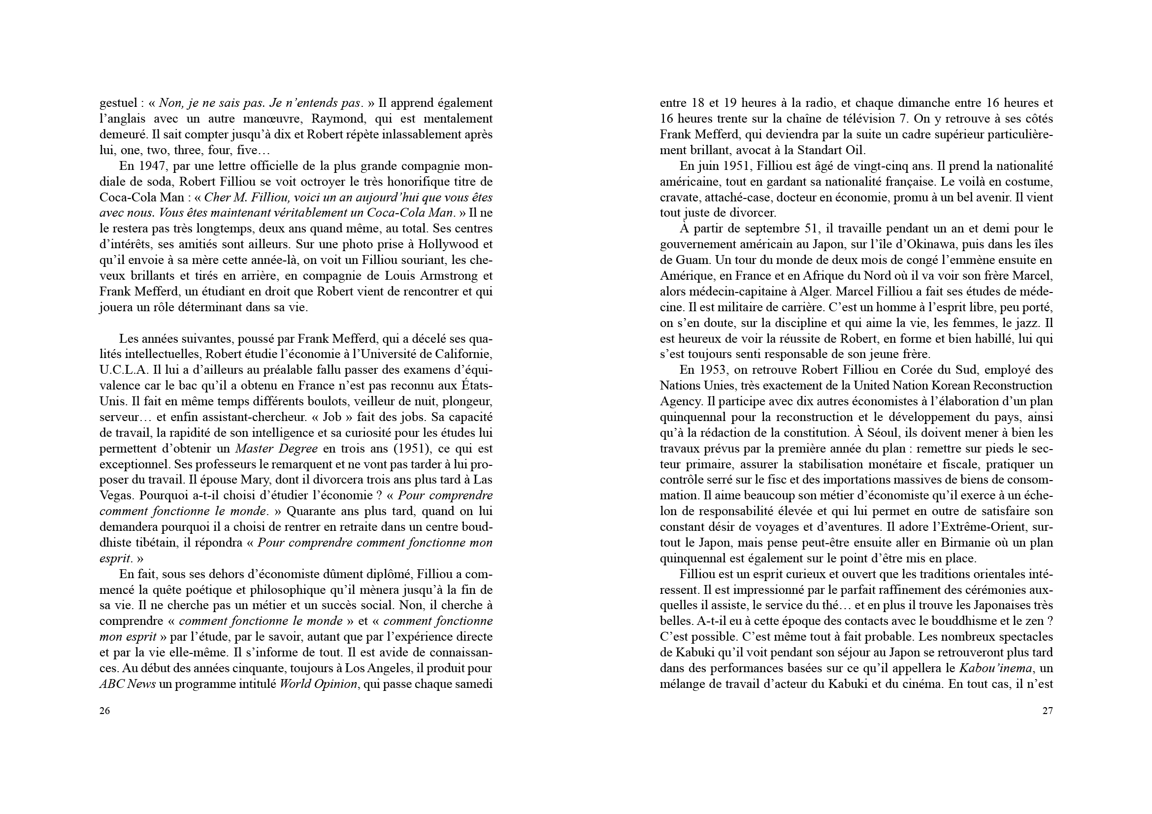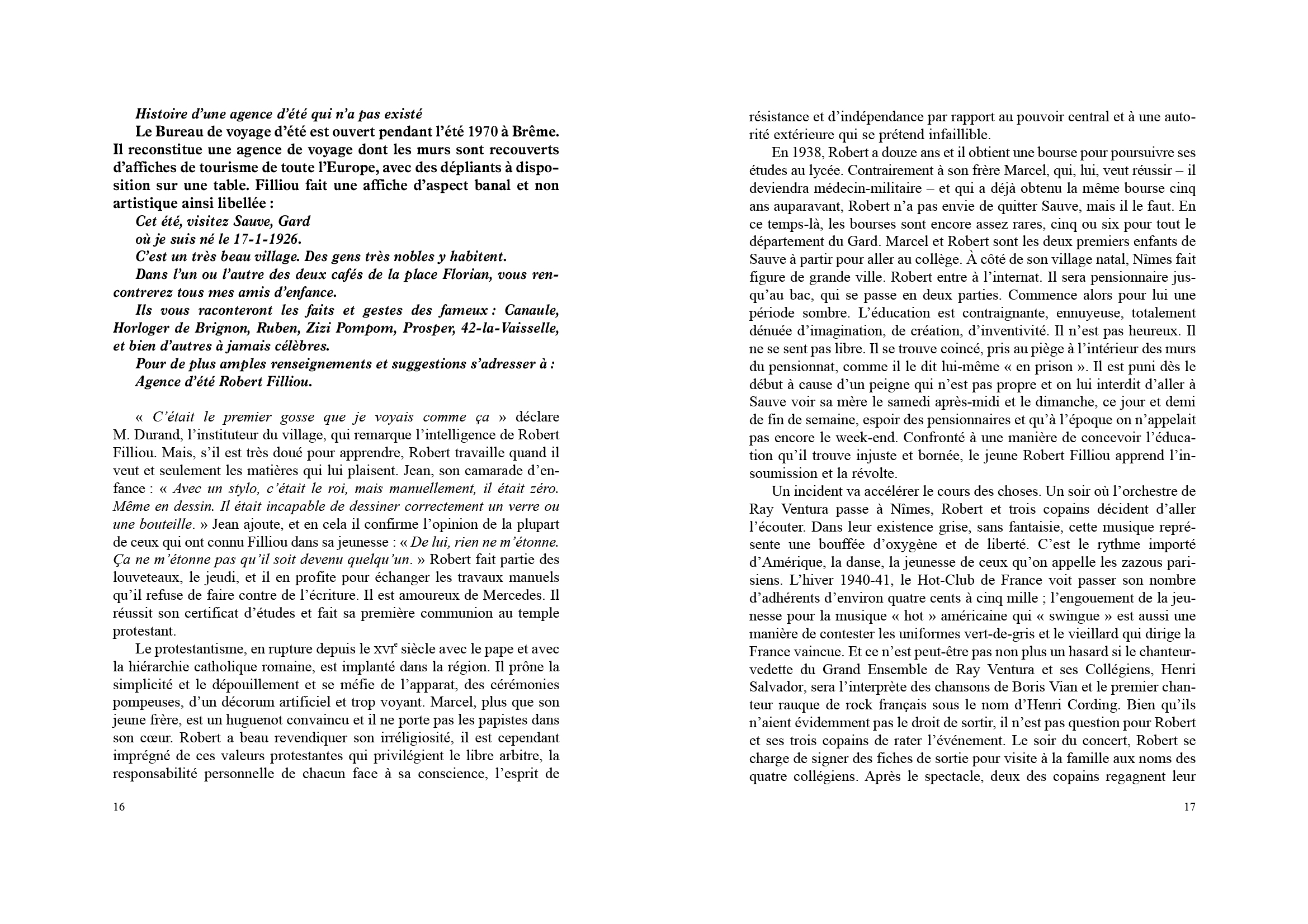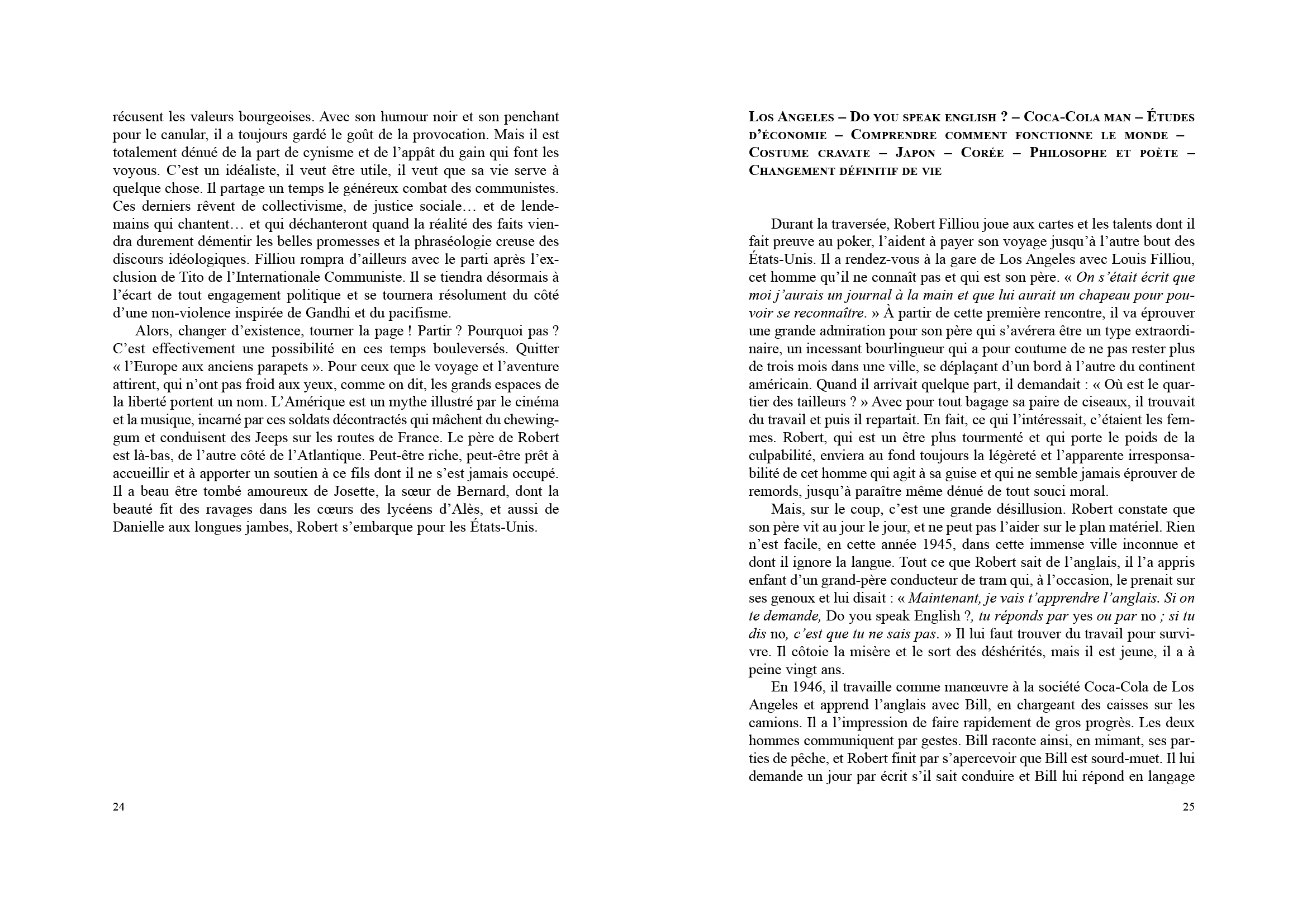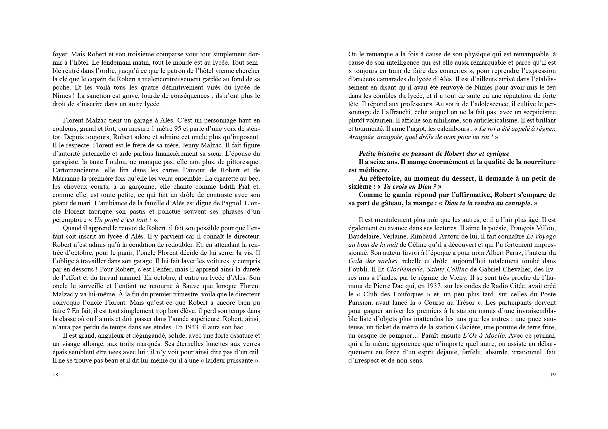 Cette biographie est conçue comme une suite de scénarios qui évoquent avec simplicité les aventures de Robert le sage, de Robert le fou, de Robert l'ami, de Robert bouddha.