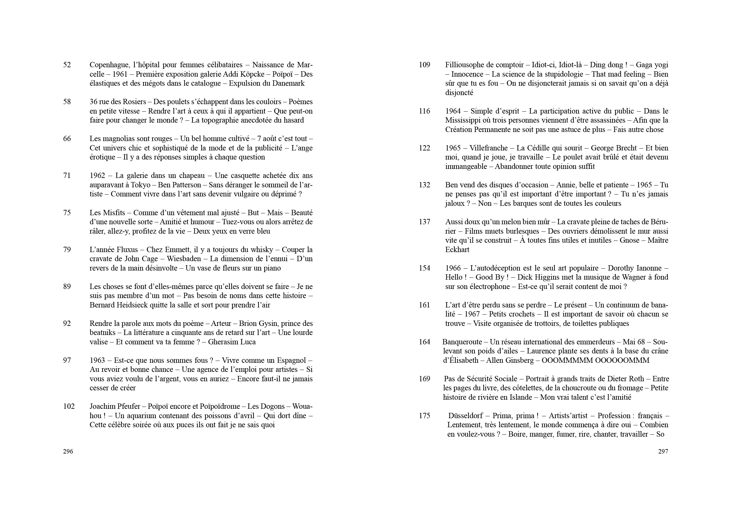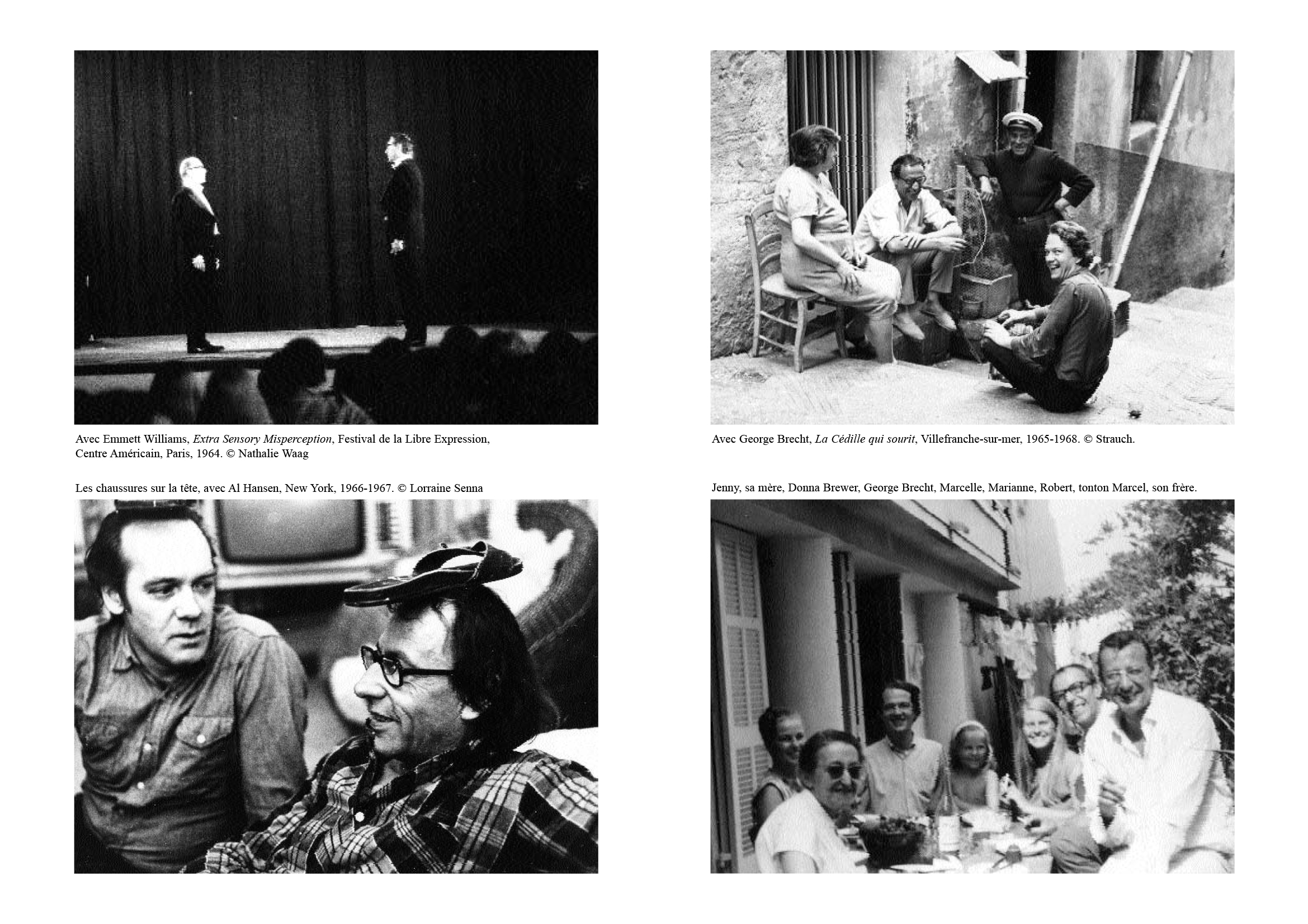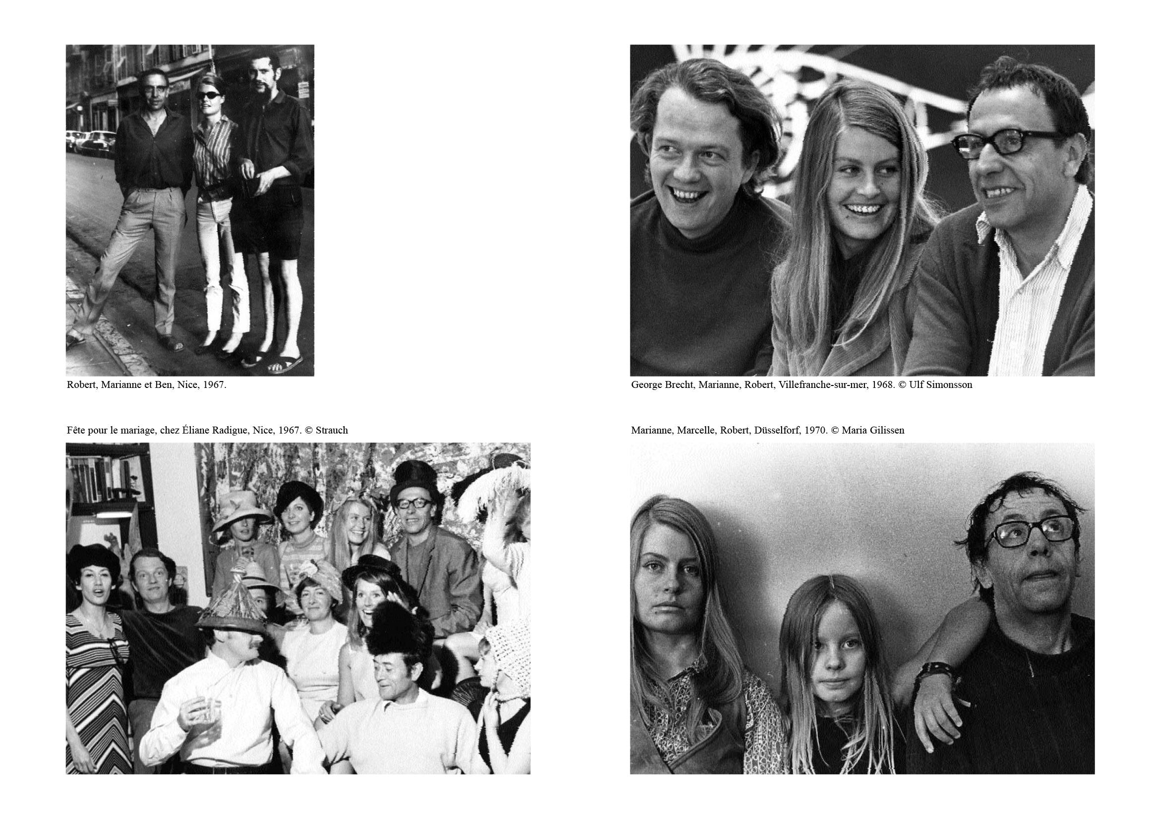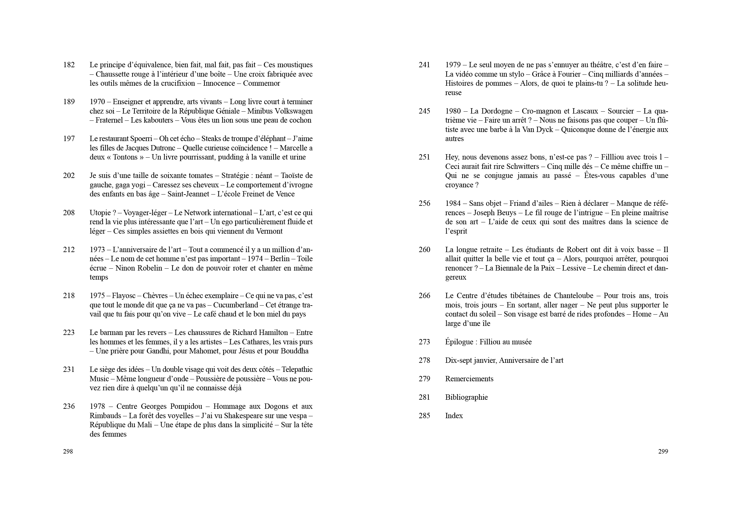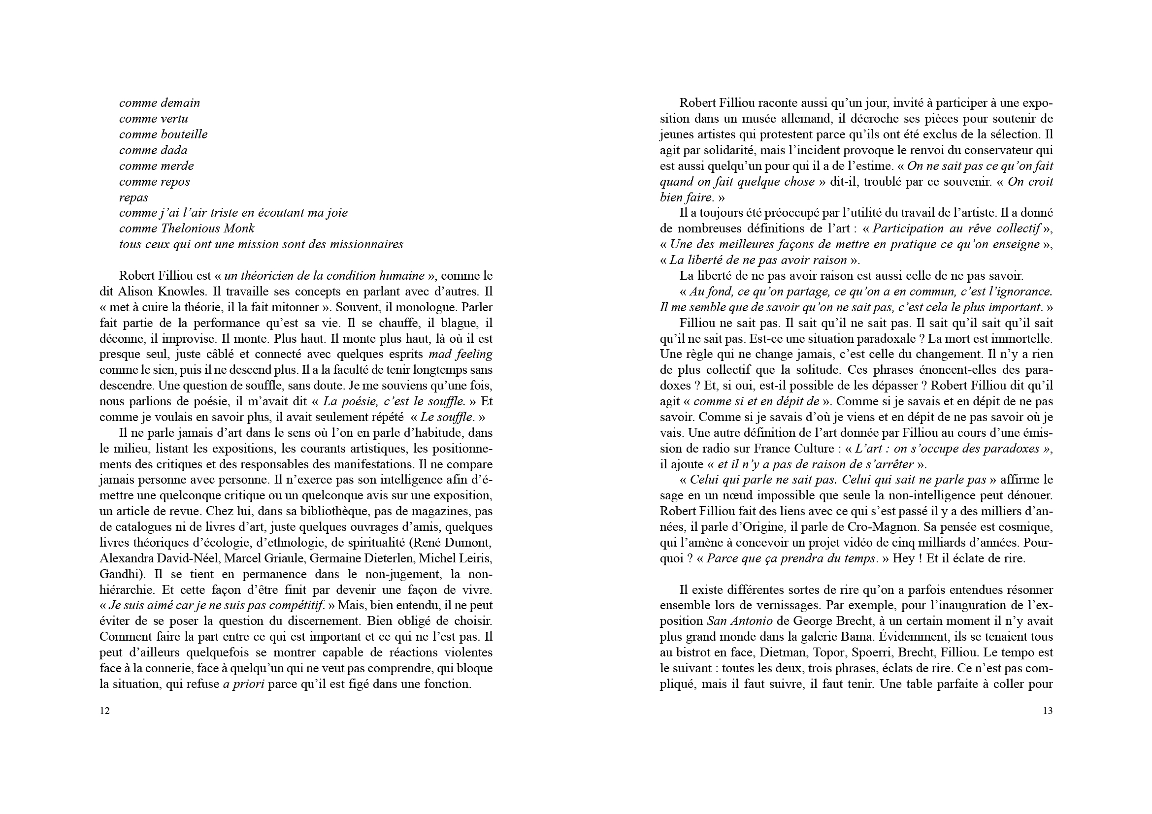 Beuys) Teaching and Learning as Performing Arts (une nouvelle pratique et théorie de l'enseignement), Économie poétique, Musique télépathique, Cucumberland, Recherches en futurologie… Taoïste de gauche, gaga, yogi, Robert Filliou est l'artiste des poètes et le poète des artistes ; il a consacré sa vie aux échanges permanents avec Emmet Williams,