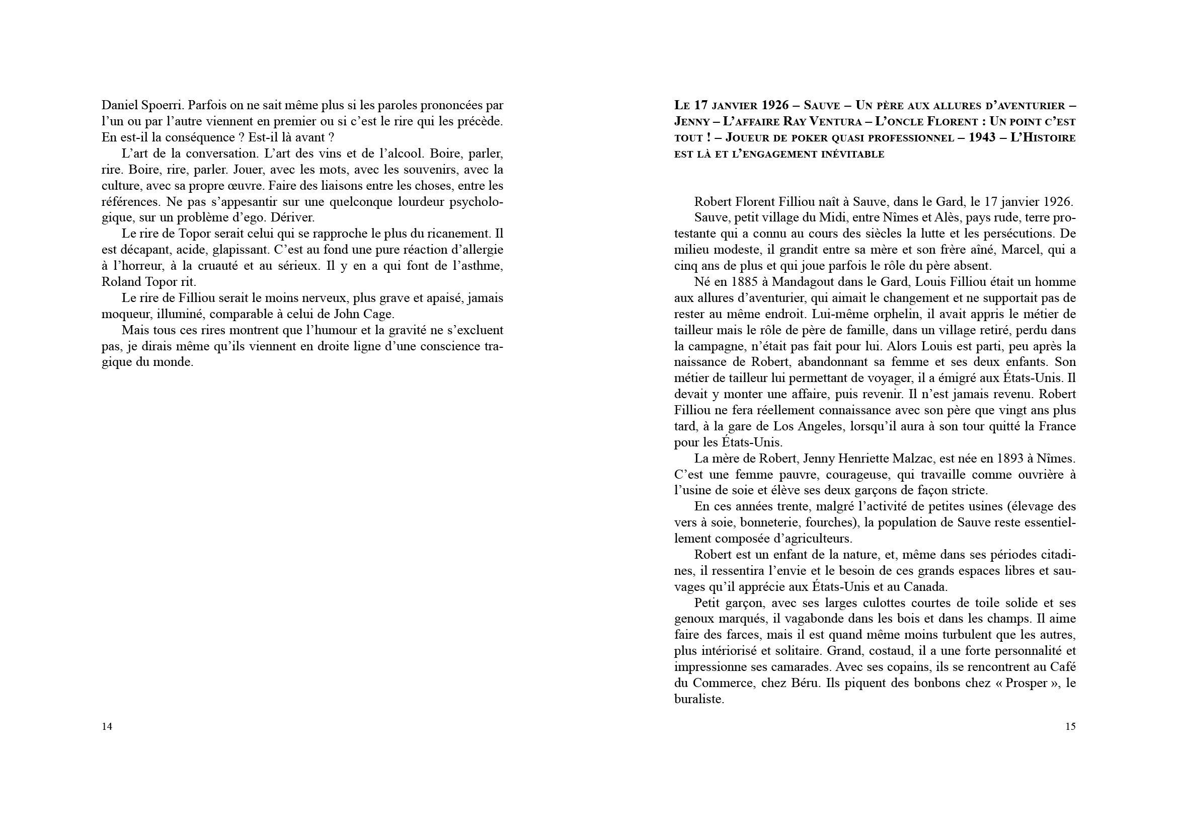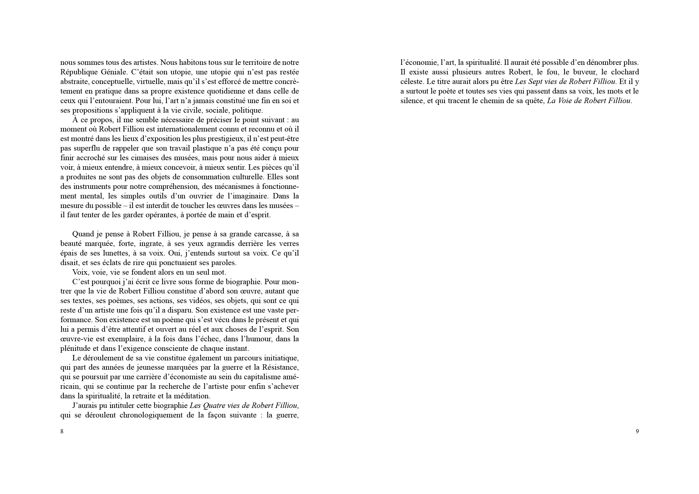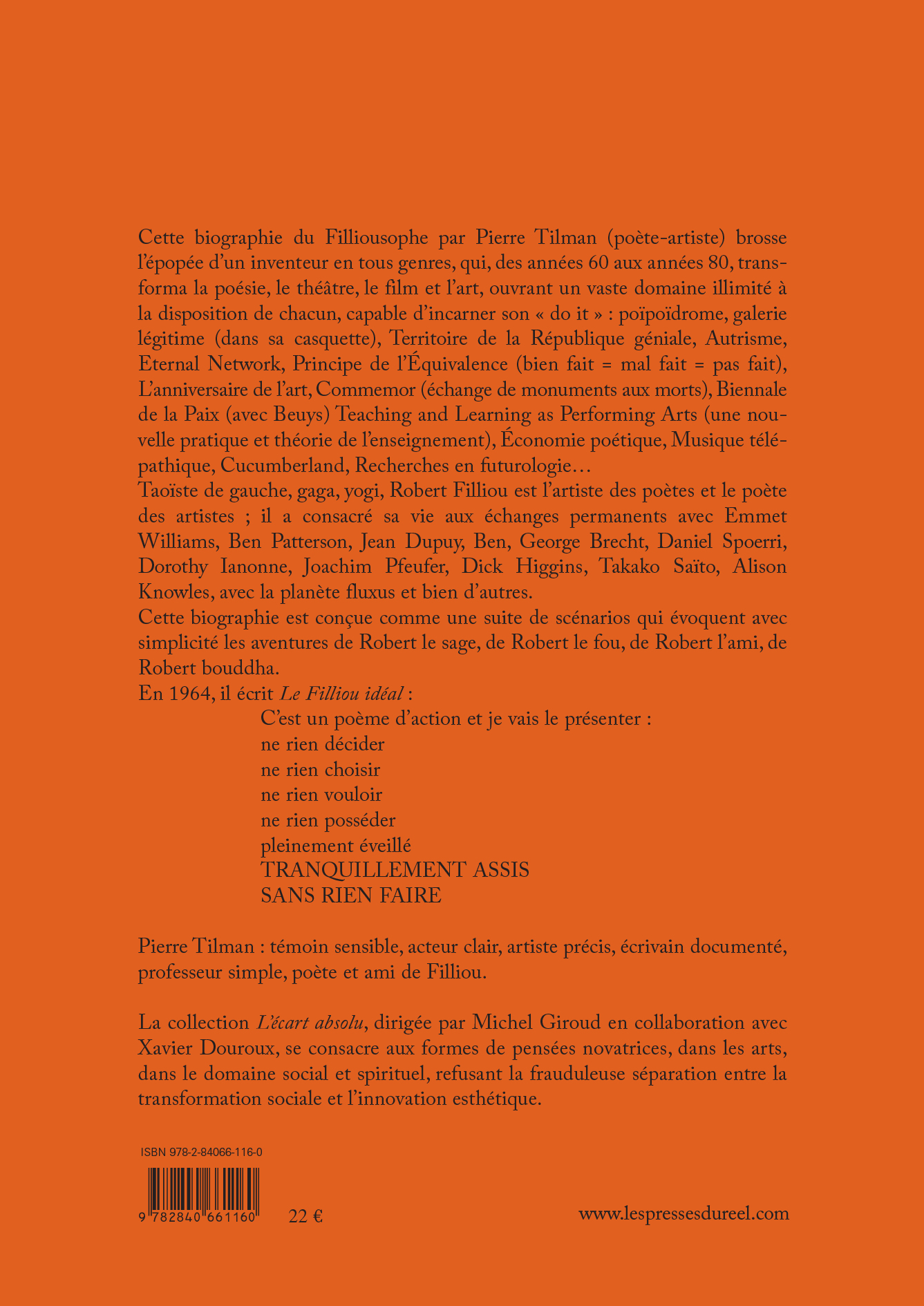 Cette biographie du Filliousophe par Pierre Tilman (poète-artiste) brosse l'épopée d'un inventeur en tous genres, qui, des années 60 aux années 80, transforma la poésie, le théâtre, le film et l'art, ouvrant un vaste domaine illimité à la disposition de chacun, capable d'incarner son « do it » : poïpoïdrome, galerie légitime (dans sa casquette), Territoire de la République géniale, Autrisme, Eternal Network, Principe de l'Équivalence (bien fait = mal fait = pas fait), L'anniversaire de l'art, Commemor (échange de monuments aux morts), Biennale de la Paix (avec