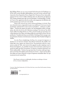 Karl Philipp Moritz est un acteur essentiel de la formation de l'esthétique au XVIIIe siècle comme discipline philosophique, mais aussi comme recherche expérimentale et lieu d'expression d'une critique d'art. Précurseur d'une vision pédagogique de l'art, il ancre le débat esthétique dans une dimension qui dépasse le strict champ artistique pour aller vers la psychologie et l'anthropologie. Car définir l'œuvre d'art appartient selon lui au plus vaste programme de définition des unités premières que sont le moi et le monde.